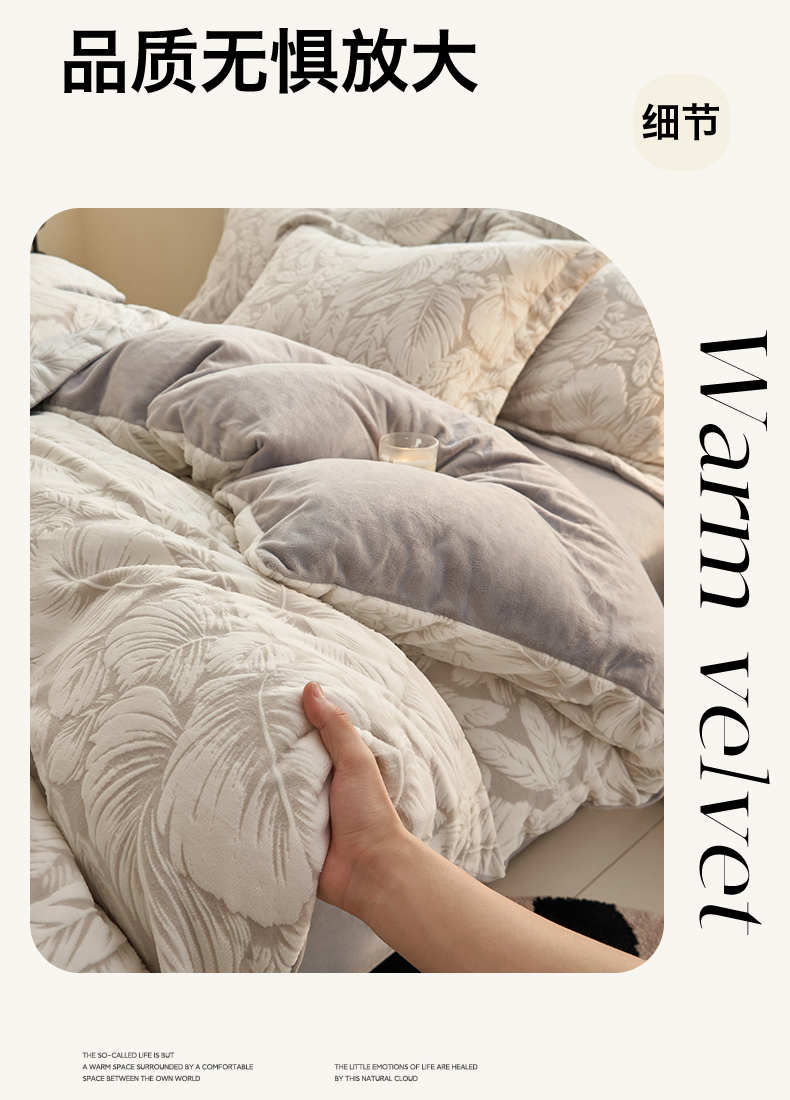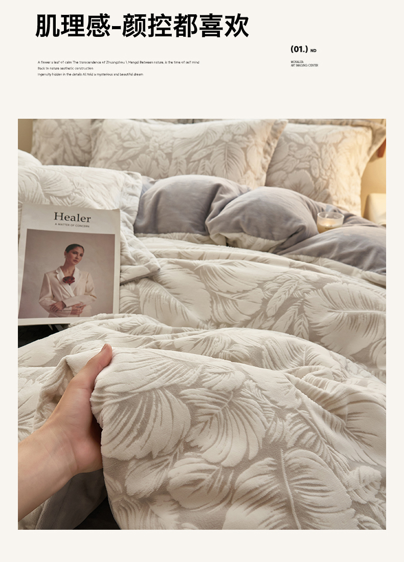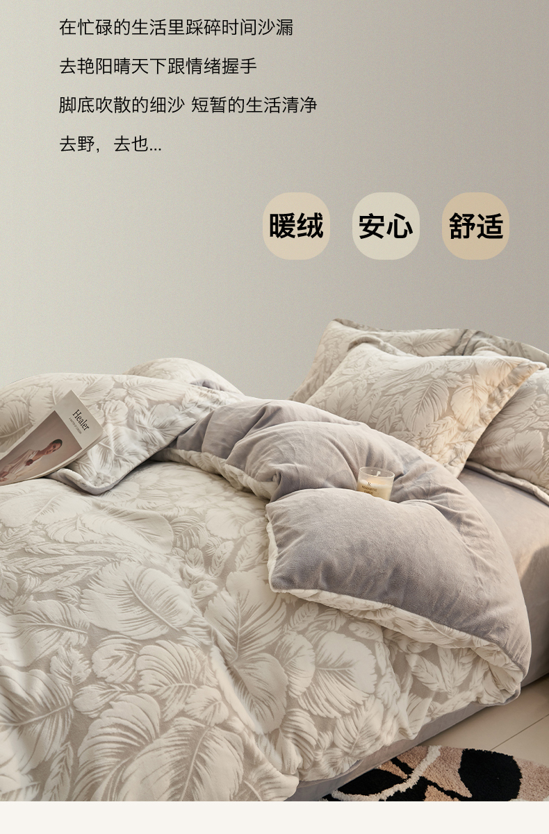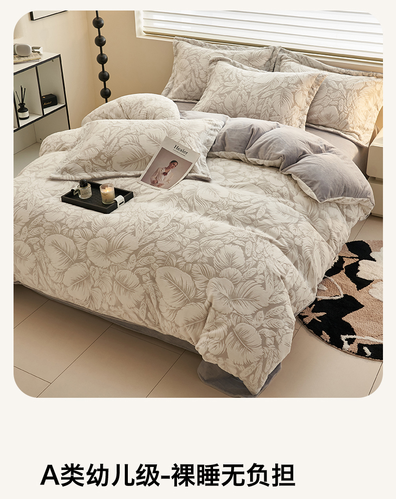 商品名称:恒爱家纺 2025新款牛奶绒立体剪花四件套 翩叶-灰