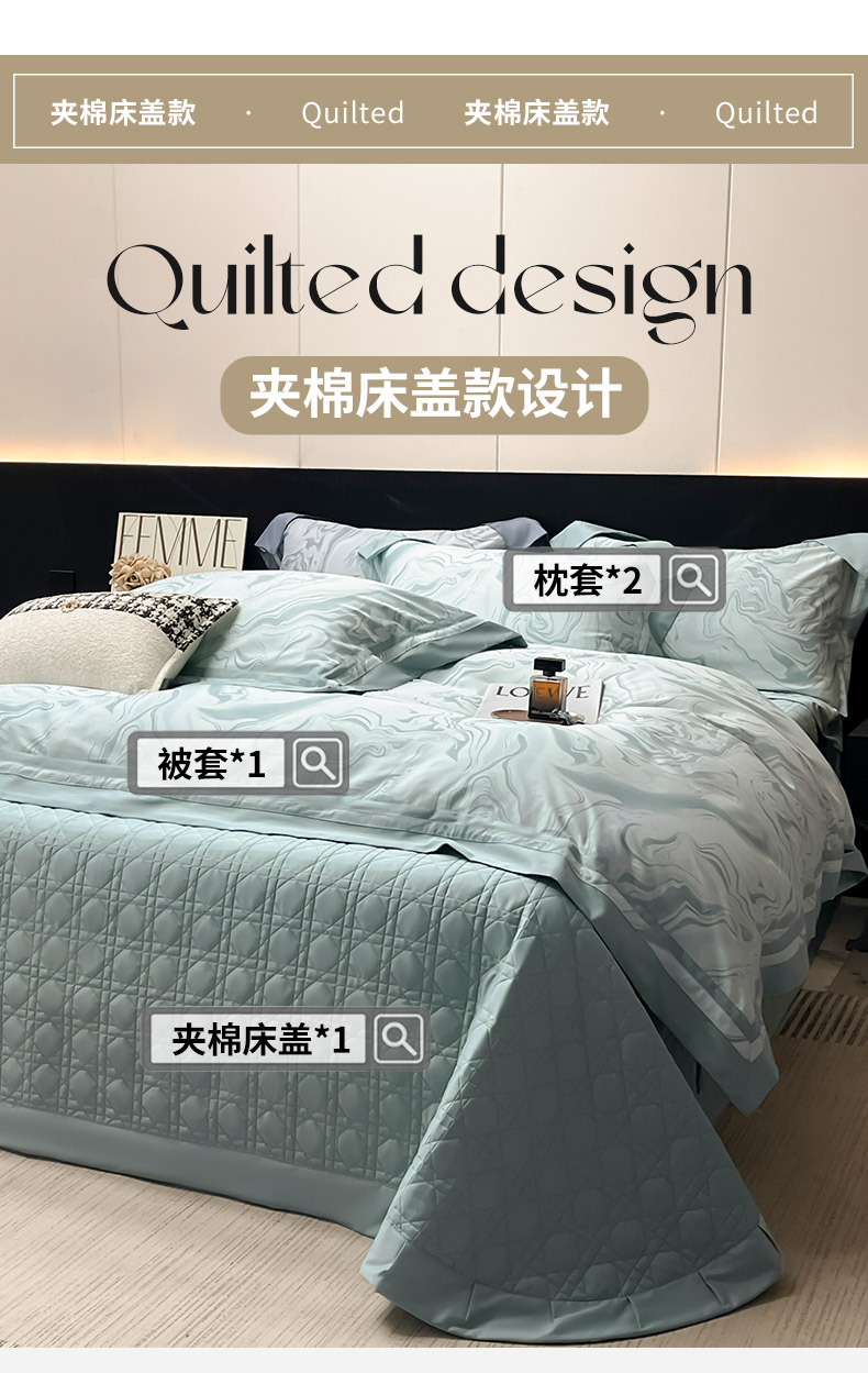 2025新款高端A类长绒棉夹棉床盖床笠四件套全棉纯棉纯色绗绣四季款保护罩高级感床上用品 时漫-月石绿