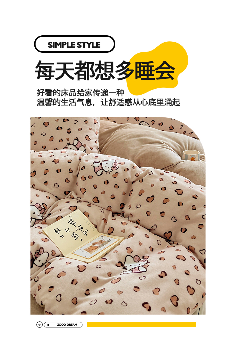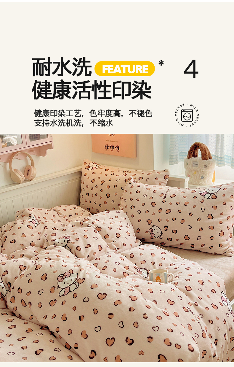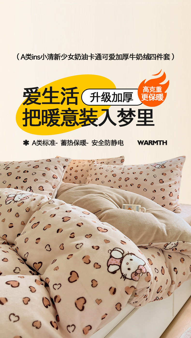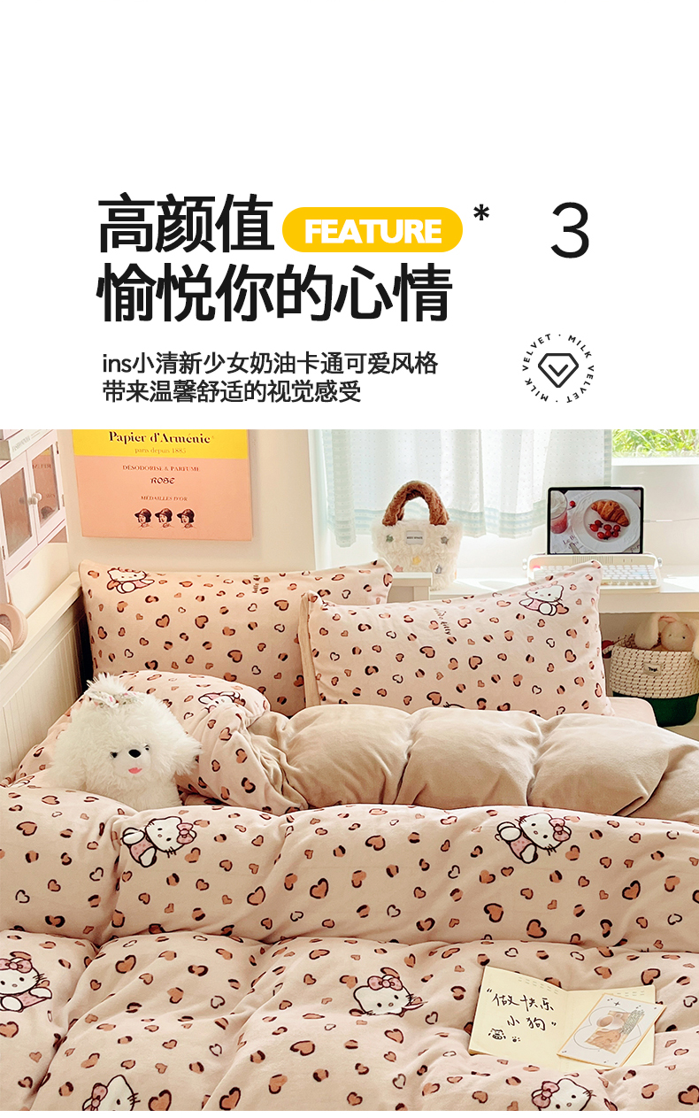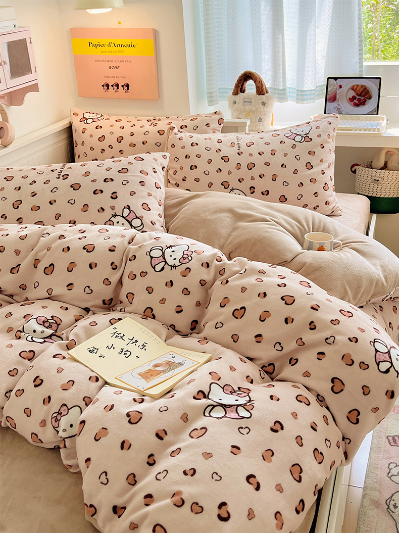 商品名称:金爱家 2025新款A类ins小清新少女奶油卡通可爱加厚牛奶绒四件套 绒-豹纹心心猫咖