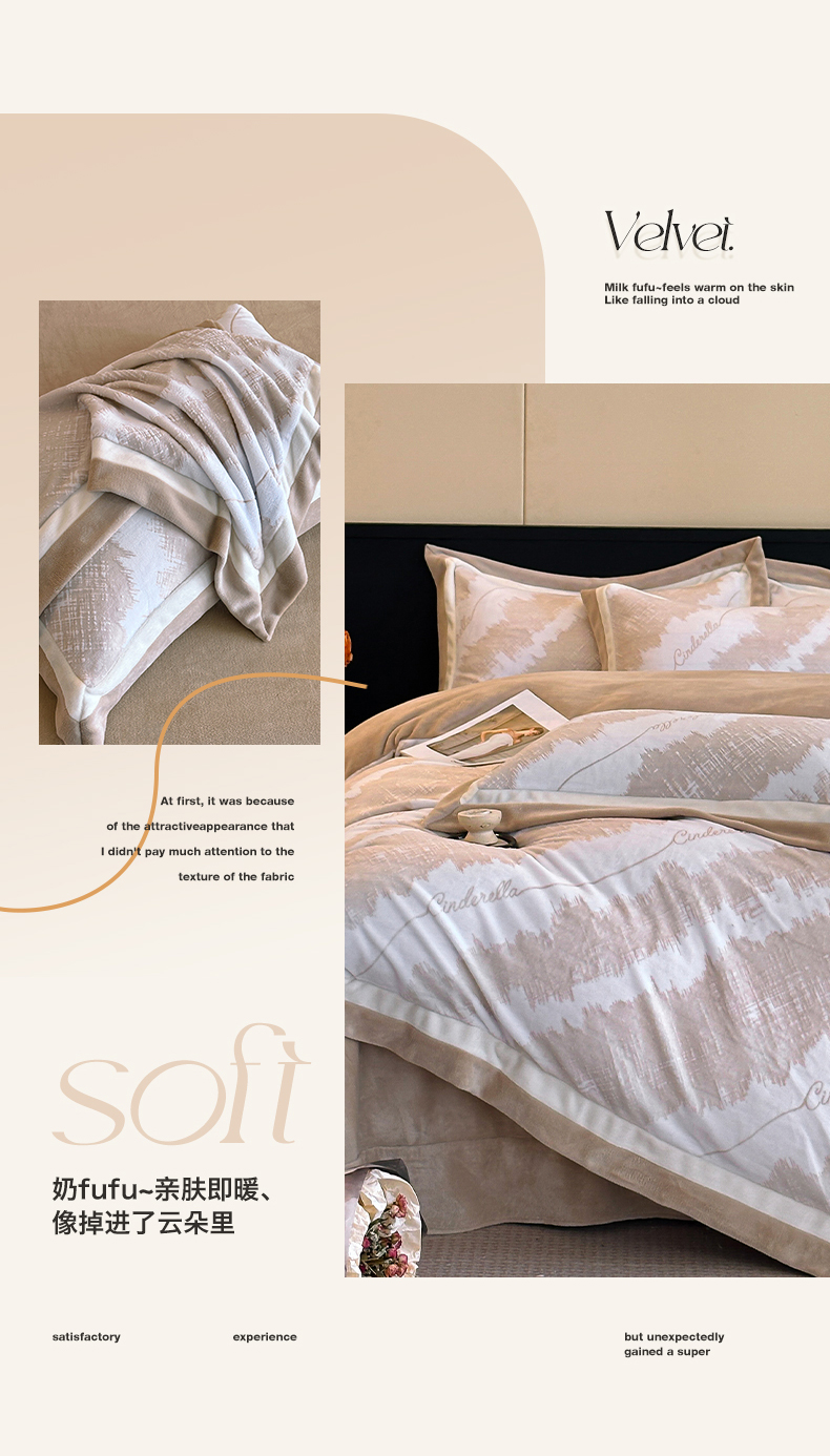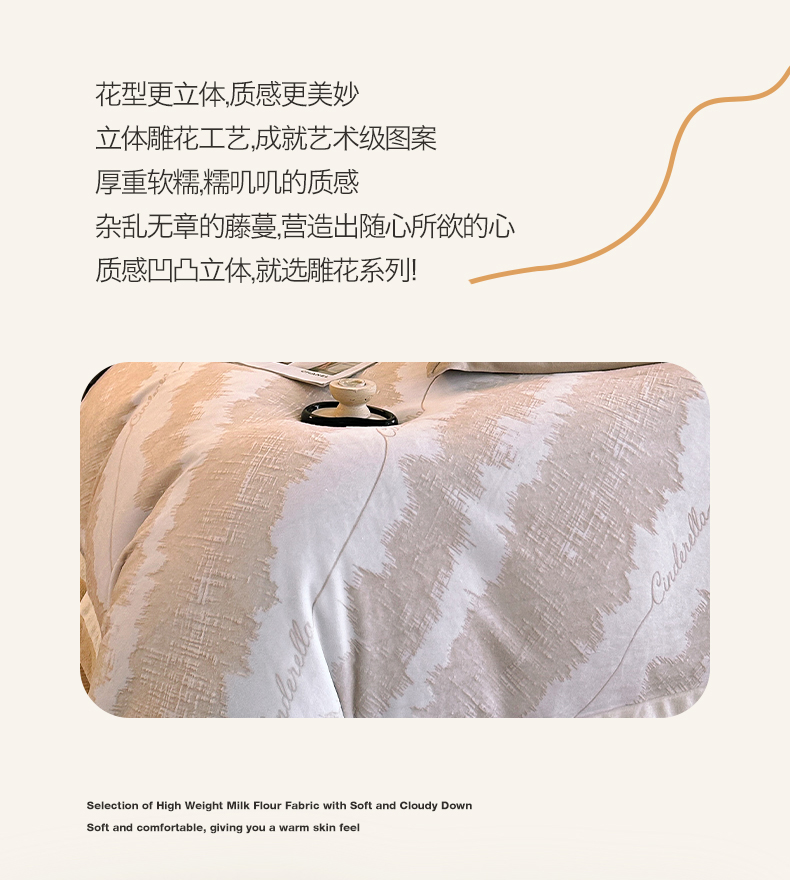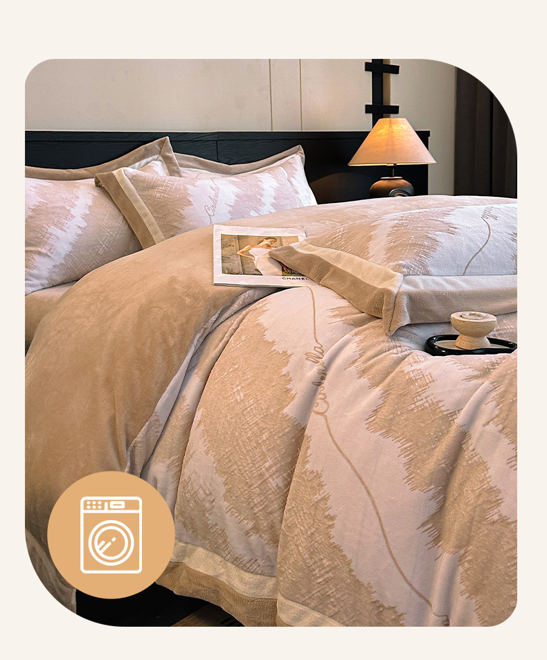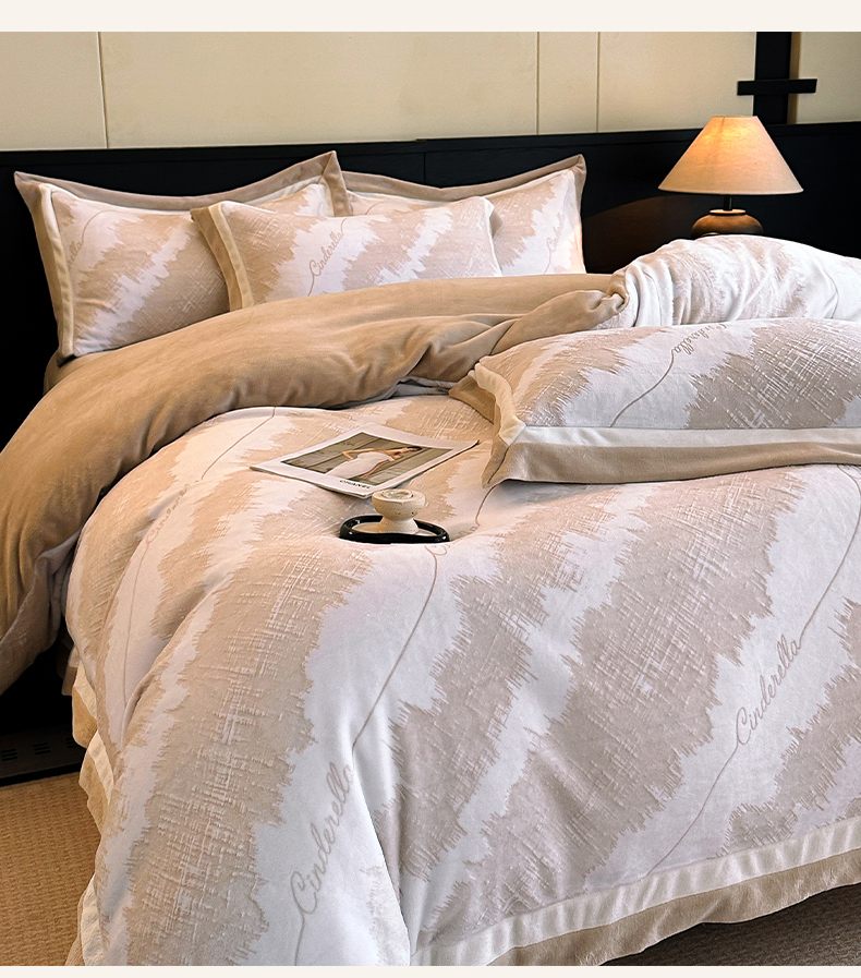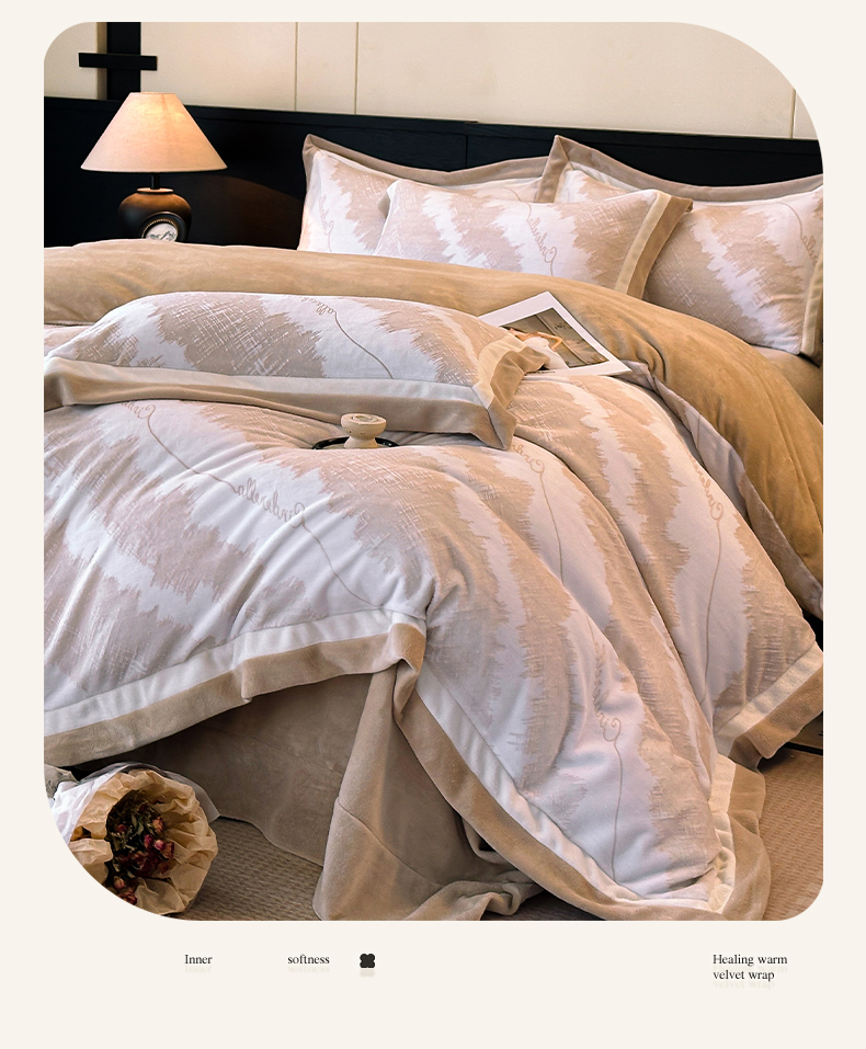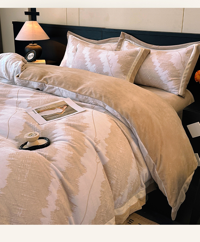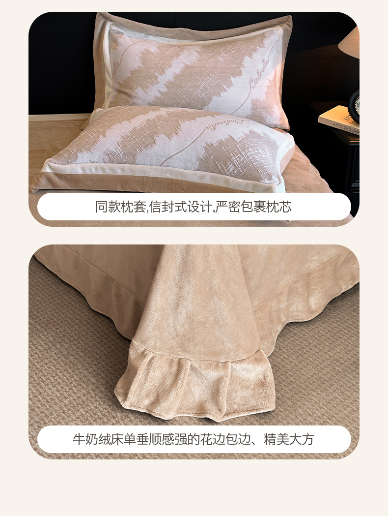 绘萱家居 2025新品热款高密消光双拼边雕花牛奶绒四件套拼角纯色 意境-咖