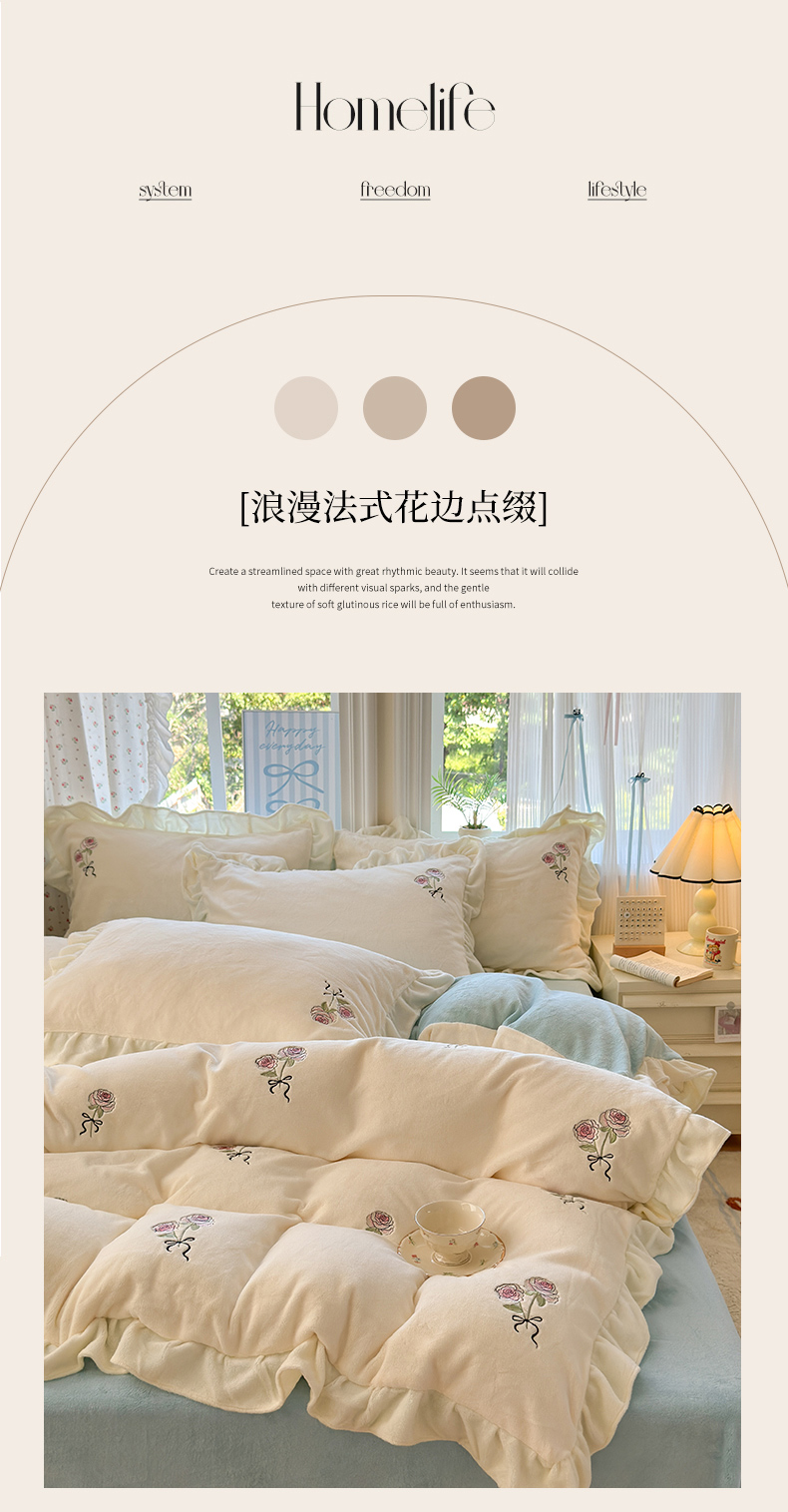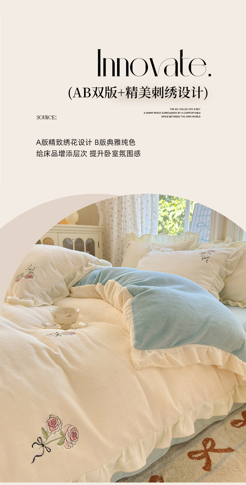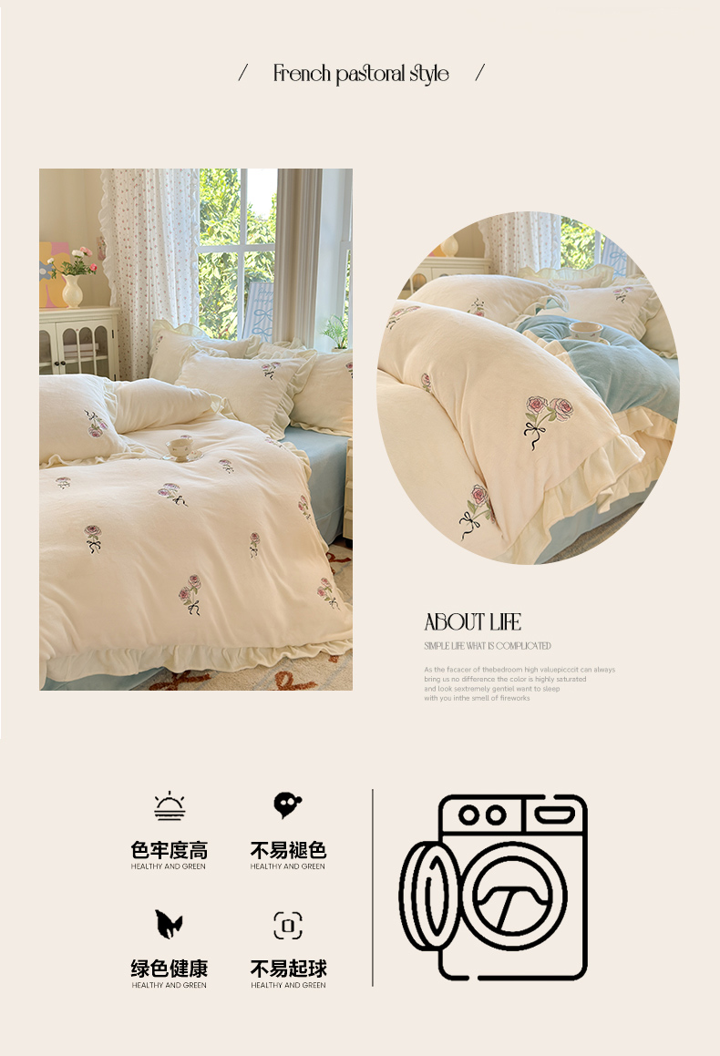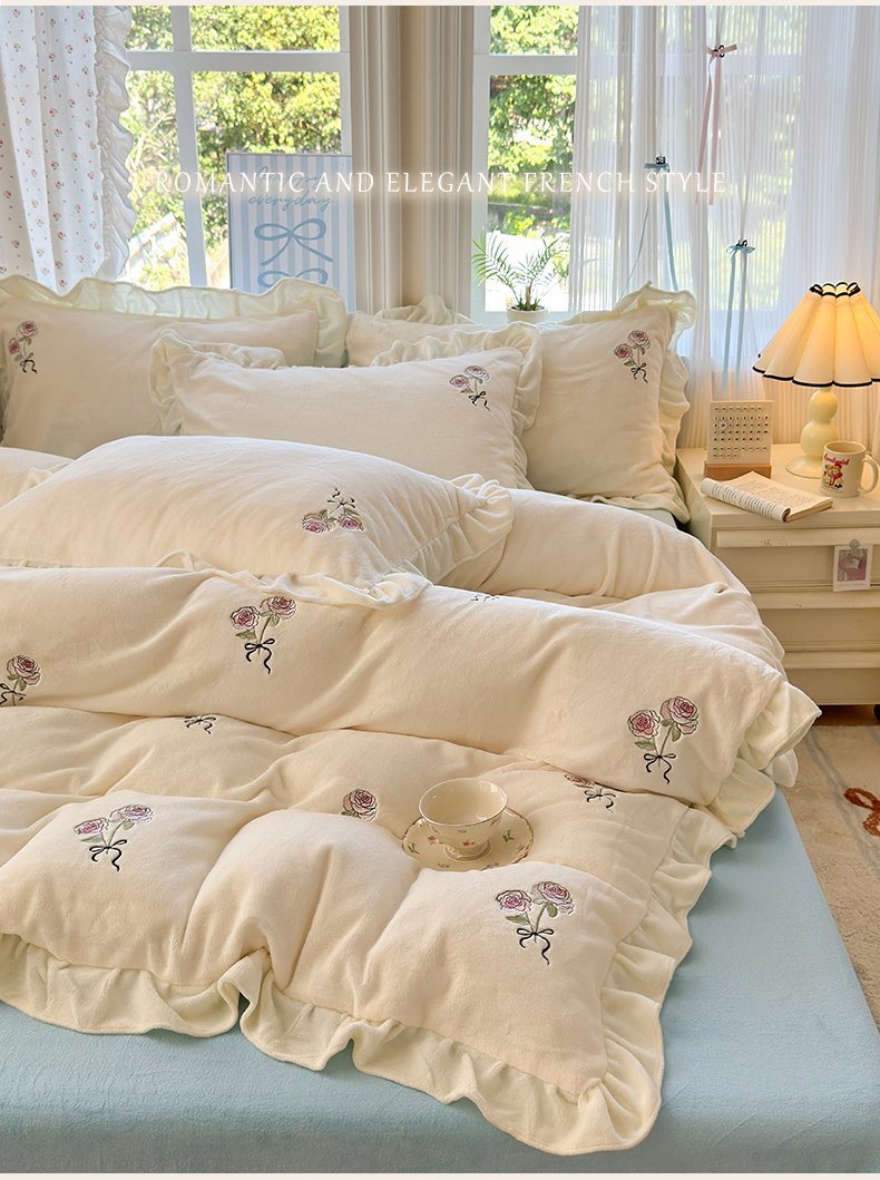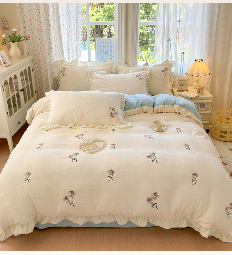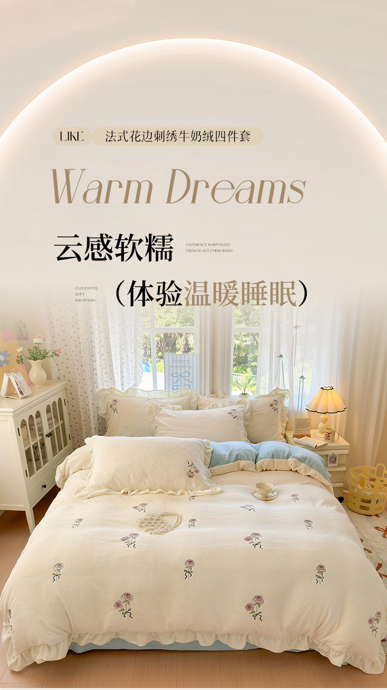 娜娜 2025新款法式花边刺绣牛奶绒四件套 云间玫瑰白+繁星蓝