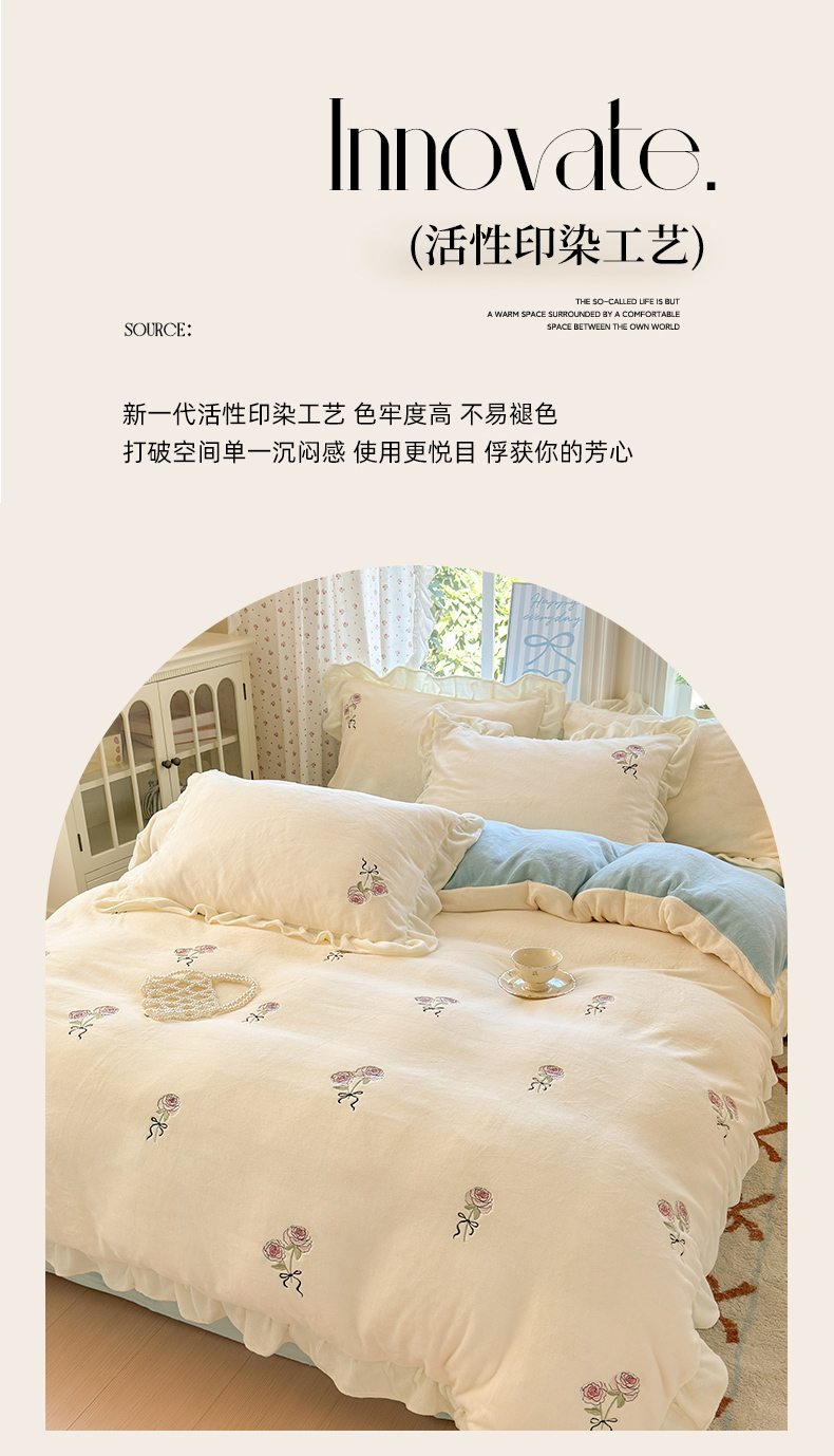 商品名称:娜娜 2025新款法式花边刺绣牛奶绒四件套 云间玫瑰白+繁星蓝