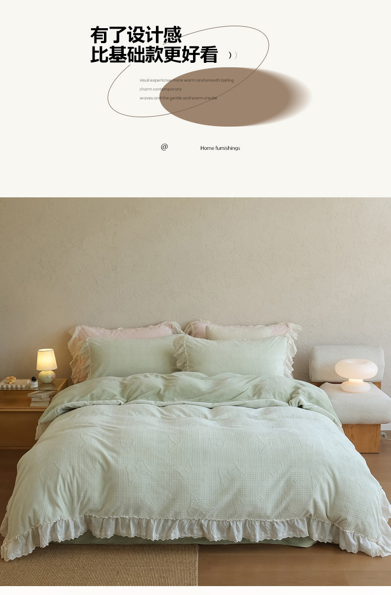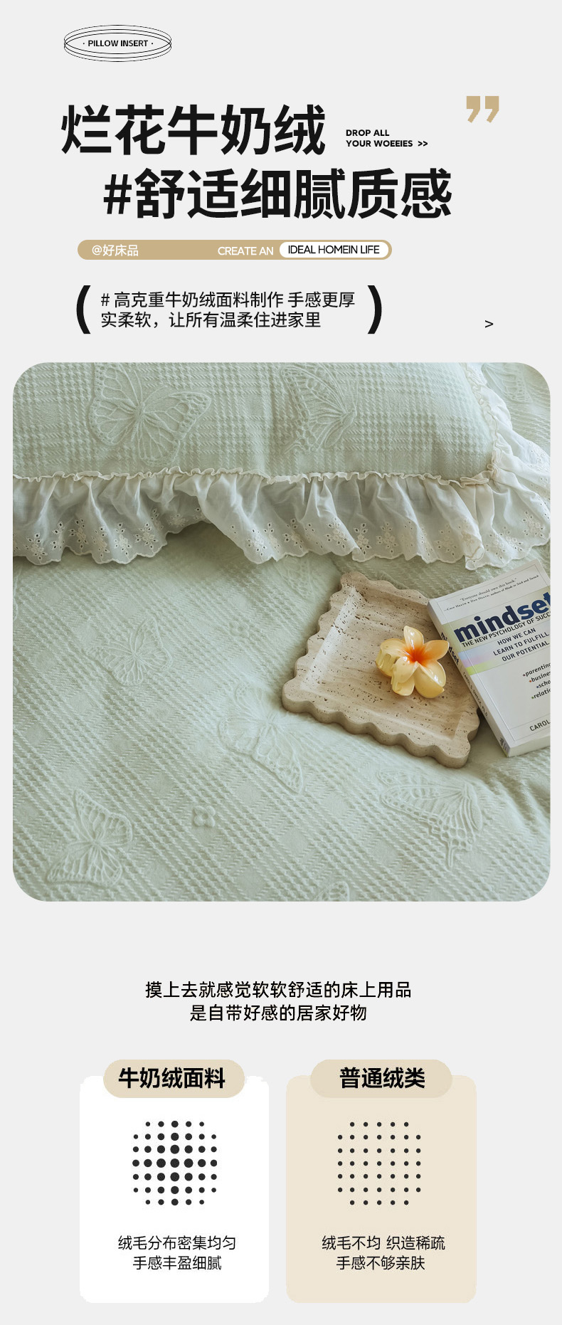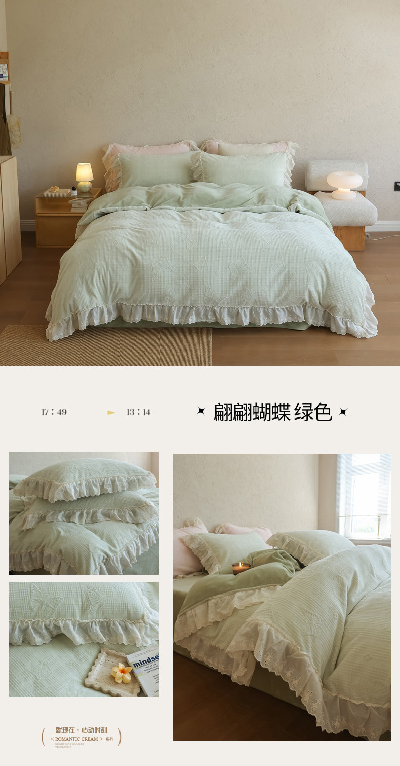 万盛家纺 2025新款韩版牛奶绒花边四件套-翩翩蝴蝶 翩翩蝴蝶 绿色