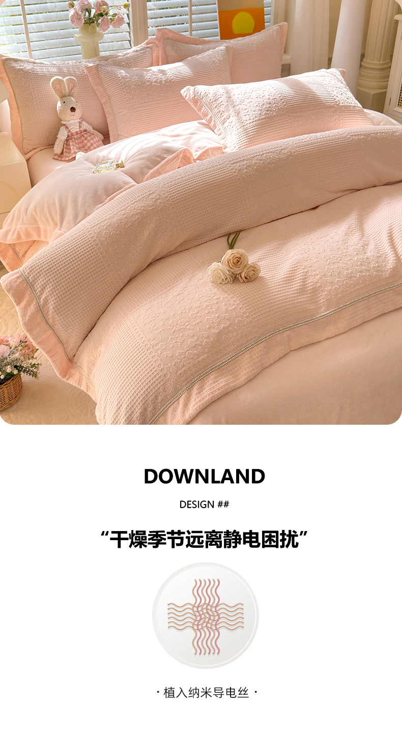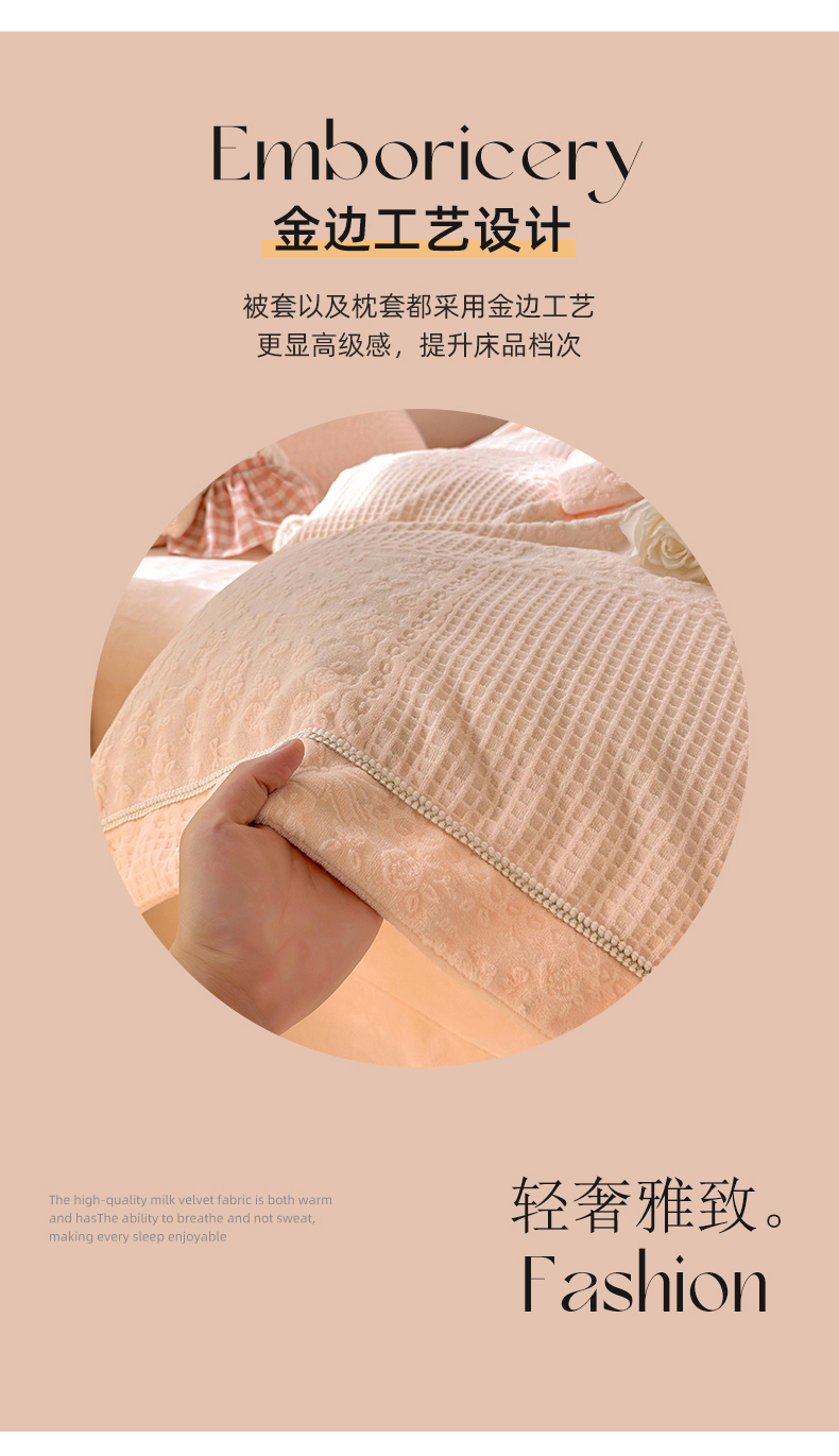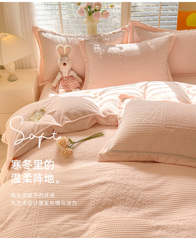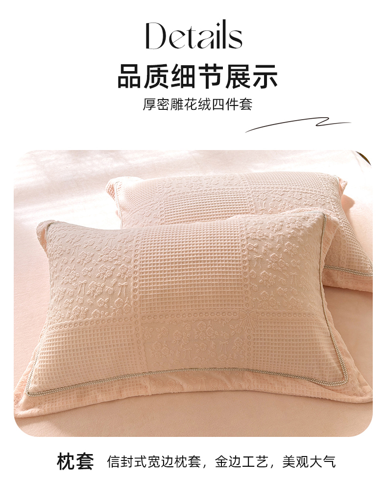 商品名称:艾唯希家纺 2025新款全消光雕花绒织带款四件套牛奶绒-雕花织带系列 玫瑰花语-粉