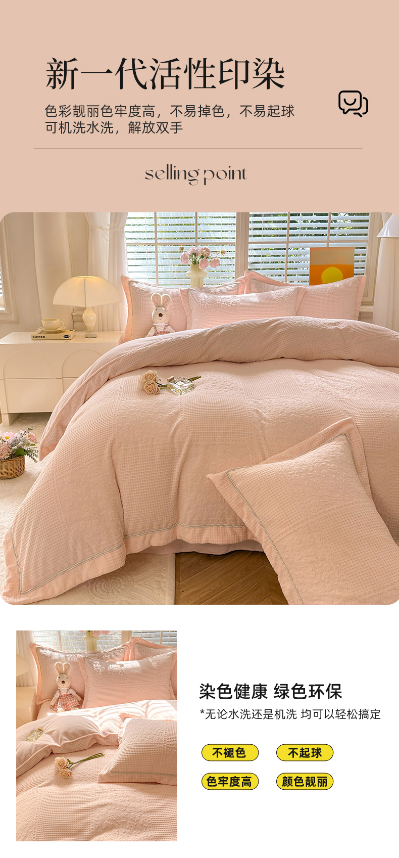 (总)艾唯希家纺 2025新款全棉纯棉色织小提花工艺四件套-开心兔系列,开心兔-粉,开心兔-灰