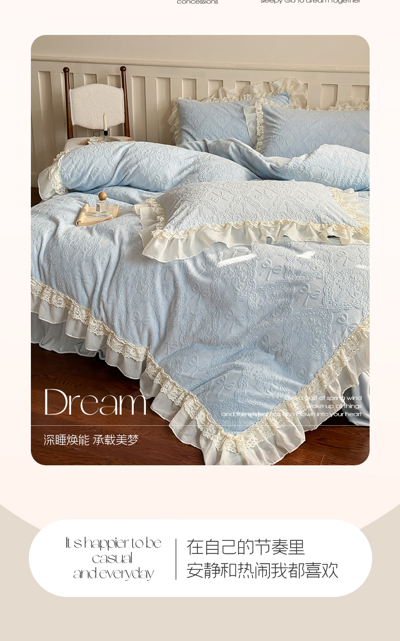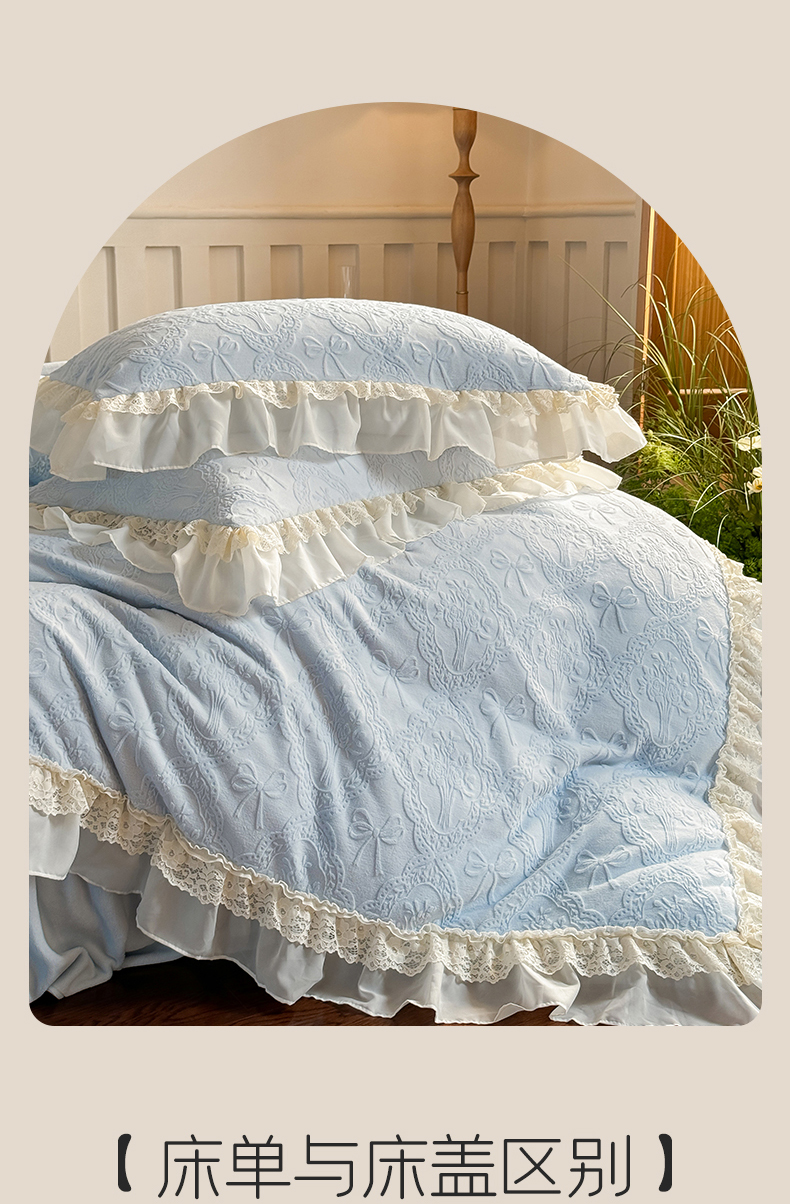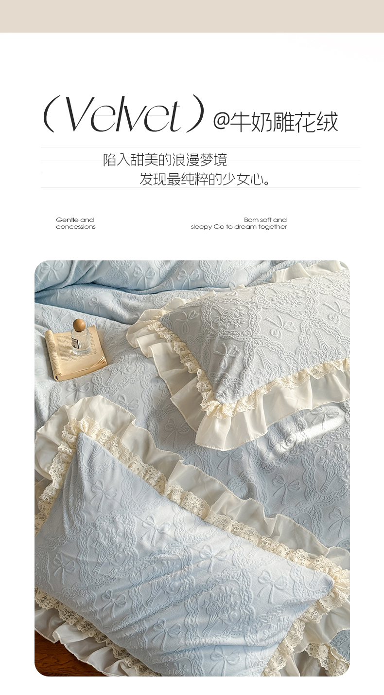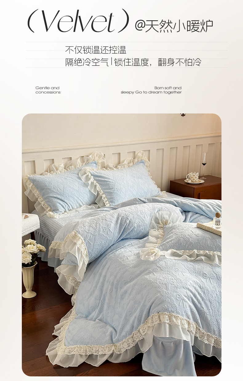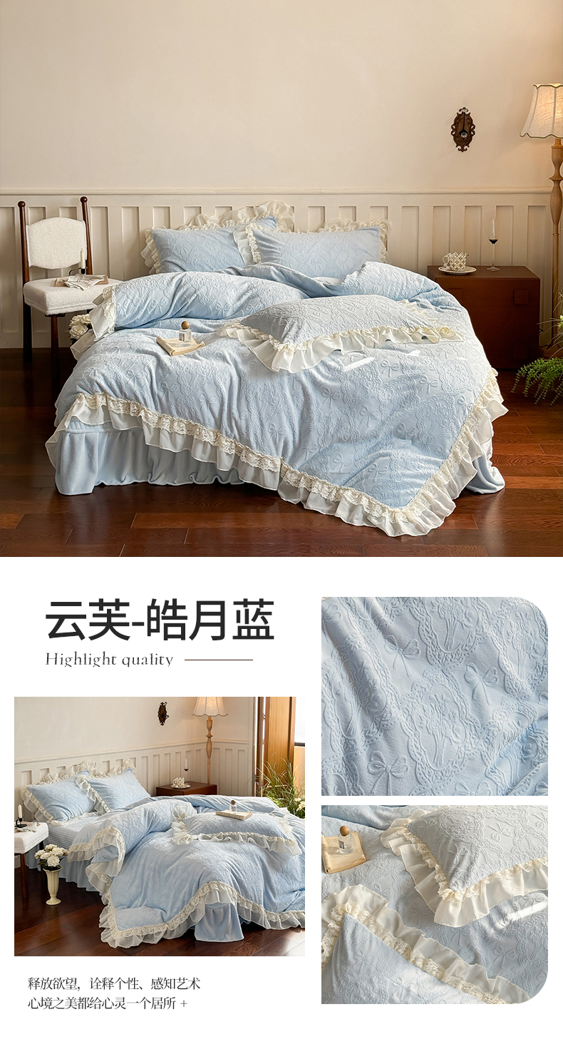 商品名称:满座家居 2025新款爆款全消光牛奶绒雕花四件套蕾丝花边仙女款床盖四件套-云芙 云芙-皓月蓝