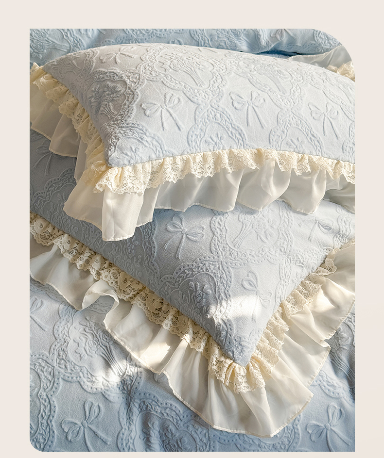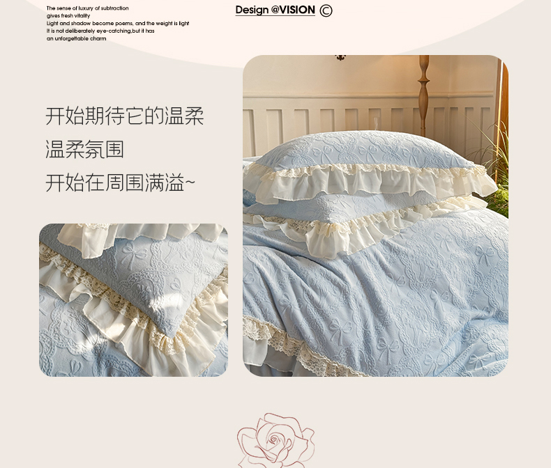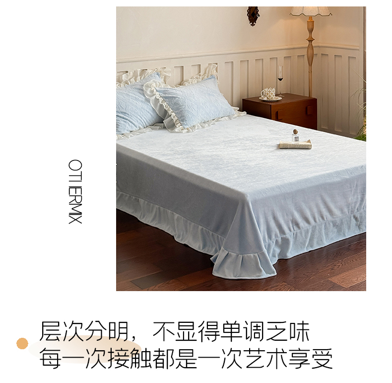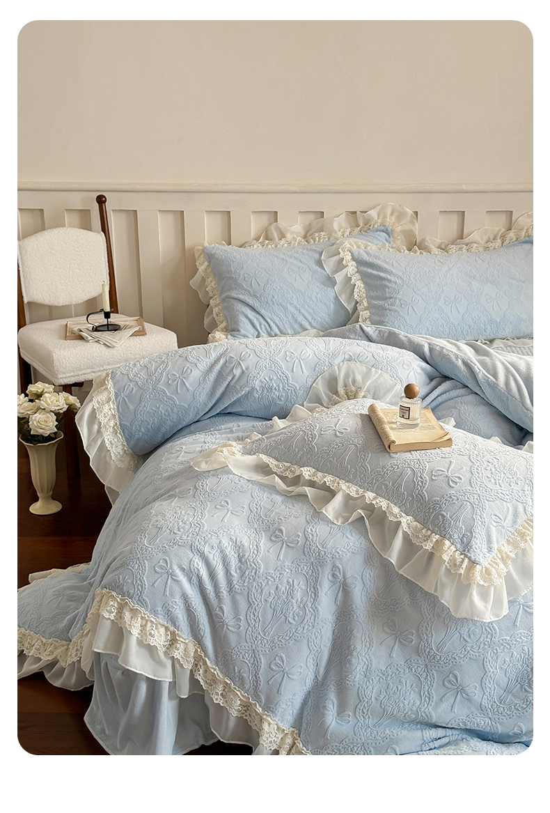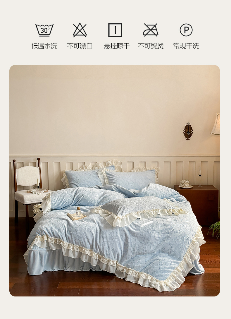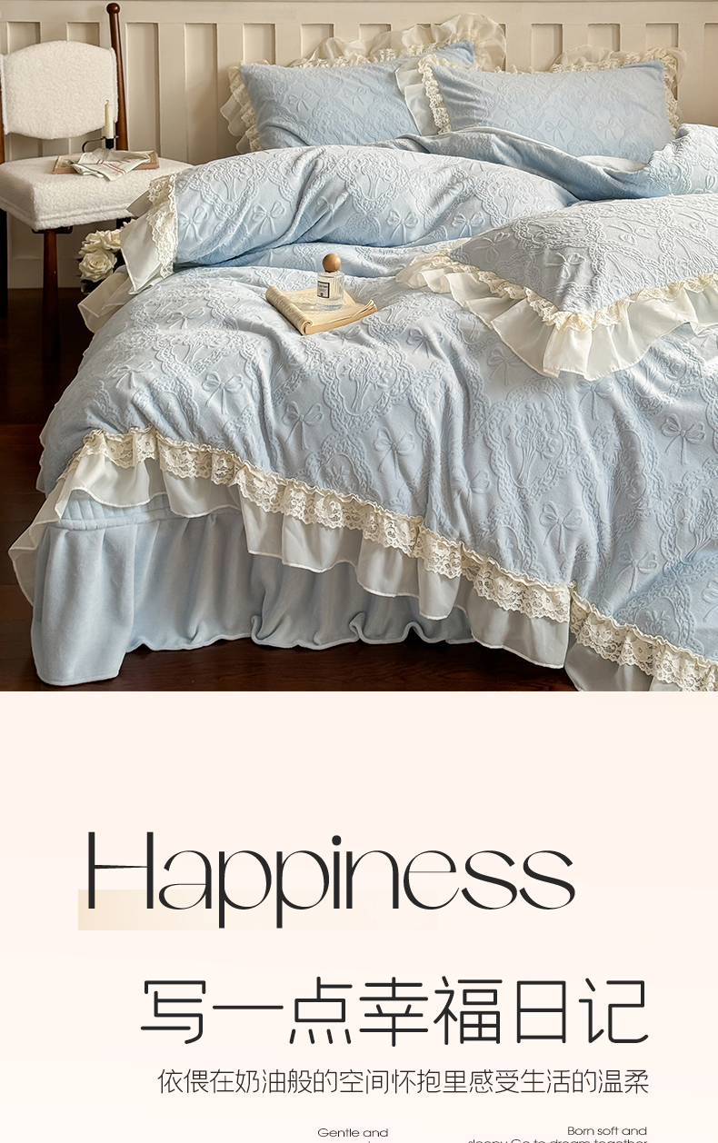 商品名称:满座家居 2025新款爆款全消光牛奶绒雕花四件套蕾丝花边仙女款床盖四件套-云芙 云芙-皓月蓝