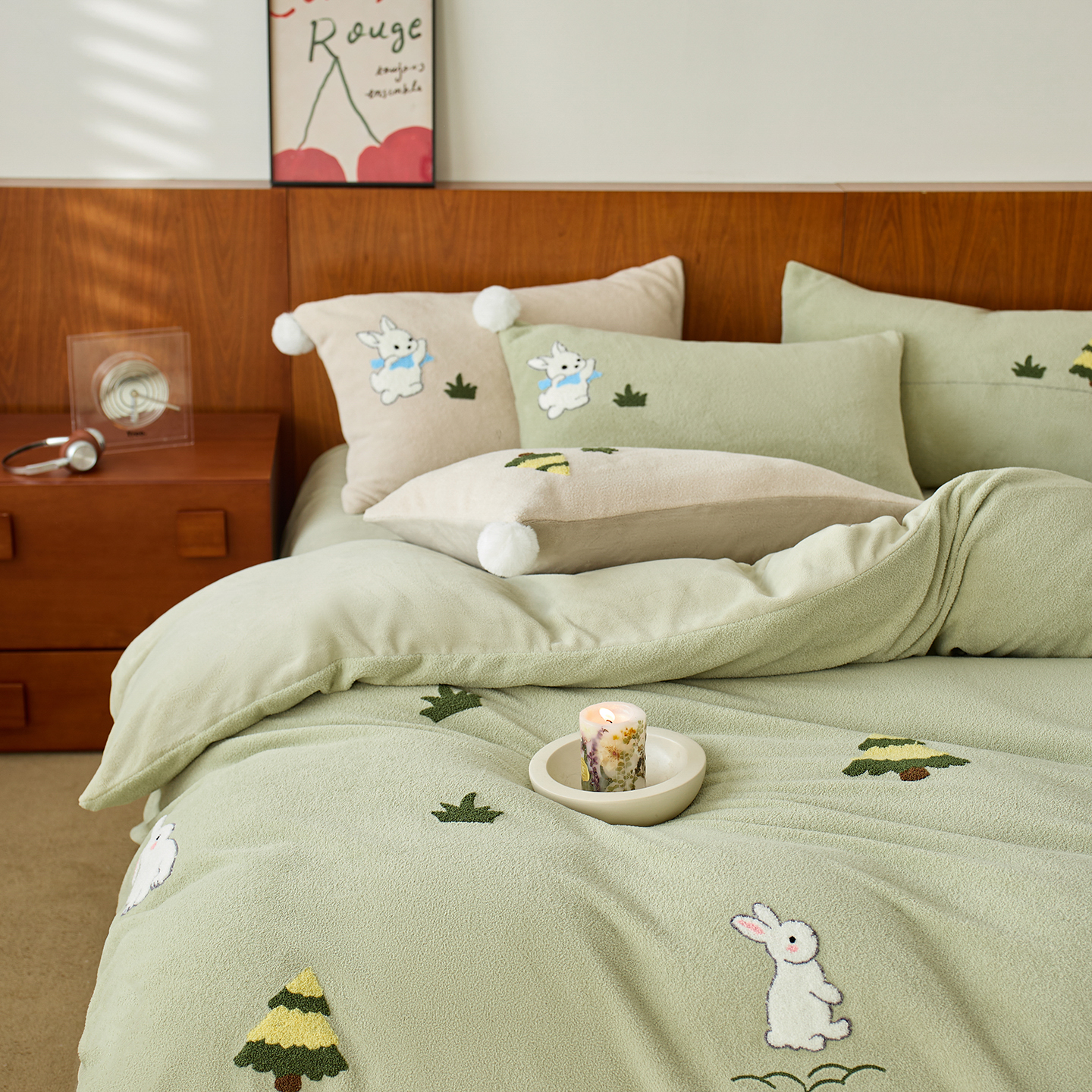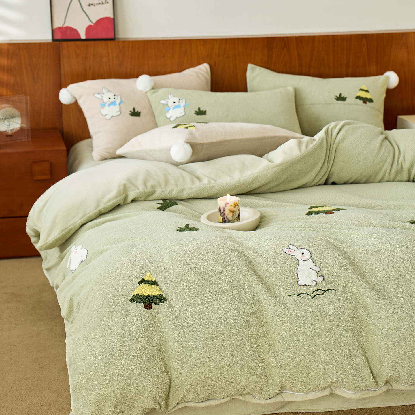 商品名称:蓝梦 2025新款全消光毛巾绣艾尼绒四件套-艾尼兔系列 豆蔻粉