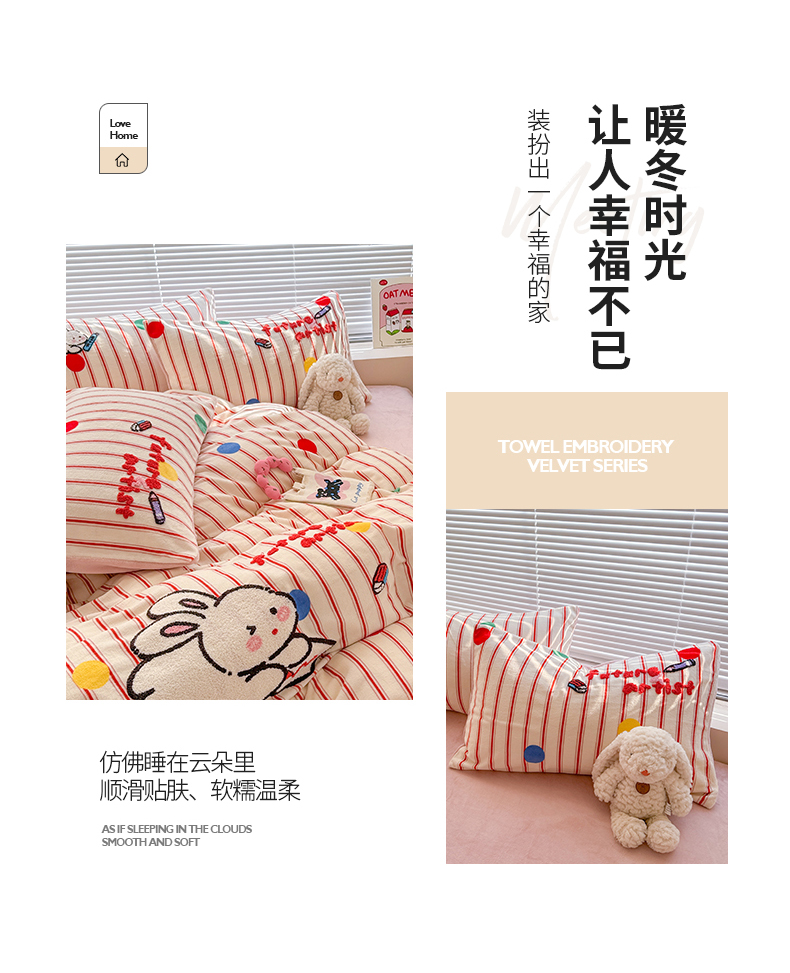 懒猫家纺 2025新款印花牛奶绒毛巾绣四件套 画画小兔