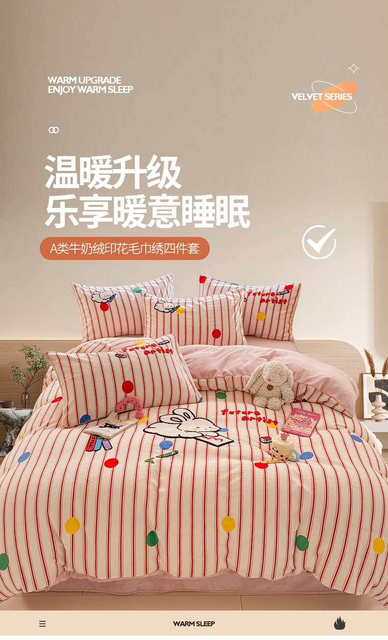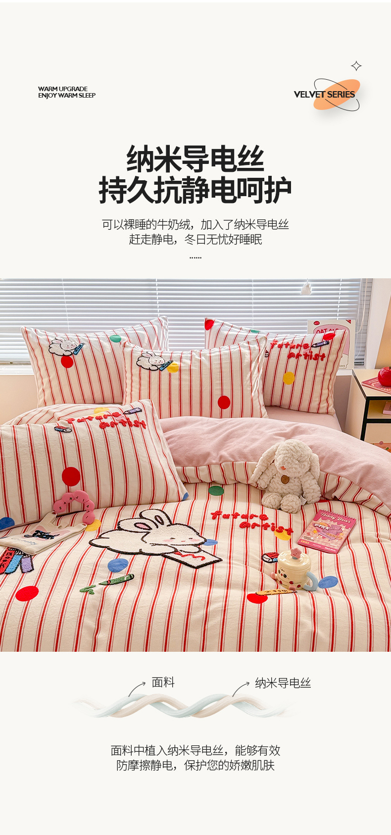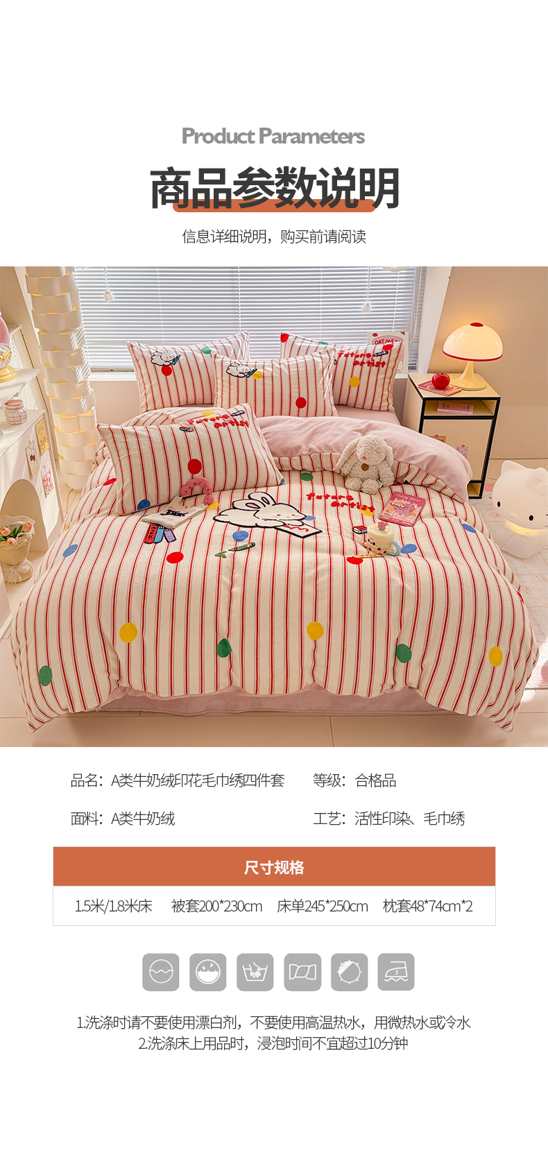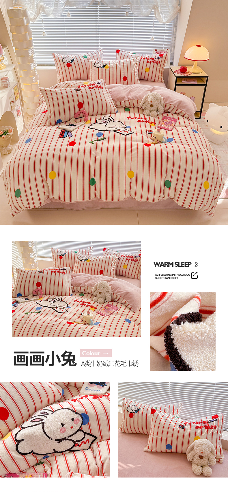 商品名称:懒猫家纺 2025新款印花牛奶绒毛巾绣四件套 画画小兔
