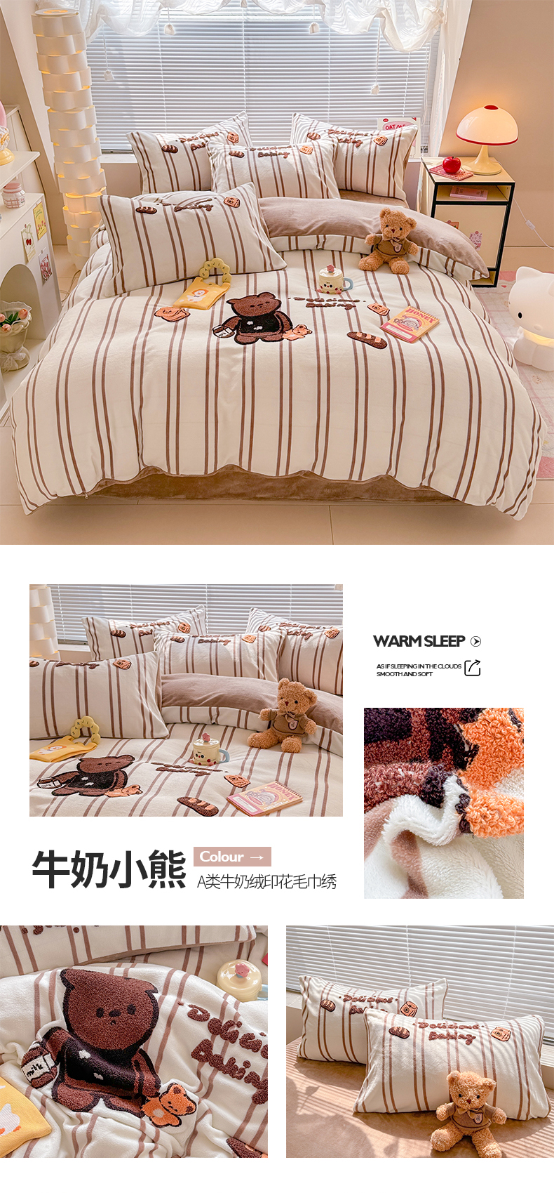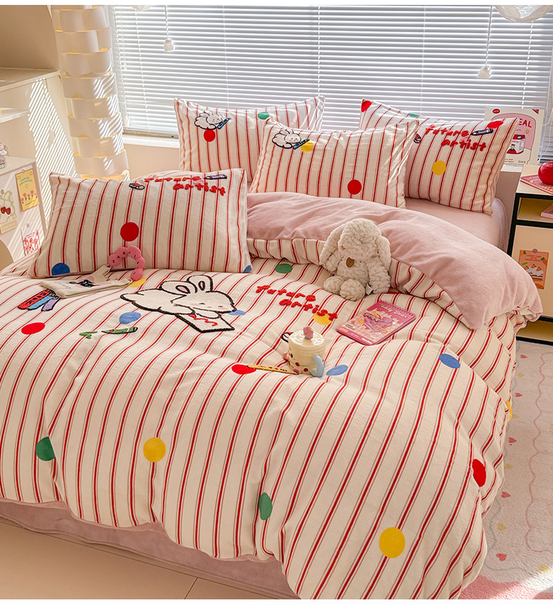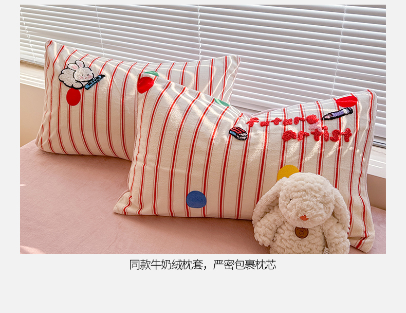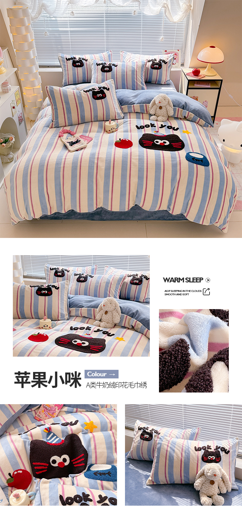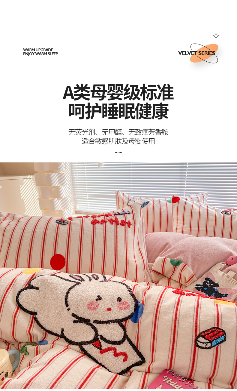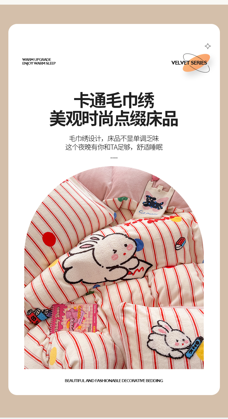 商品名称:懒猫家纺 2025新款印花牛奶绒毛巾绣四件套 画画小兔