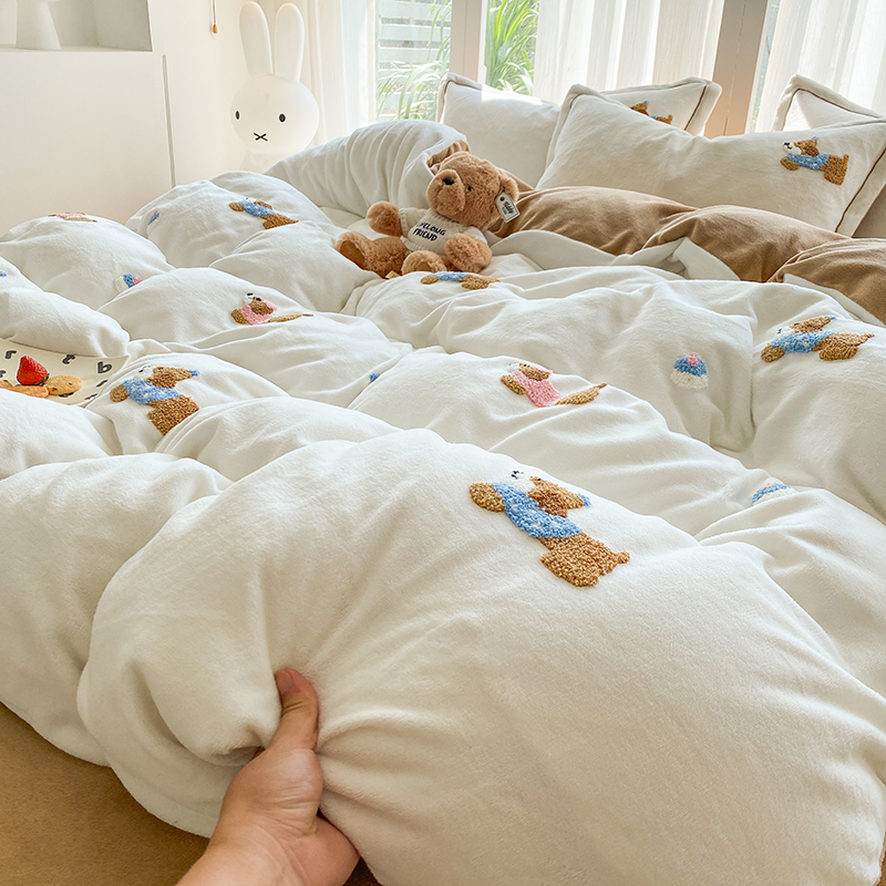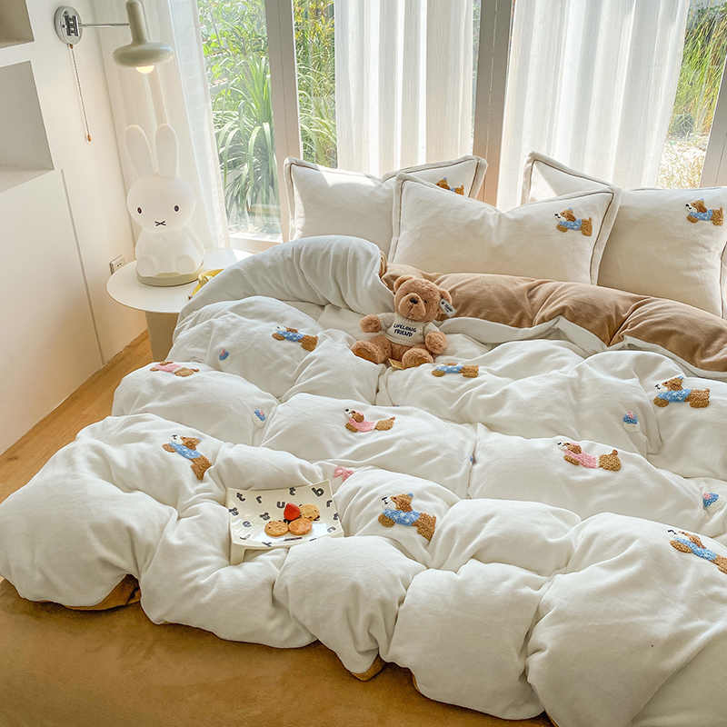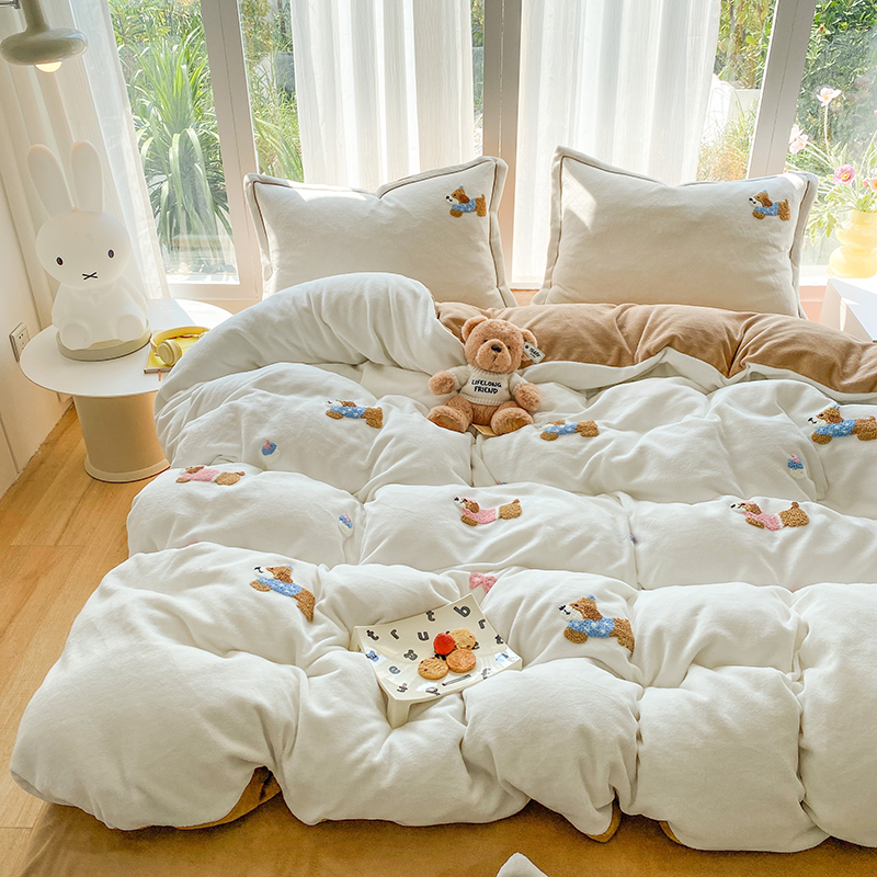 人人爱家纺 2025新款牛奶绒绣花四件套 幸运狗-米白
