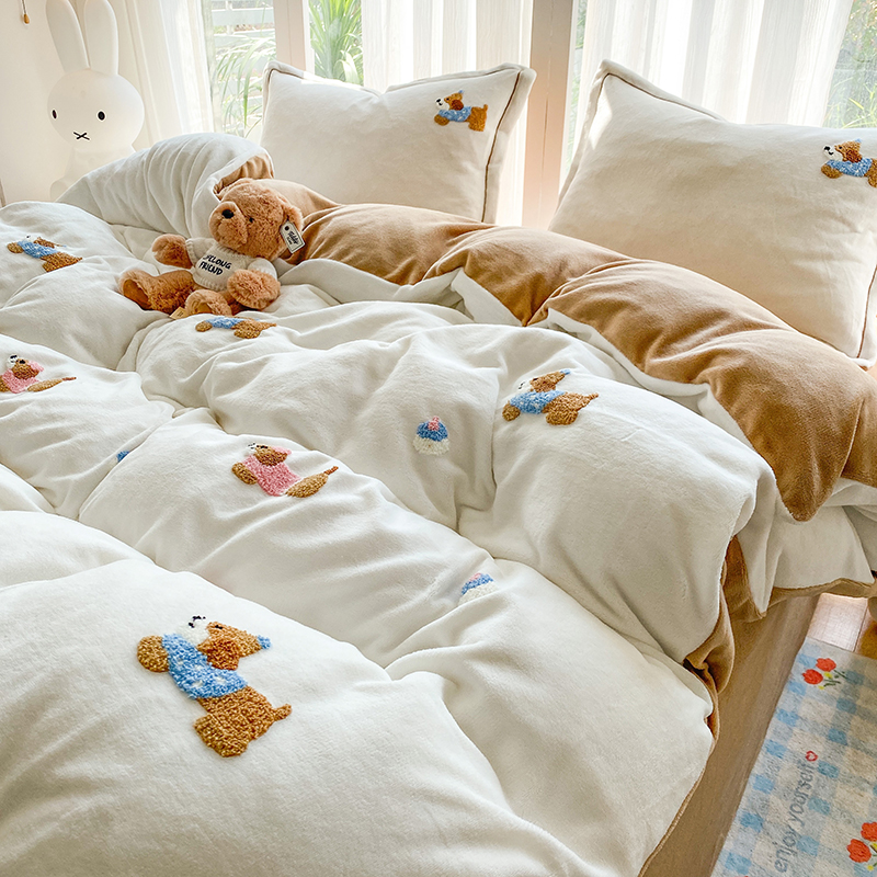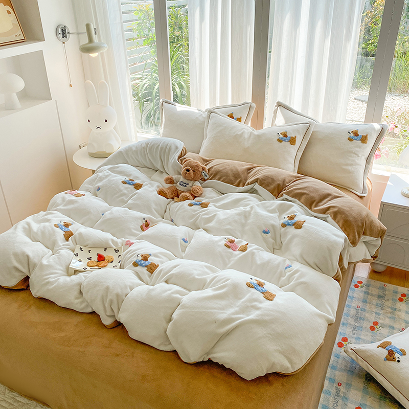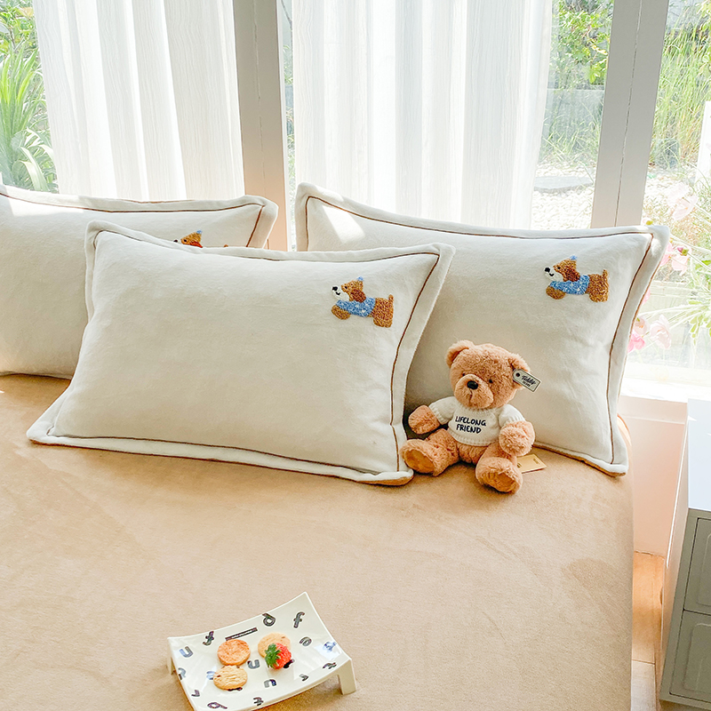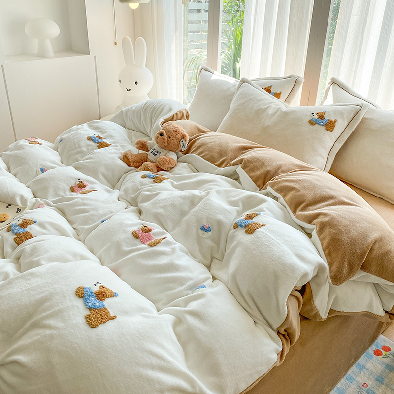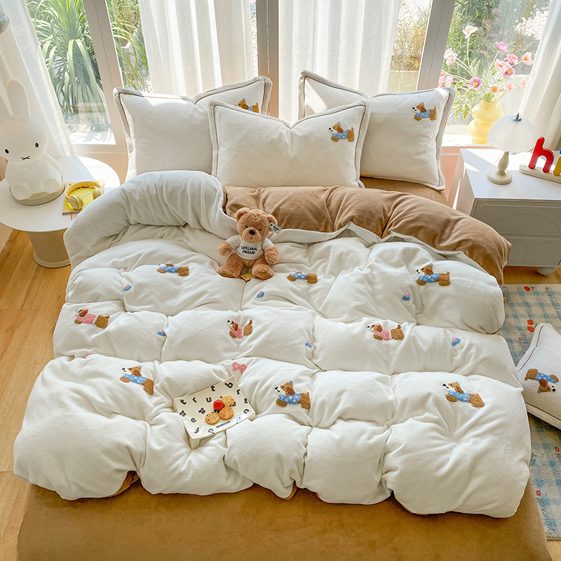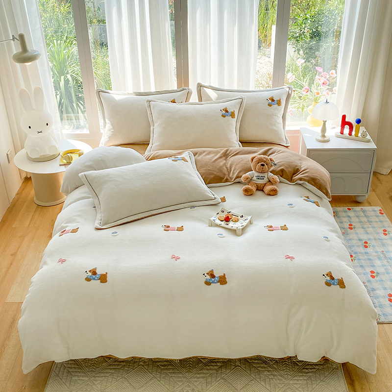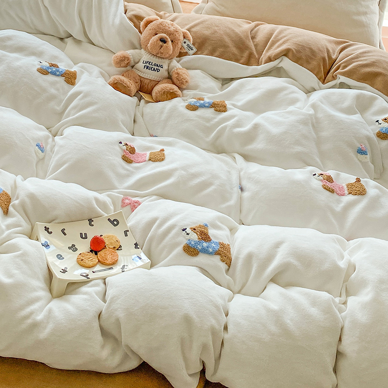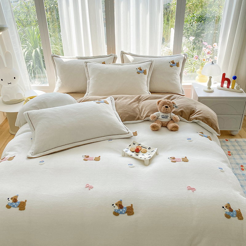 人人爱家纺 2025新款牛奶绒绣花四件套 幸运狗-米白,幸运狗-米白