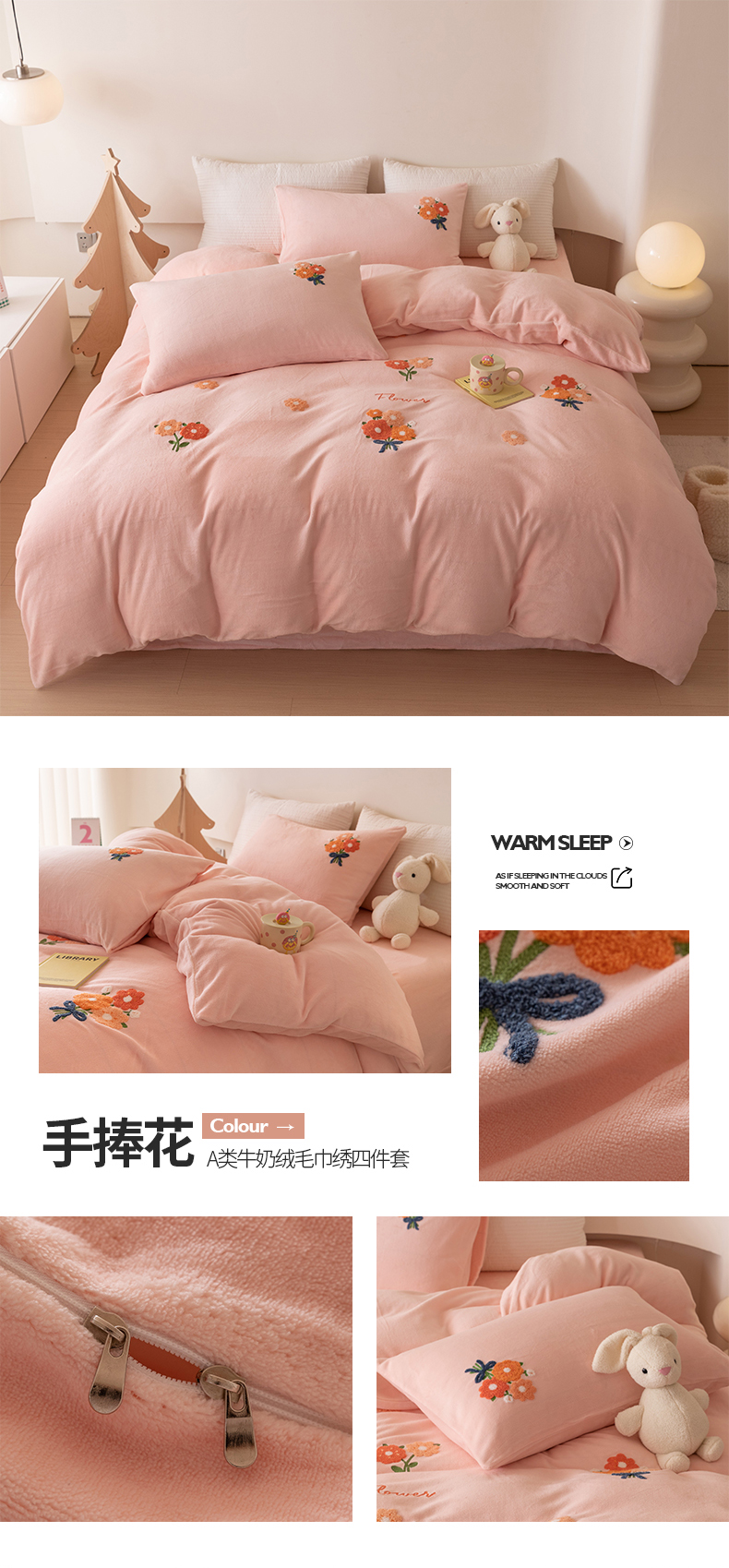 商品名称:懒猫家纺 2025新款牛奶绒毛巾绣四件套 粉红爱心