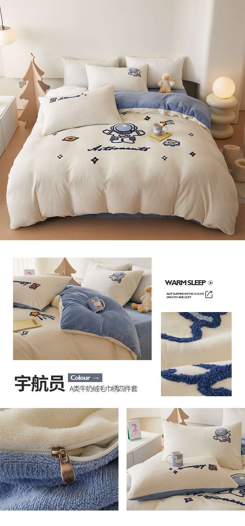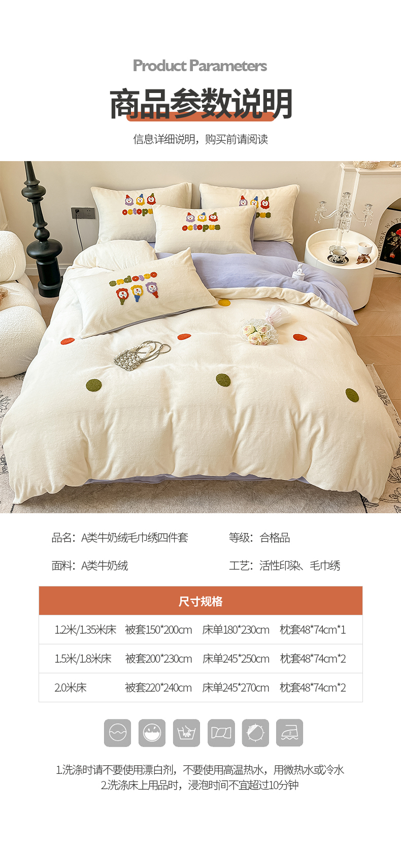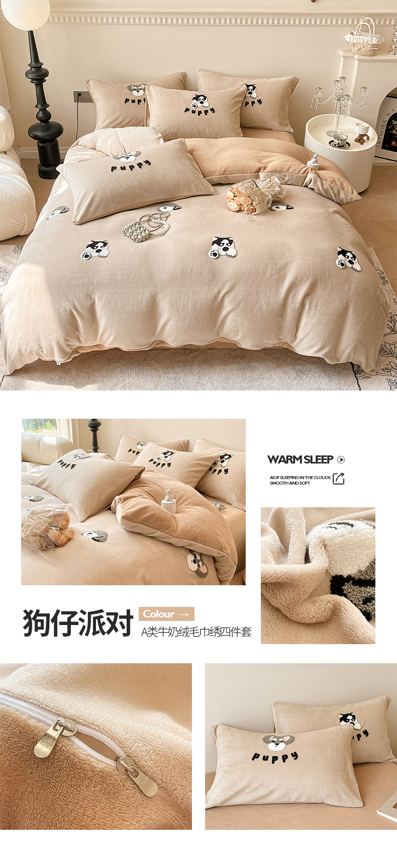 商品名称:懒猫家纺 2025新款牛奶绒毛巾绣四件套 玩偶派对