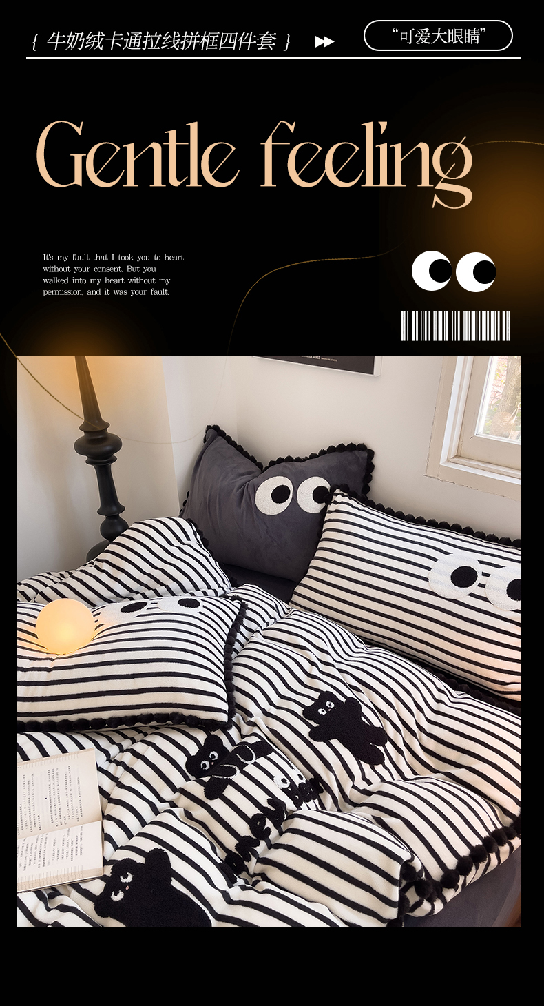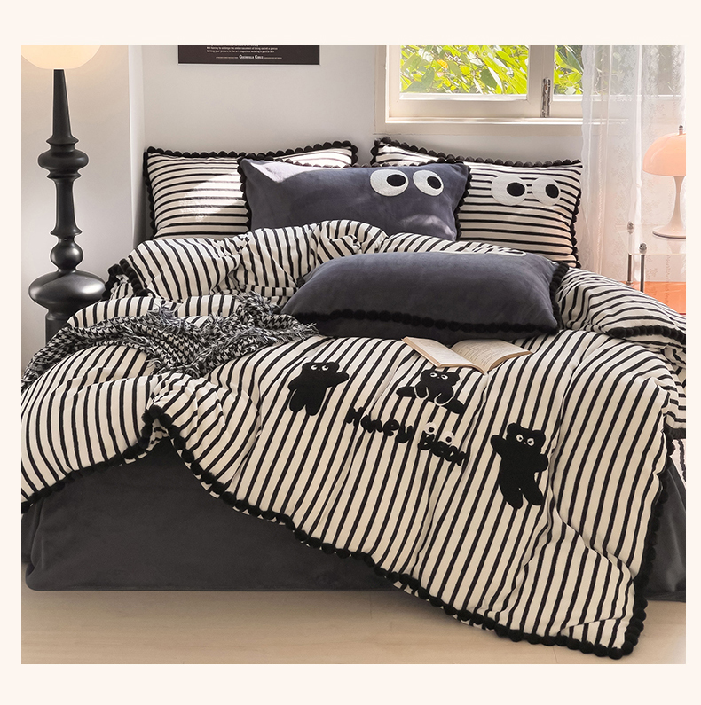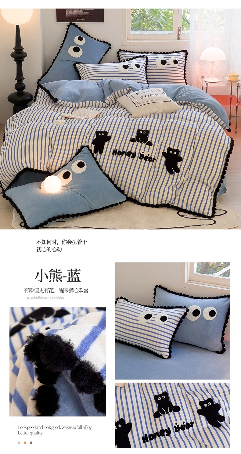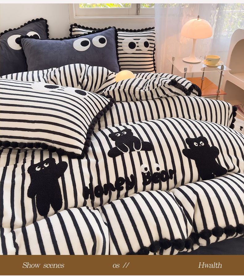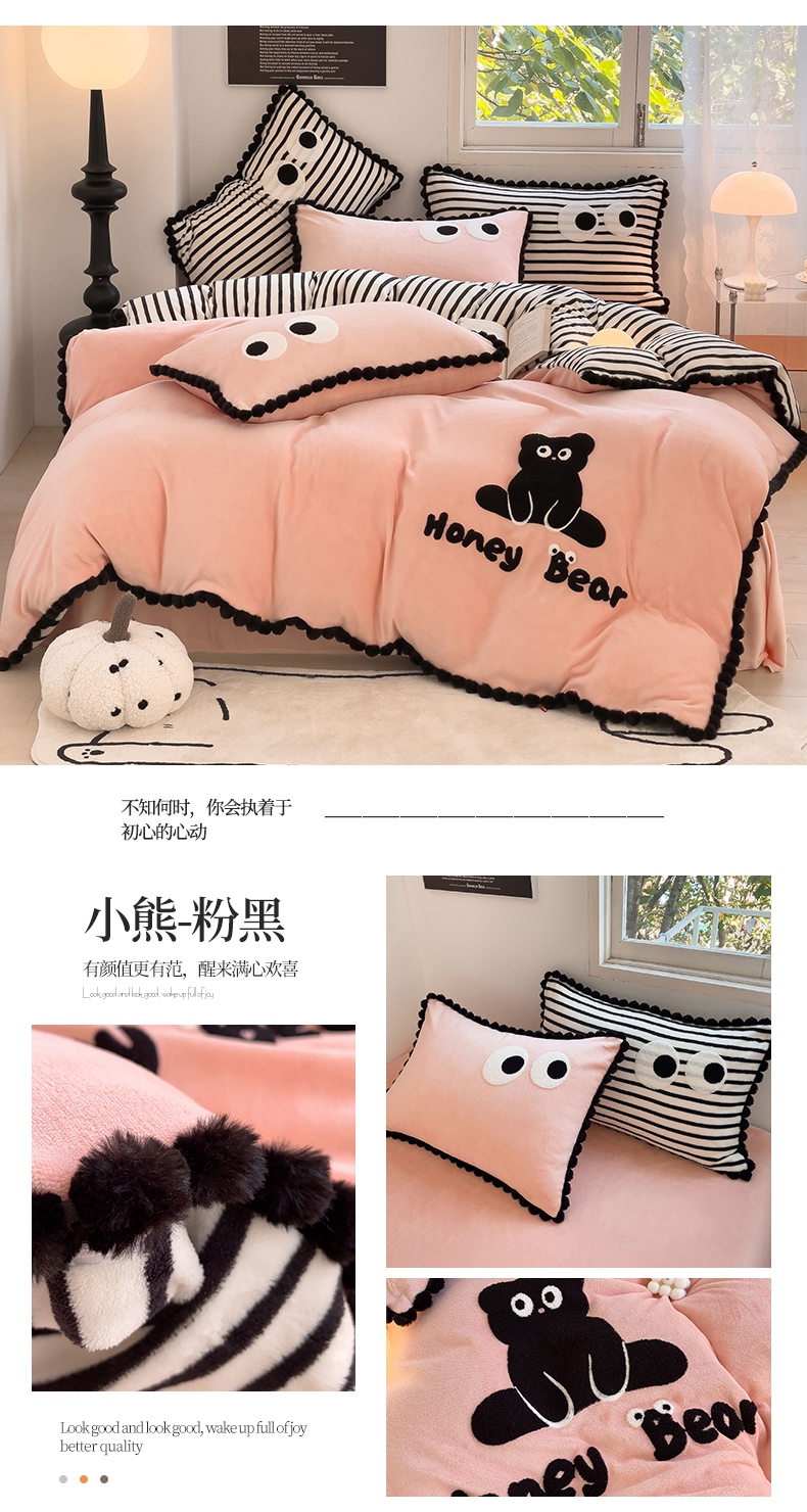 炫拼家纺 2025新款大眼萌小熊韩系黑毛球毛巾绣牛奶绒四件套 大眼萌小熊-黑