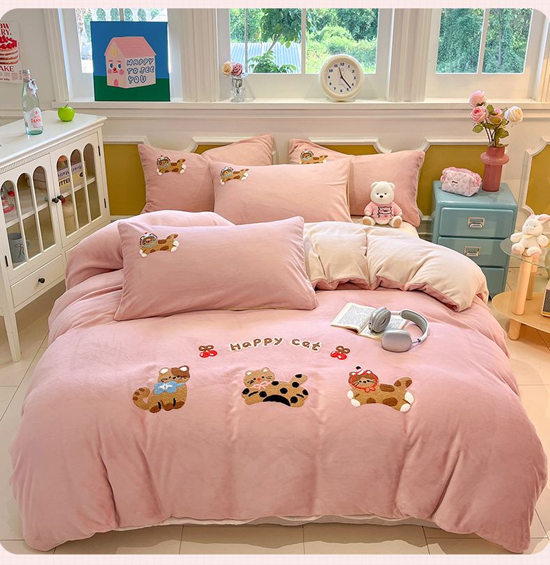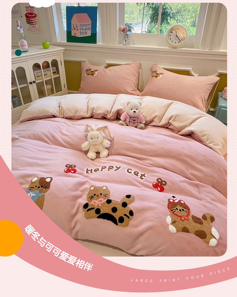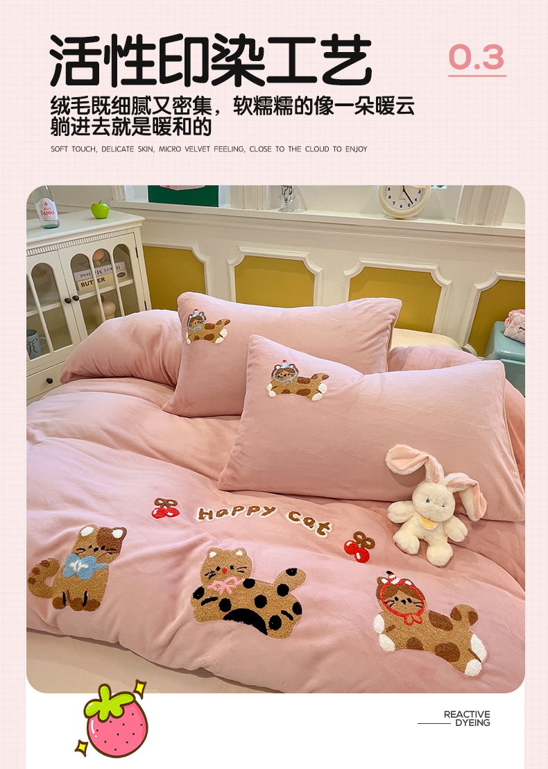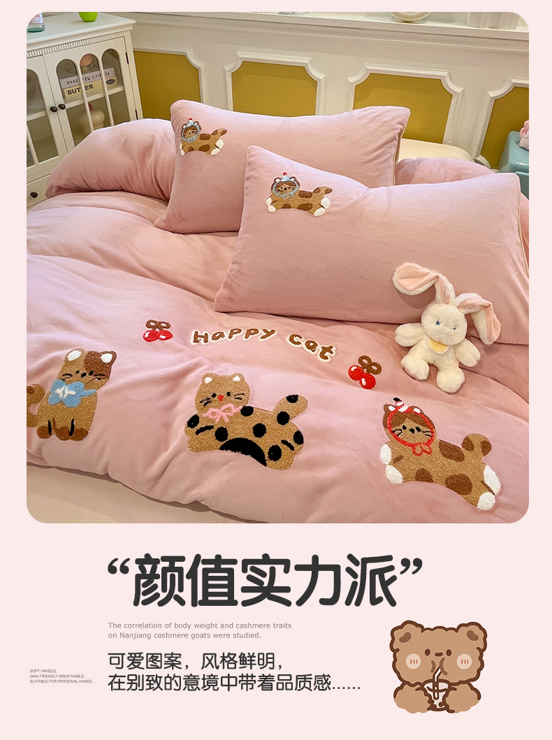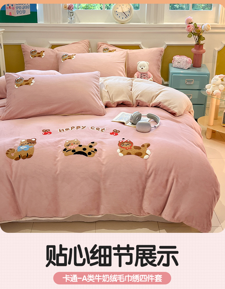 商品名称:优迈 2025新款A类卡通200g牛奶绒毛巾绣四件套 粉糯猫咪