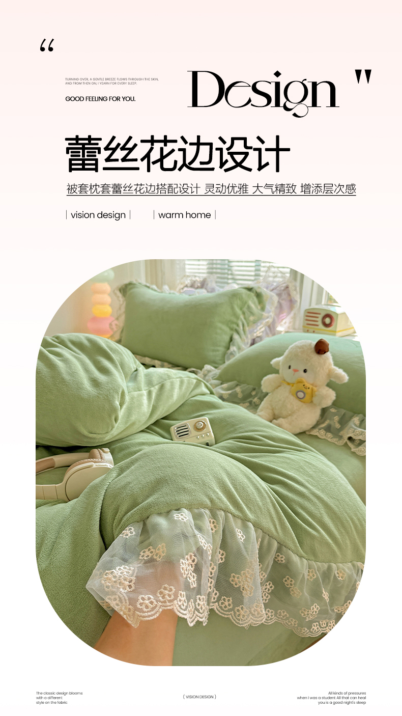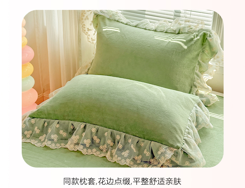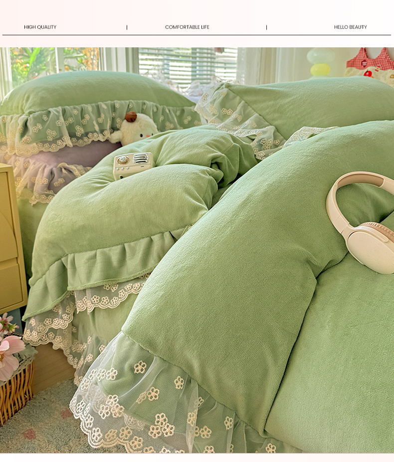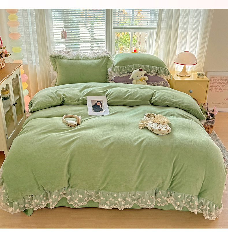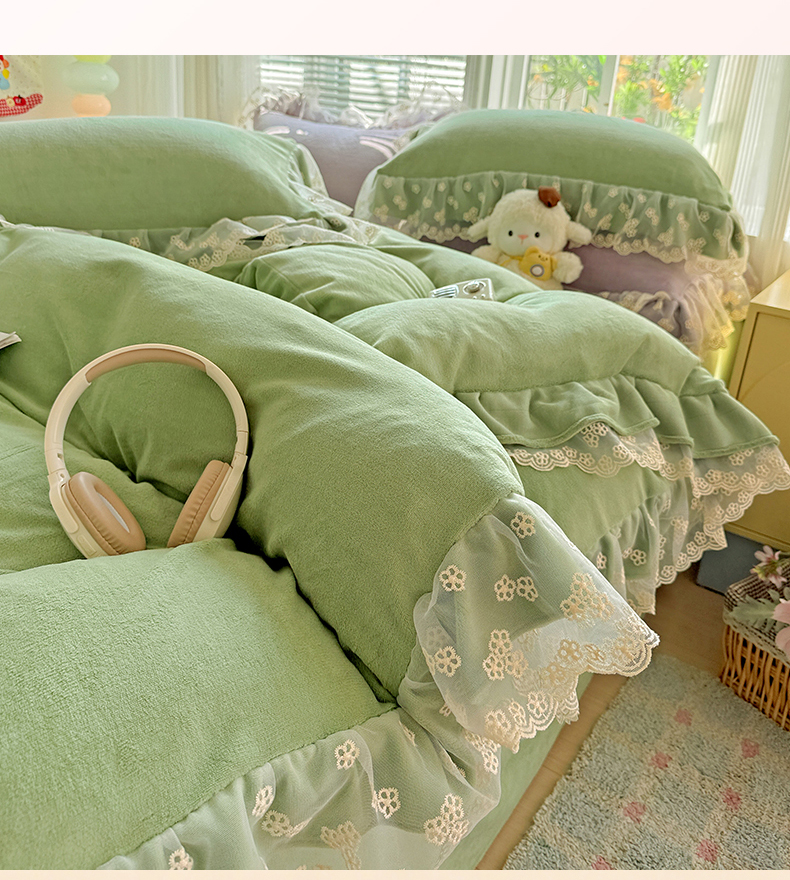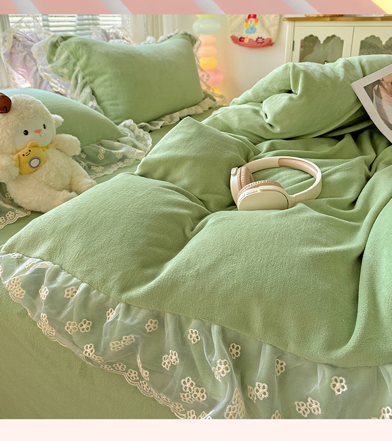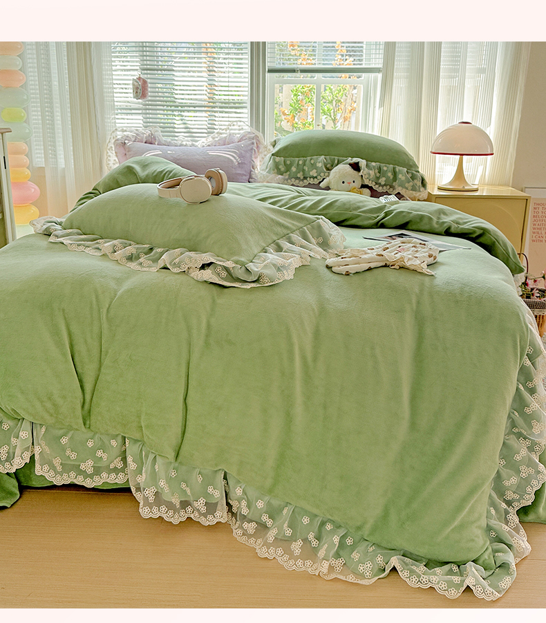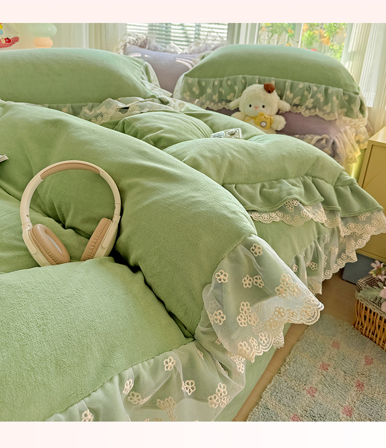 商品名称:鑫利来家纺 2025新款法式蕾丝花边牛奶绒四件套韩版花边加厚牛奶绒四件套 倾城-草绿