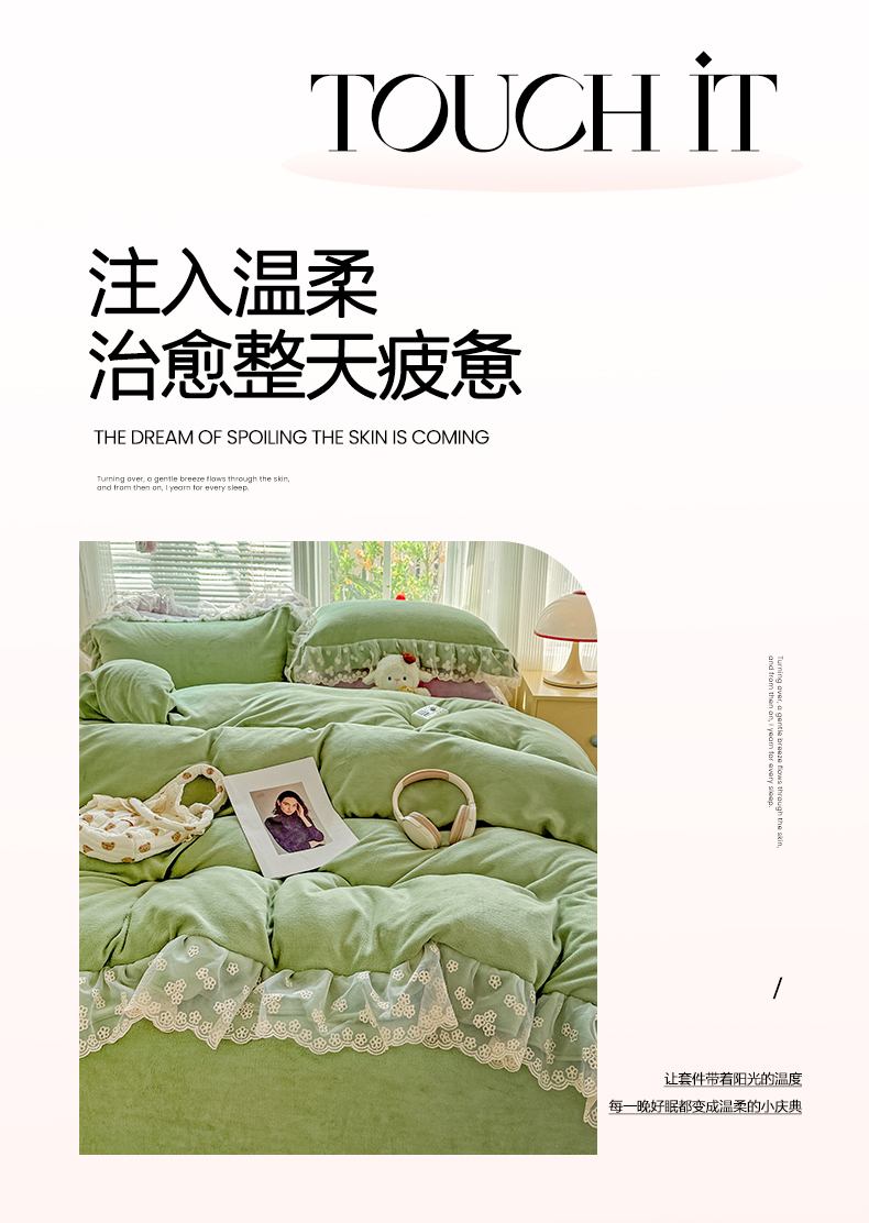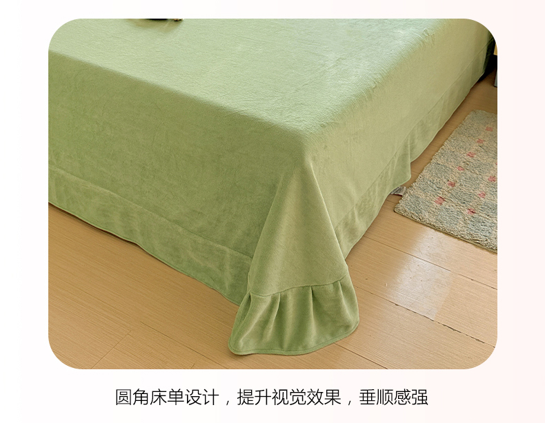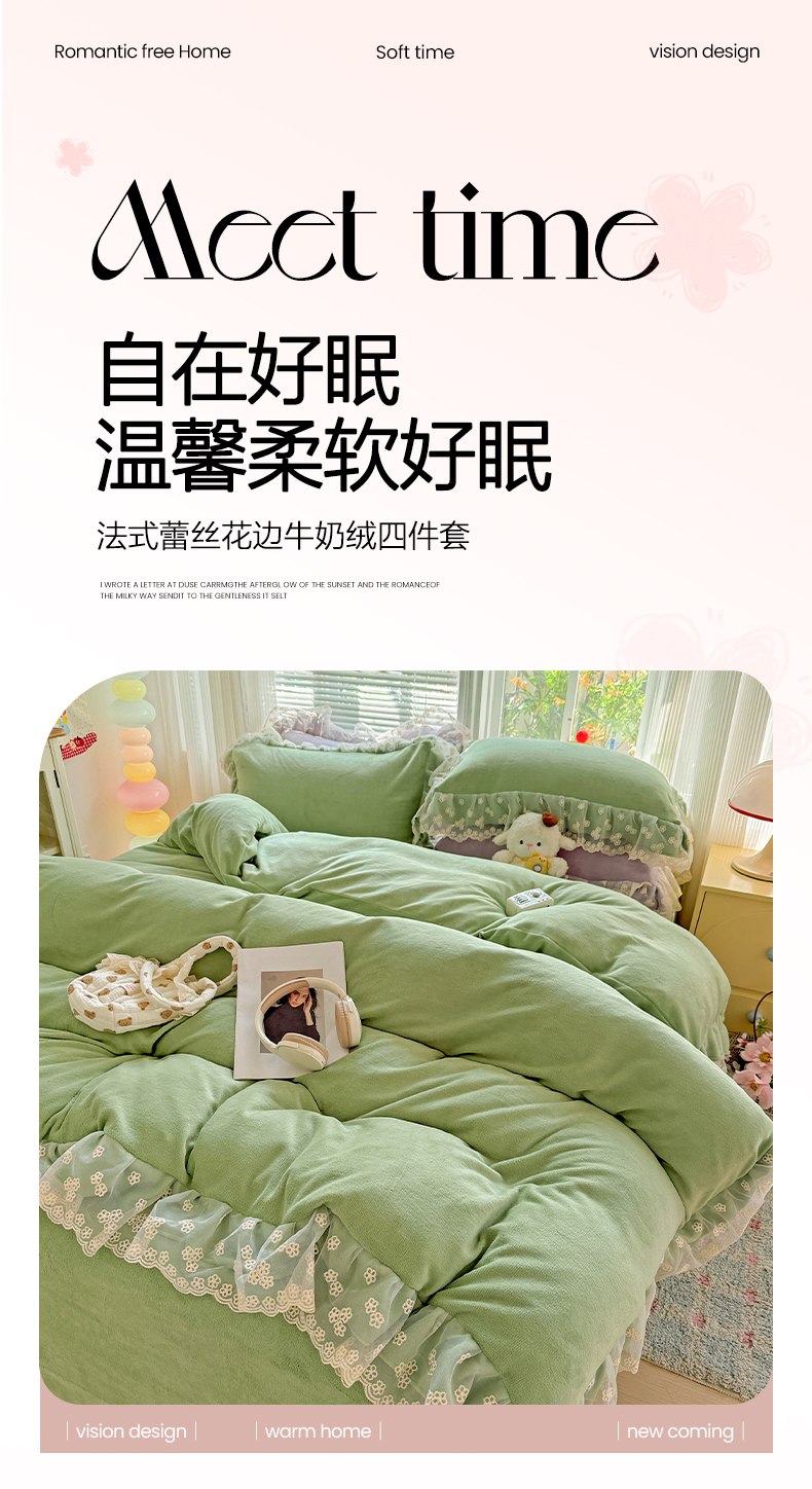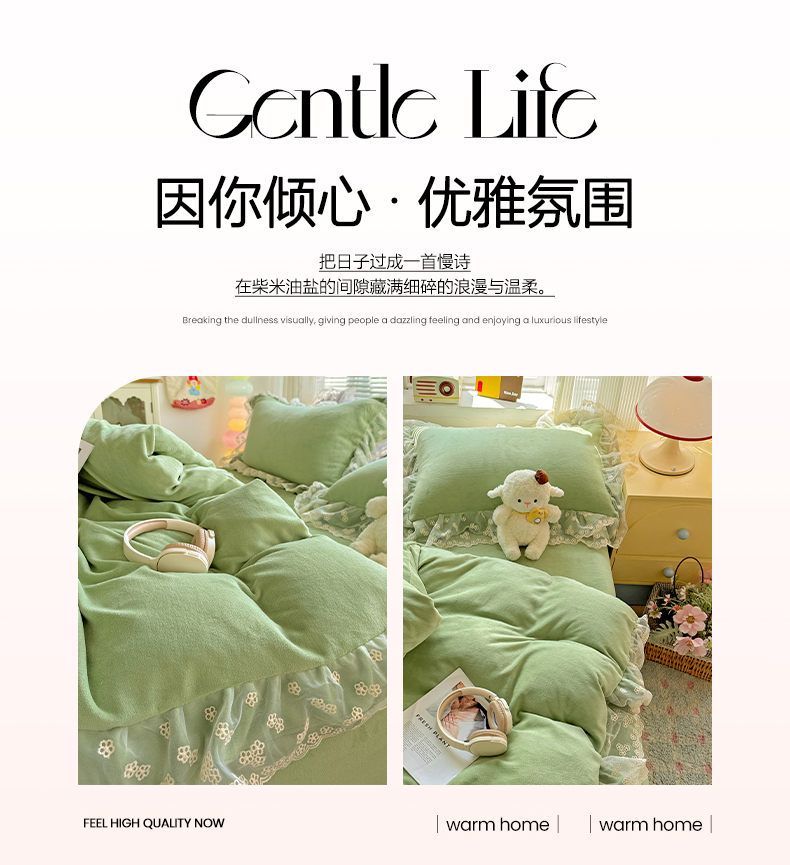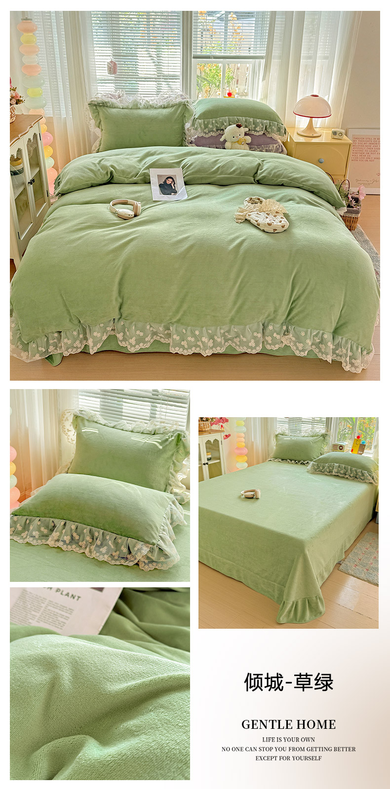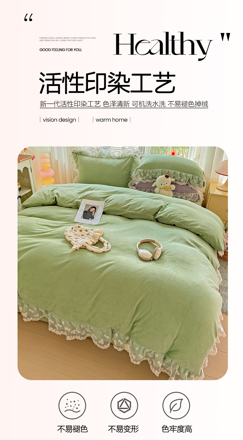 商品名称:鑫利来家纺 2025新款法式蕾丝花边牛奶绒四件套韩版花边加厚牛奶绒四件套 倾城-草绿