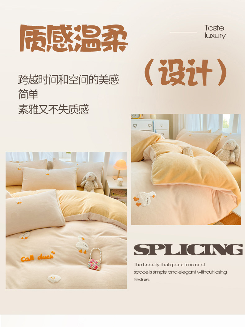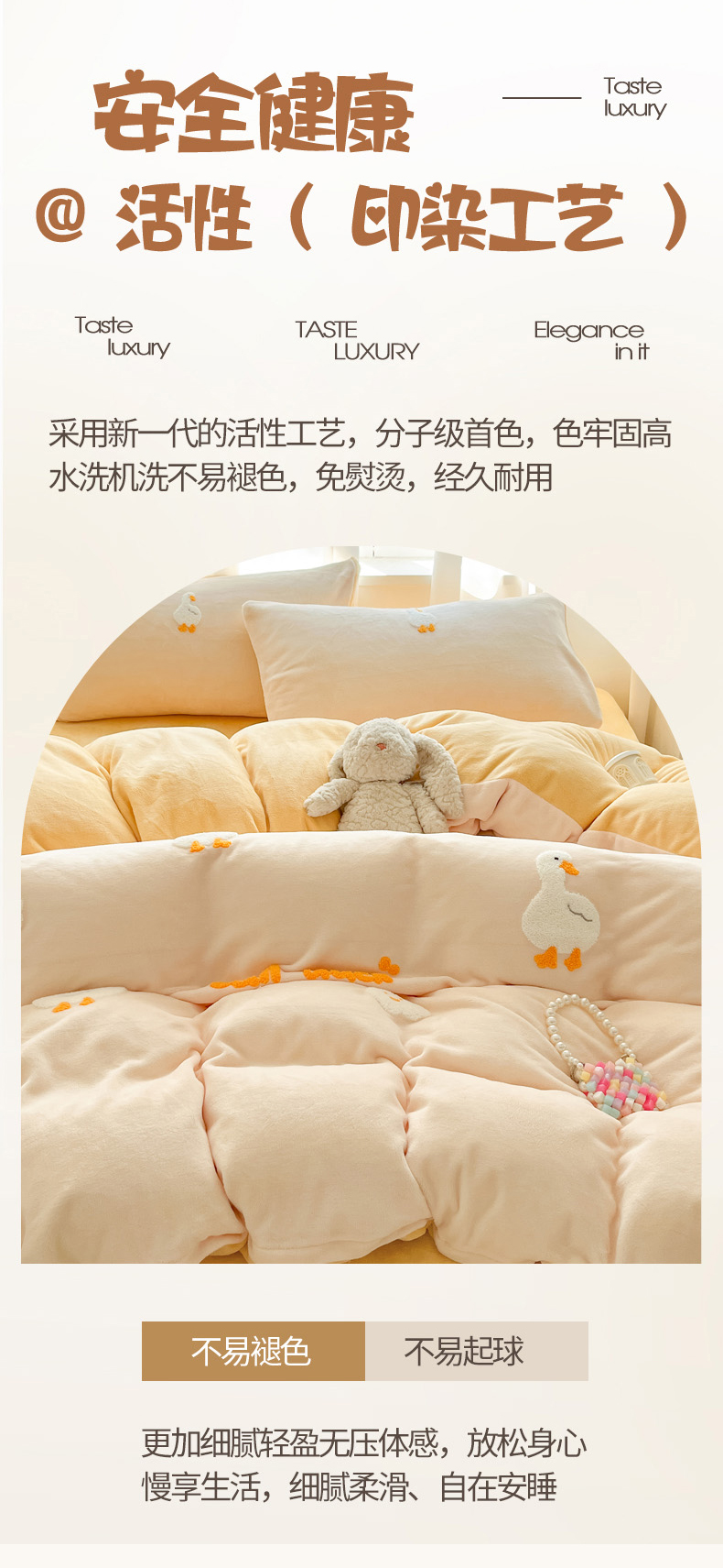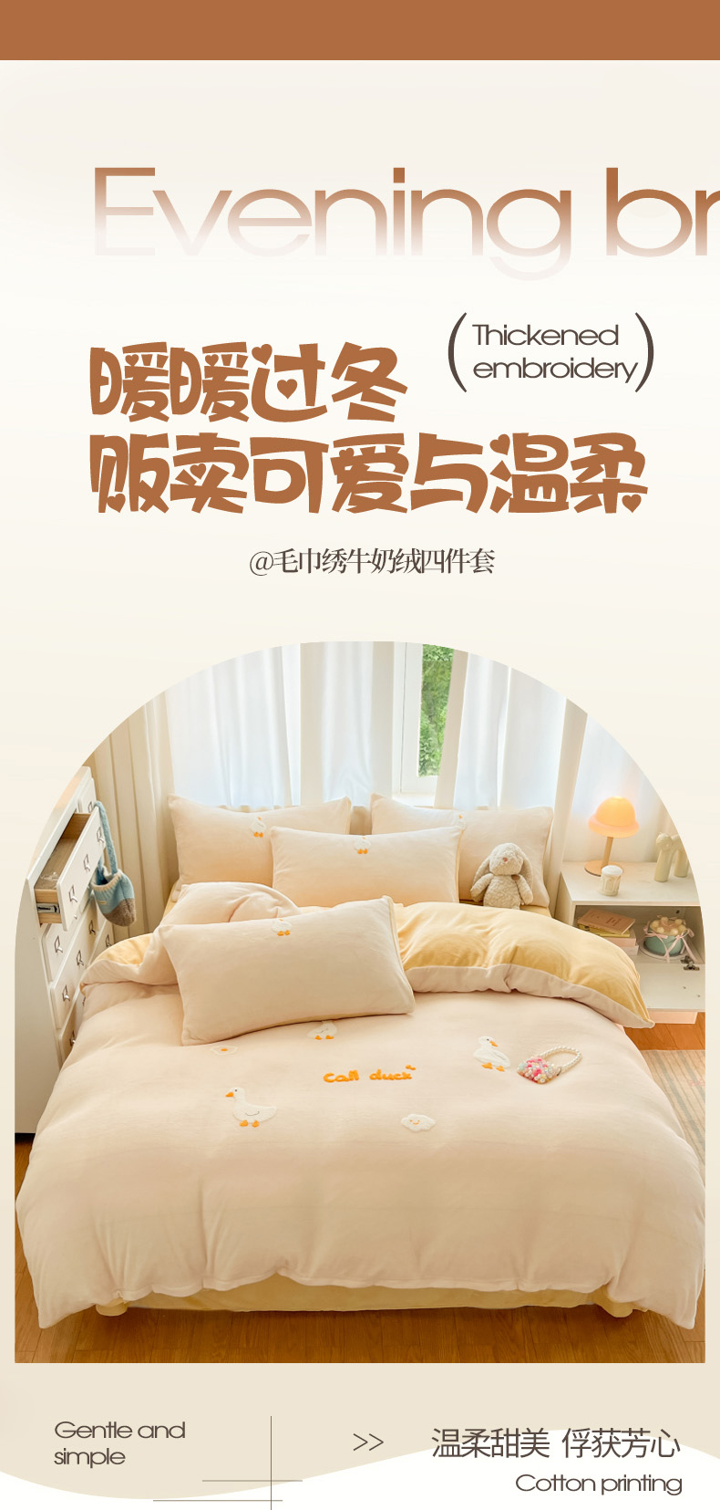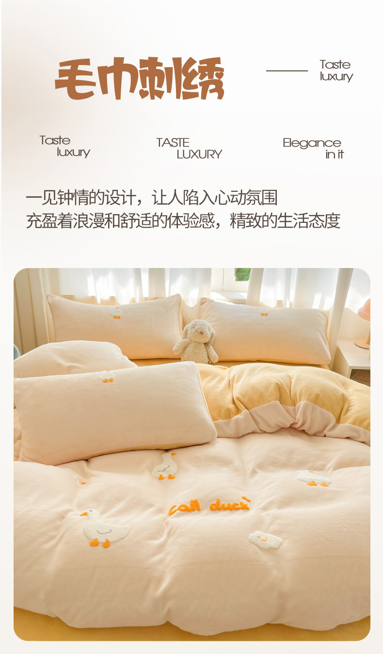当前位置: 91家纺网 > 商品网购 > 床品套件 > 四件套 > 牛奶绒四件套 > 丽涵家纺 2025秋冬新品210克牛奶绒毛巾绣四件套卡通绣花学生床笠三件套 柯尔鸭