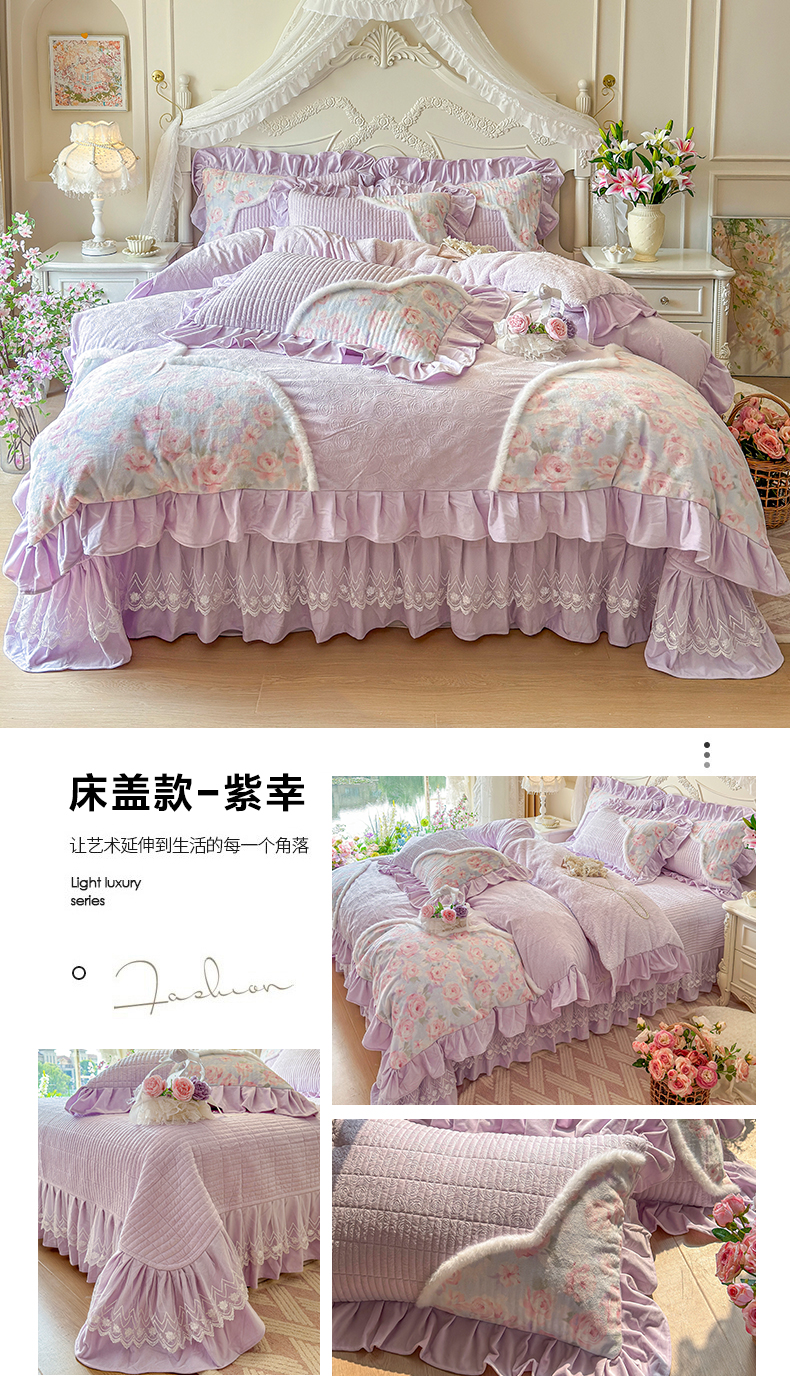 (总)宜凡家纺 2025新款兔绒提花牛奶绒夹棉床裙四件套,爱心 少女粉,爱心 粉紫,爱心 驼色,蝶舞 大红,蝶舞 米色,蝶舞 浅紫,蝶舞 玉色,简爱 苍青,简爱 豆沙紫,简爱 玉色,樱桃 苍青,樱桃 豆沙紫,樱桃 奶油白