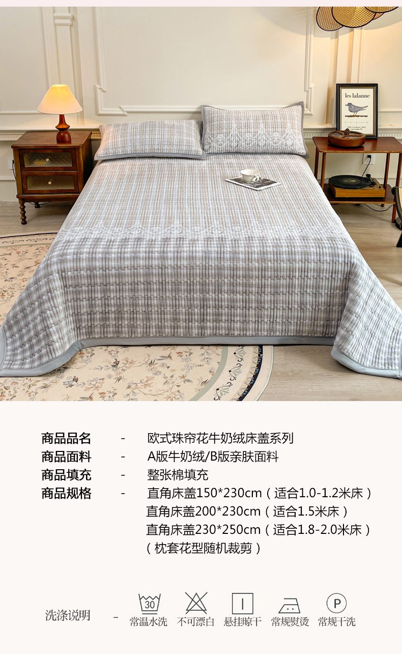 商品名称:慕木家纺 2025新款A类高克重欧式牛奶绒夹棉床盖珠帘花系列-场景一 珠帘花-灰