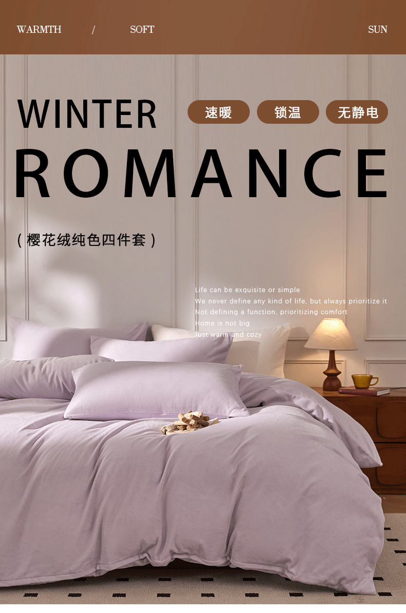 当前位置: 91家纺网 > 商品网购 > 床品套件 > 四件套 > 其它四件套 > 618家纺 2025新款樱花绒单品四件套系列-四件套 雾紫