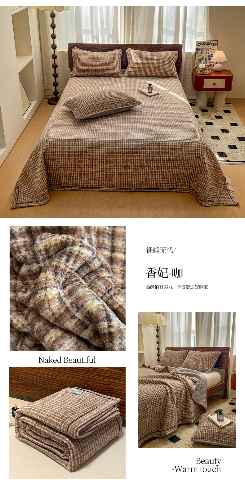 • 91家纺网 家纺一手货源 找家纺 芷卧 2025新款小香风牛奶绒床盖三件套 香妃-咖