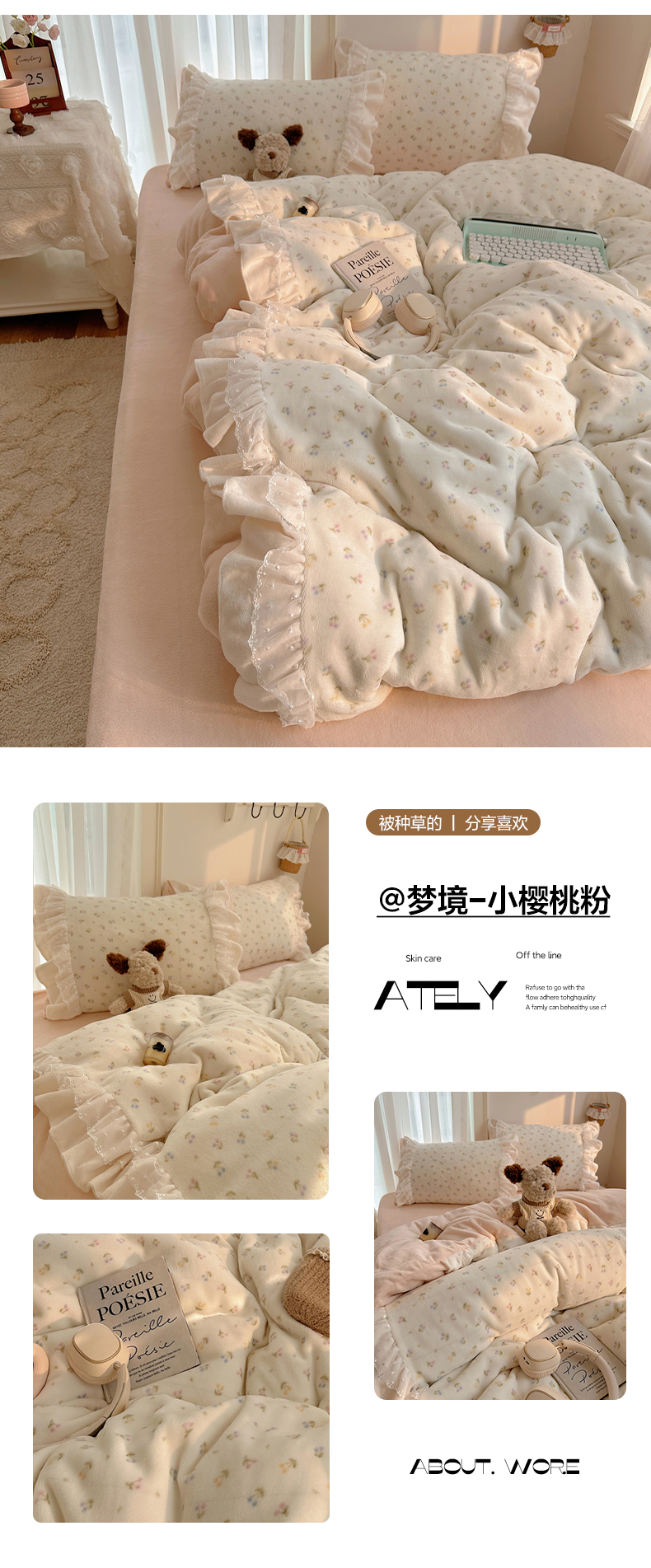 当前位置: 91家纺网 > 商品网购 > 床品套件 > 四件套 > 牛奶绒四件套 > 山茶家纺 2025新款韩系A类牛奶绒花边印花四件套梦境 梦境-小樱桃蓝-床裙图