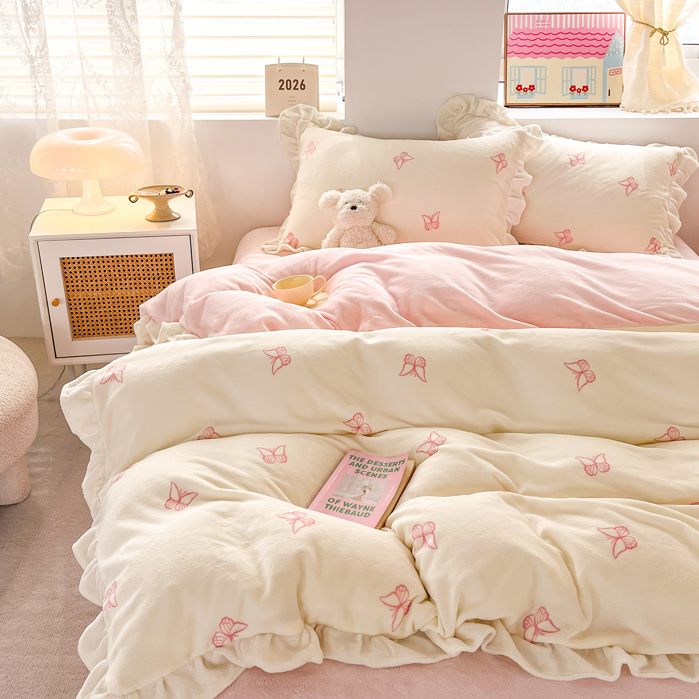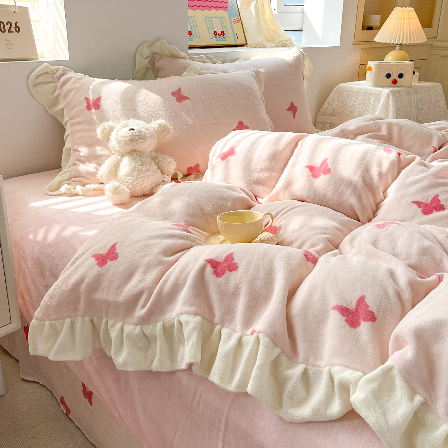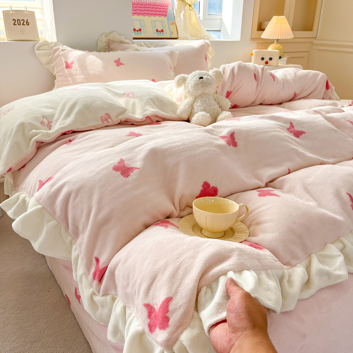 当前位置: 91家纺网 > 商品网购 > 床品套件 > 四件套 > 牛奶绒四件套 > 麦朵家居 2025新款10斤重床盖款花边牛奶绒四件套雕花绒法莱绒四件套兔兔绒四件套床笠三件套-梦蝶 梦蝶粉
