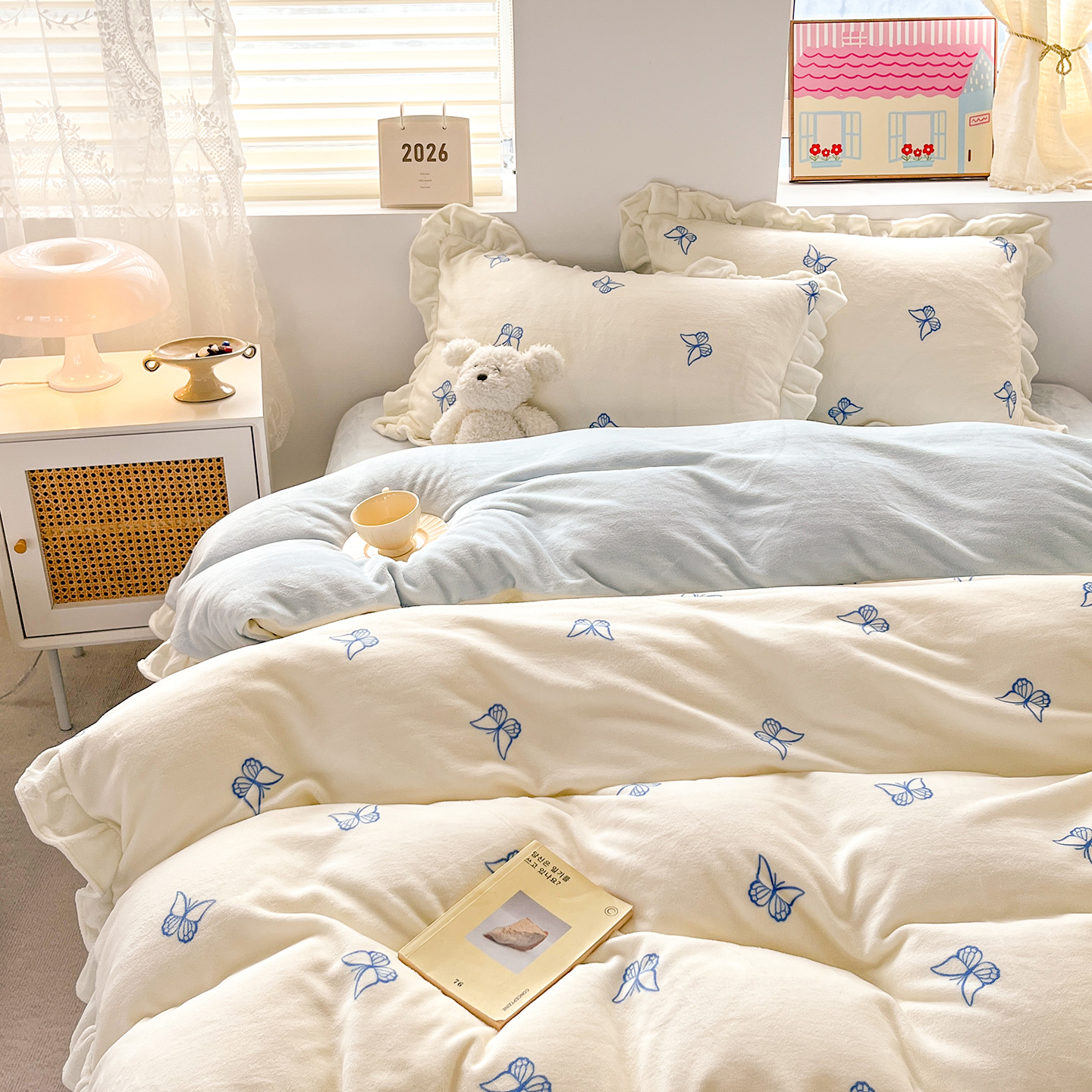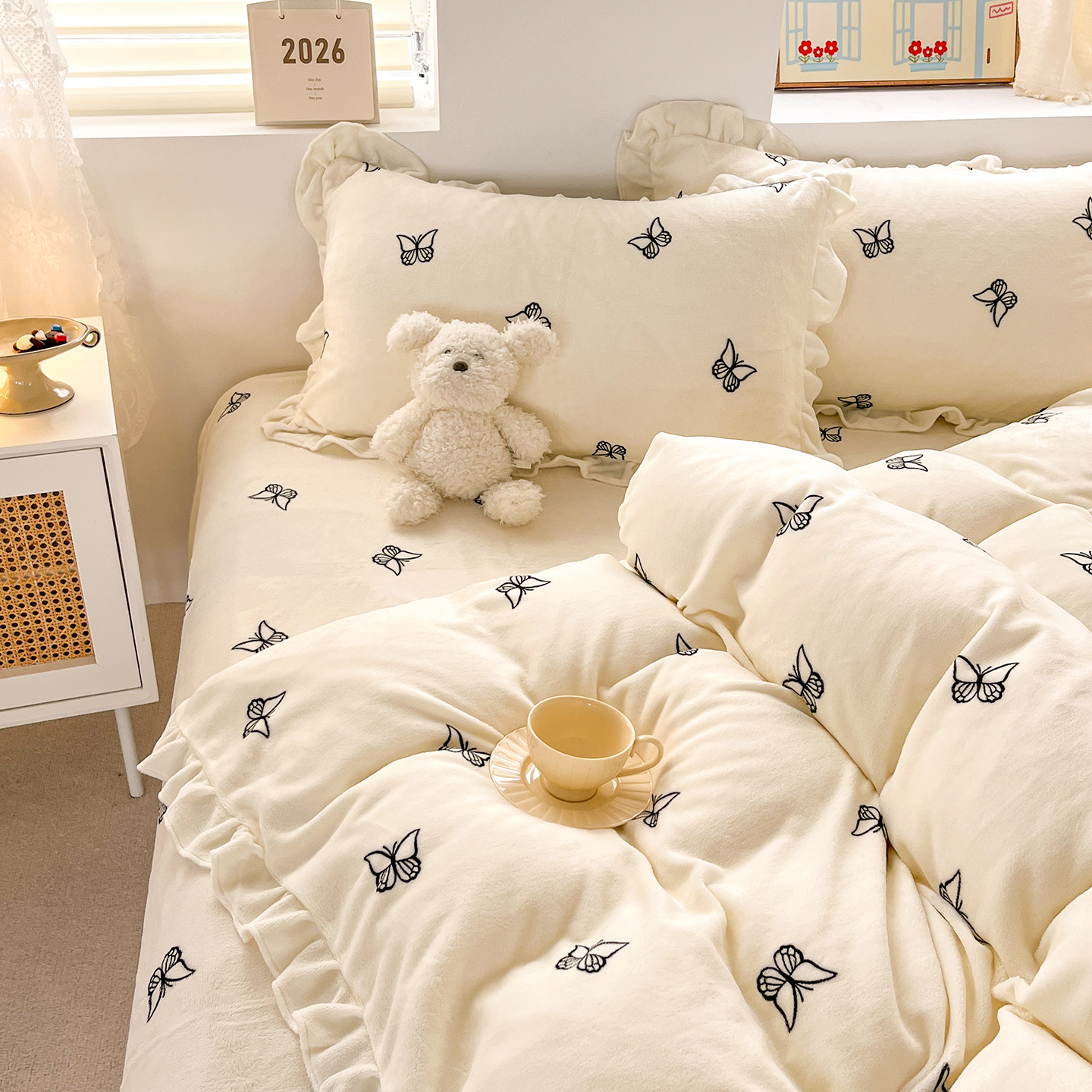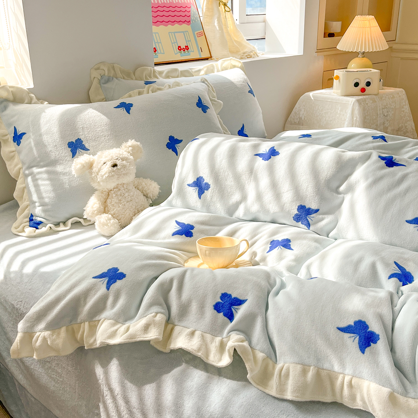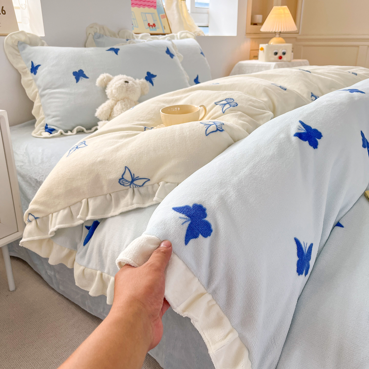 当前位置: 91家纺网 > 商品网购 > 床品套件 > 四件套 > 牛奶绒四件套 > 麦朵家居 2025新款10斤重床盖款花边牛奶绒四件套雕花绒法莱绒四件套兔兔绒四件套床笠三件套-梦蝶 梦蝶粉