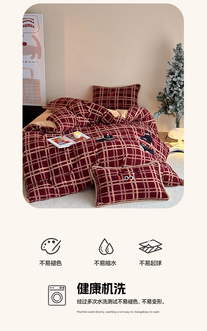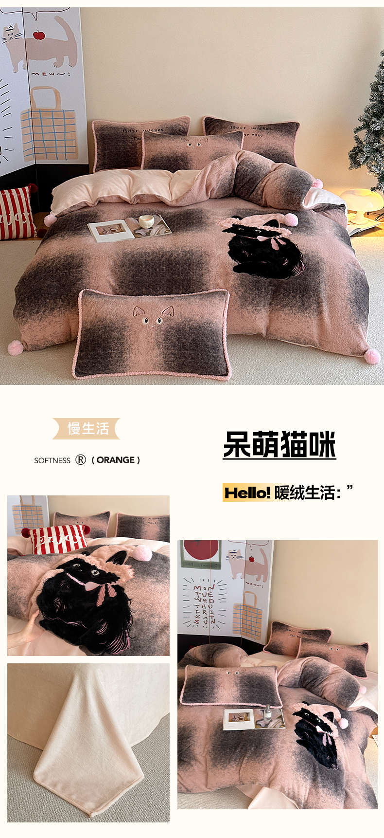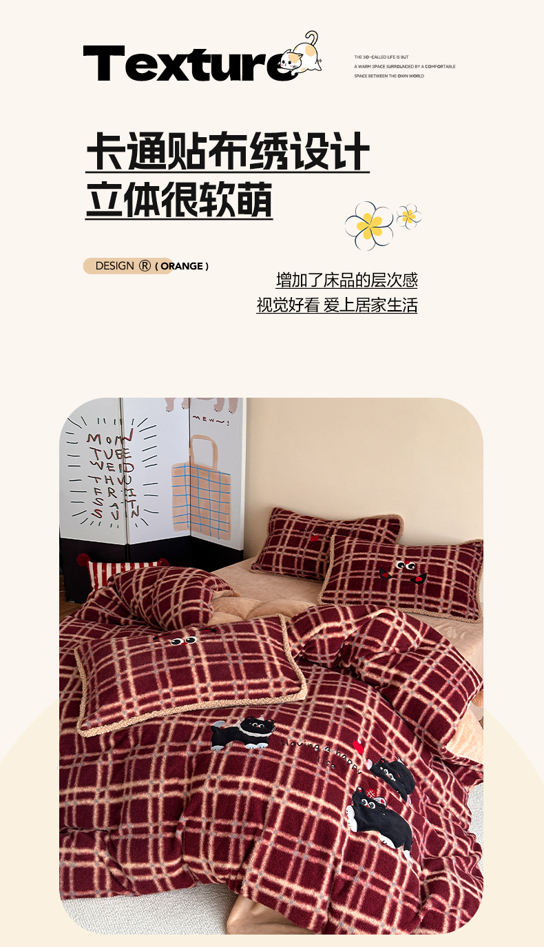 商品名称:宇航家纺 2025新款仿羊毛仿羊绒牛奶绒复古风美拉德立体贴布绣花四件套 三只小猫