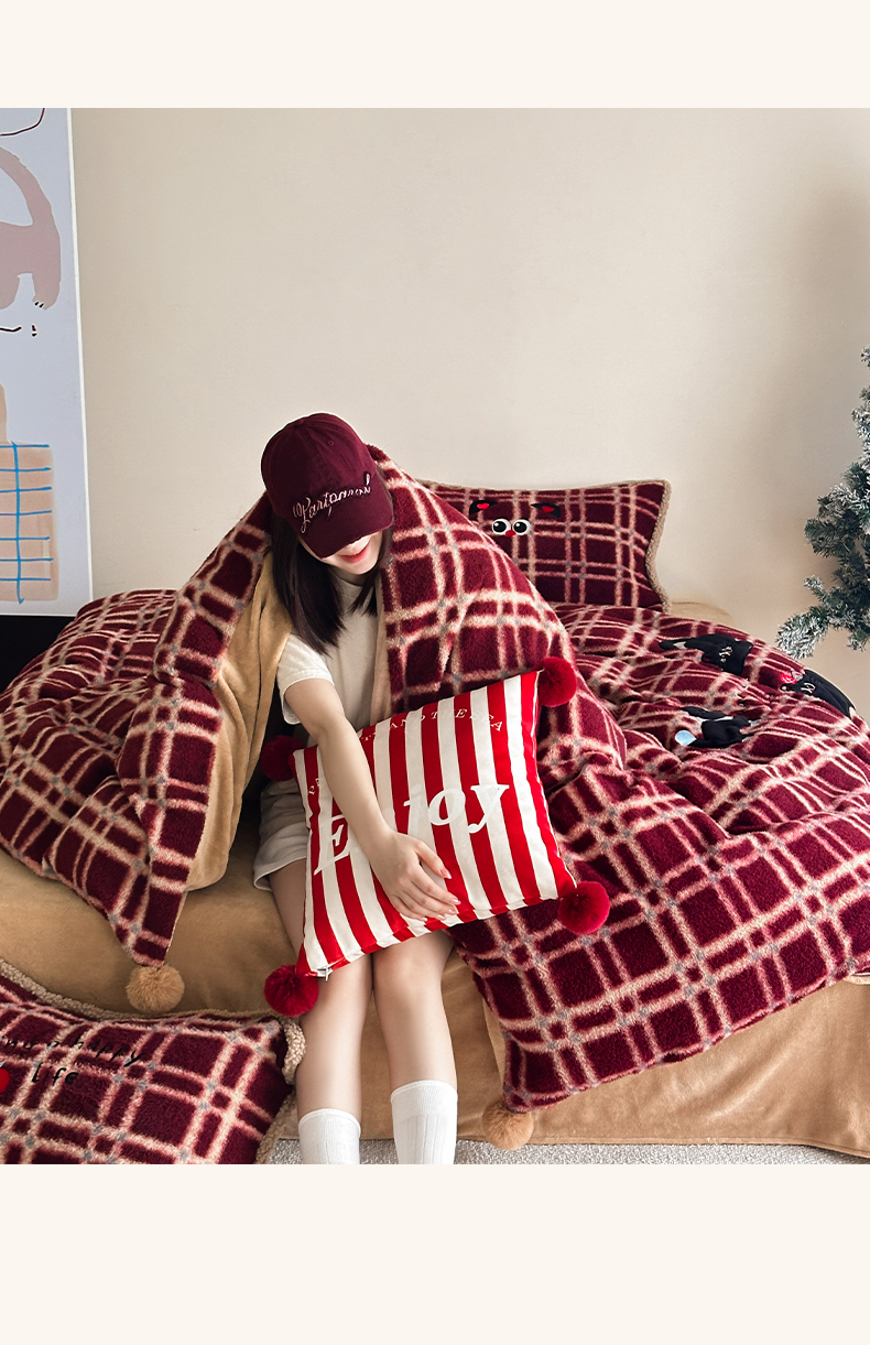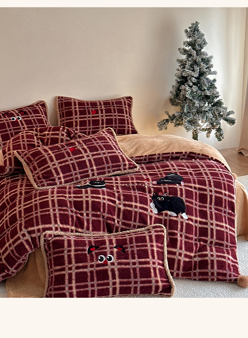 宇航家纺 2025新款仿羊毛仿羊绒牛奶绒复古风美拉德立体贴布绣花四件套 三只小猫
