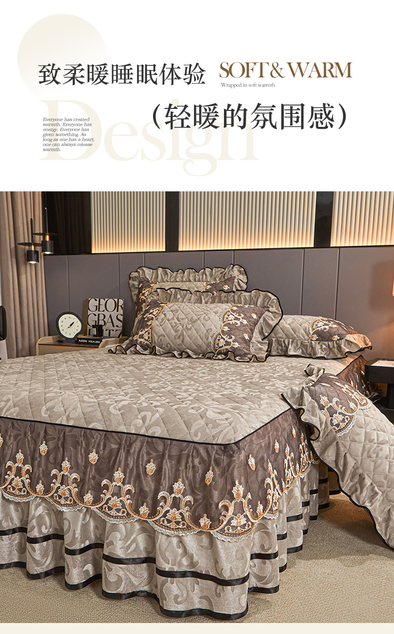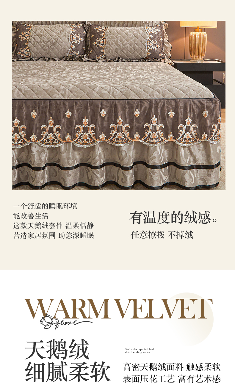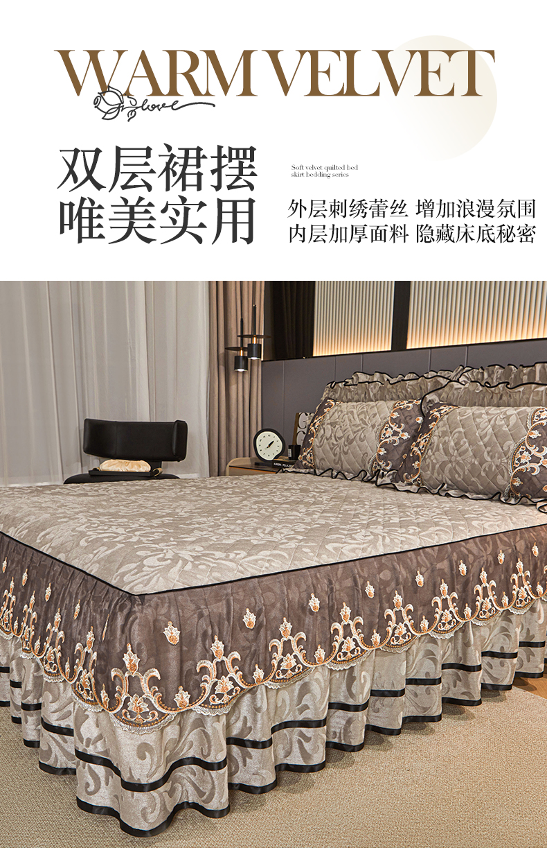 • 91家纺网 家纺一手货源 找家纺 好儿喜家纺 2025新款柔暖天鹅绒夹棉床裙盛世年华系列床裙三件套 盛世年华-灰