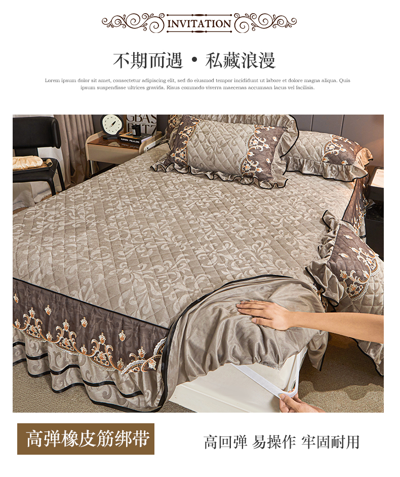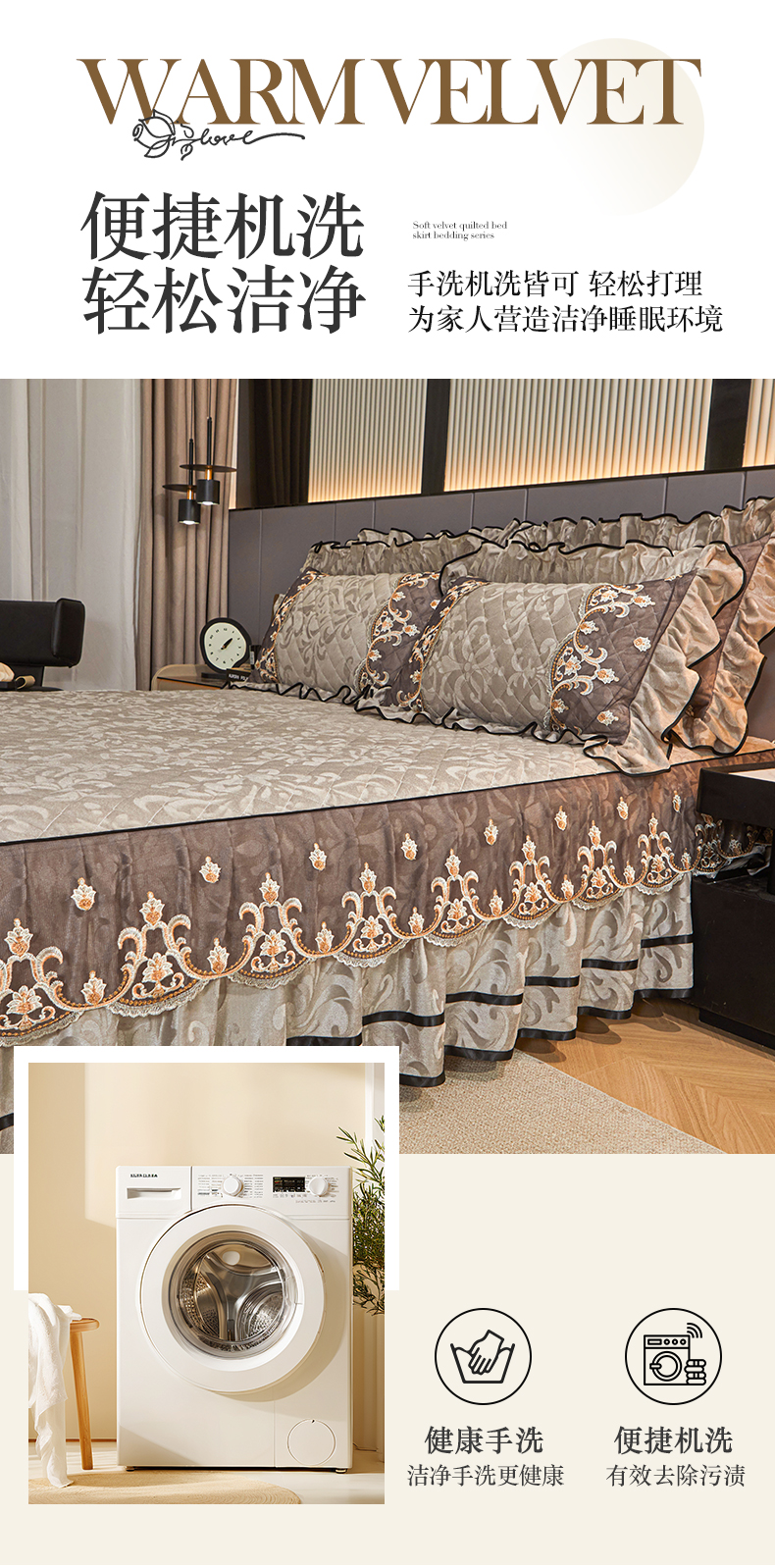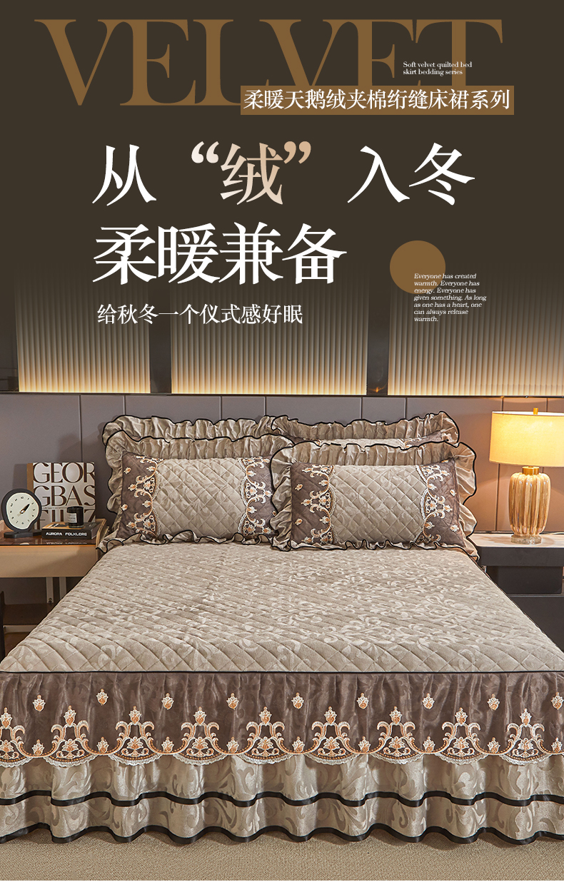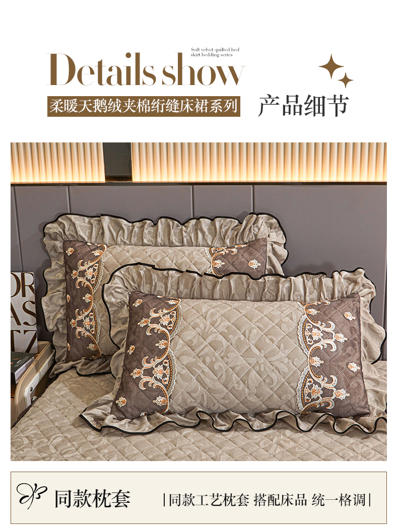 • 91家纺网 家纺一手货源 找家纺 好儿喜家纺 2025新款柔暖天鹅绒夹棉床裙盛世年华系列床裙三件套 盛世年华-灰