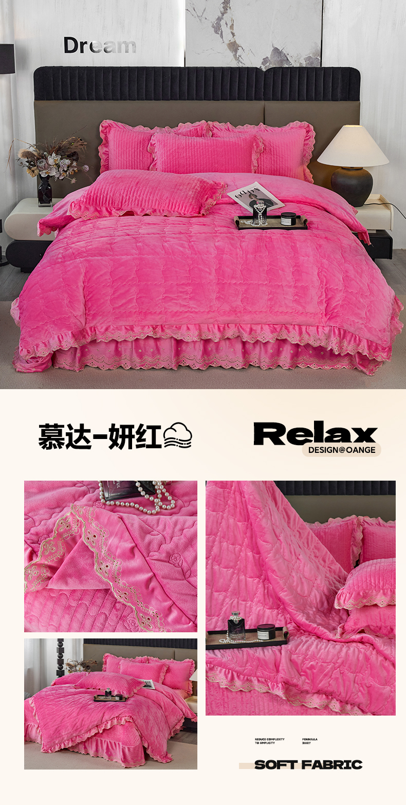 (总)默忆 2025新款宝宝绒蕾丝刺绣花边四件套,浪漫粉,秋日橙,珊瑚红,水晶紫,洋气红,云雾蓝