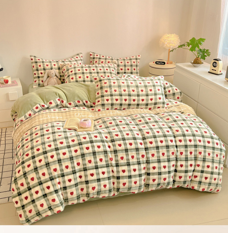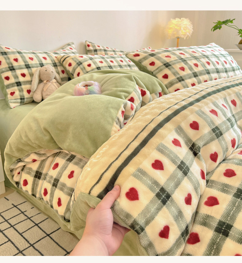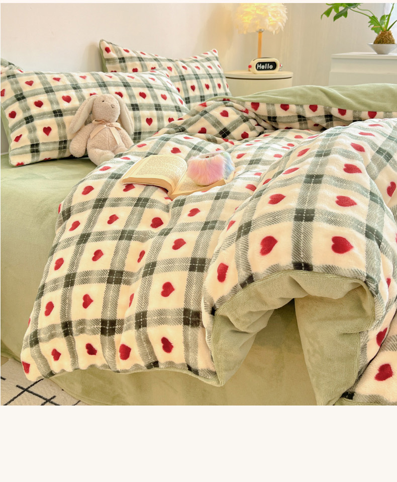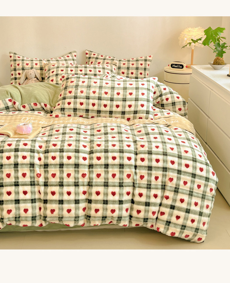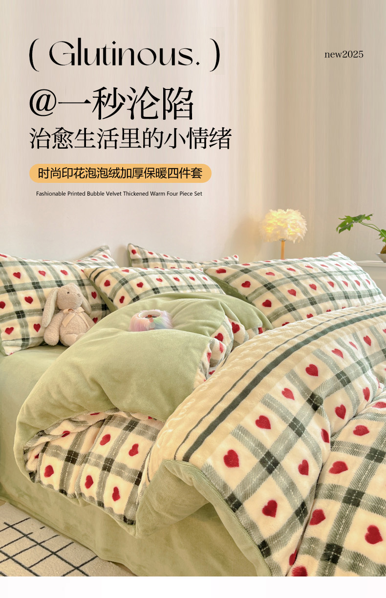柒月家居 2025新款时尚印花泡泡绒加厚保暖四件套套件 格格红心