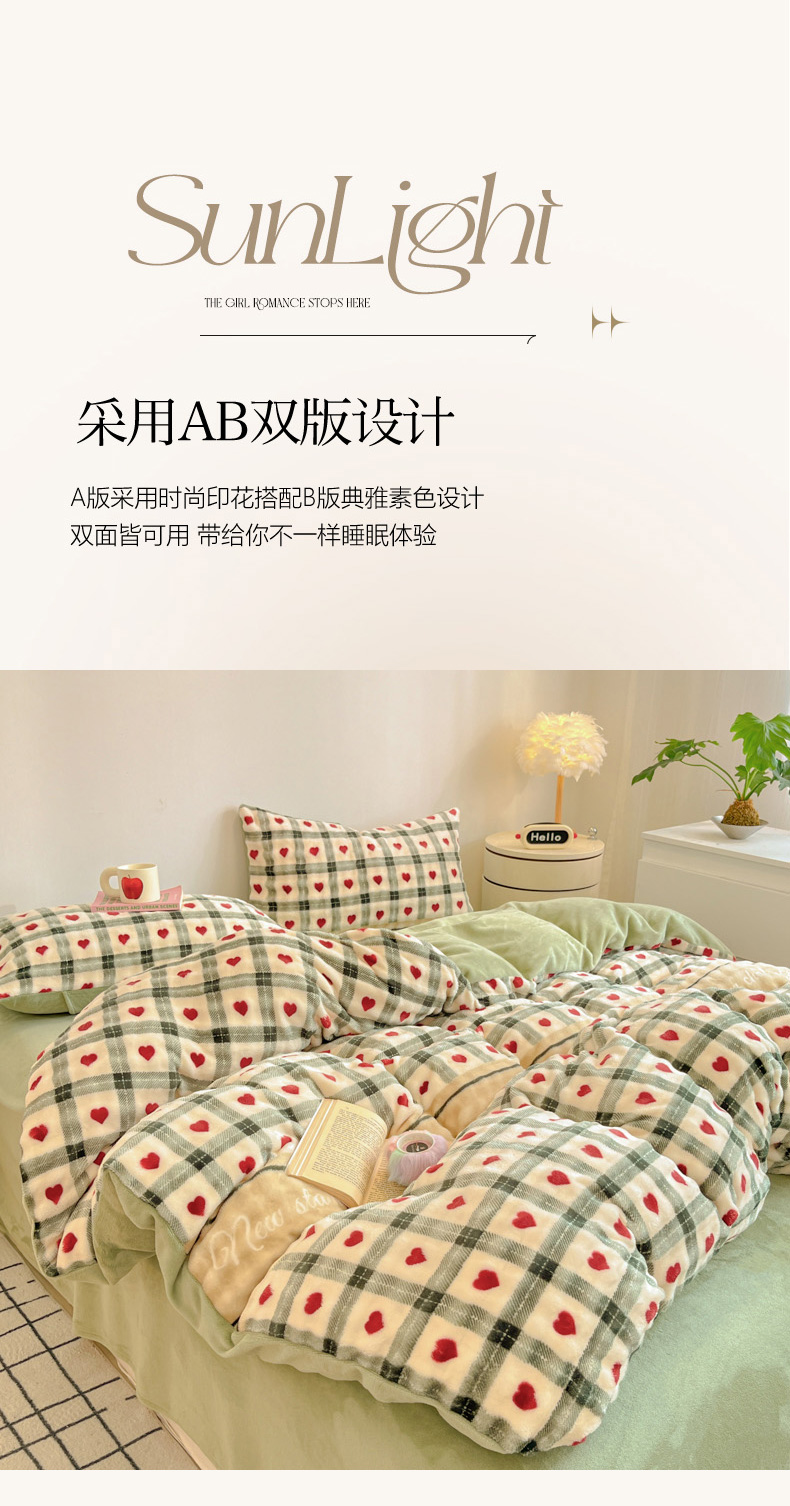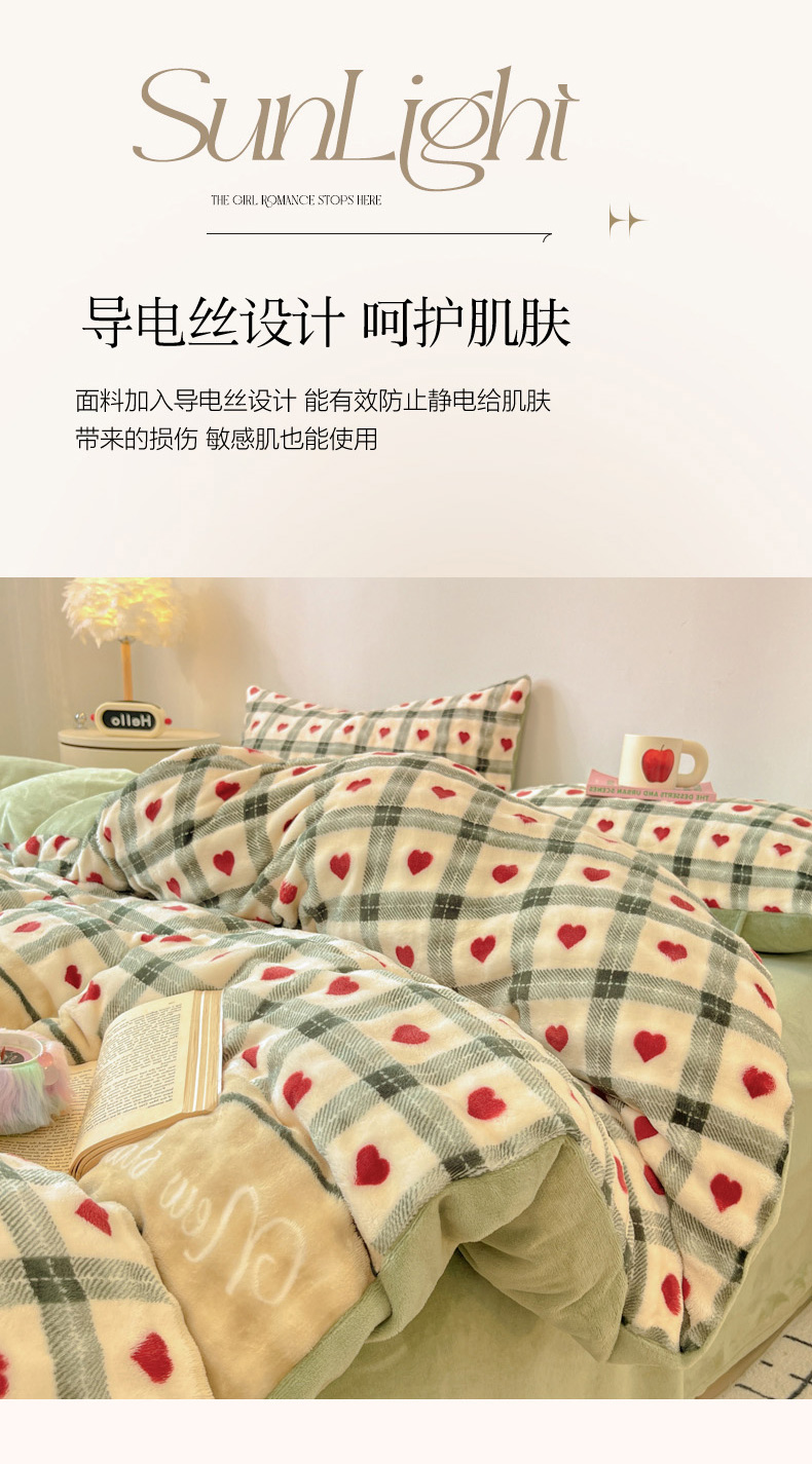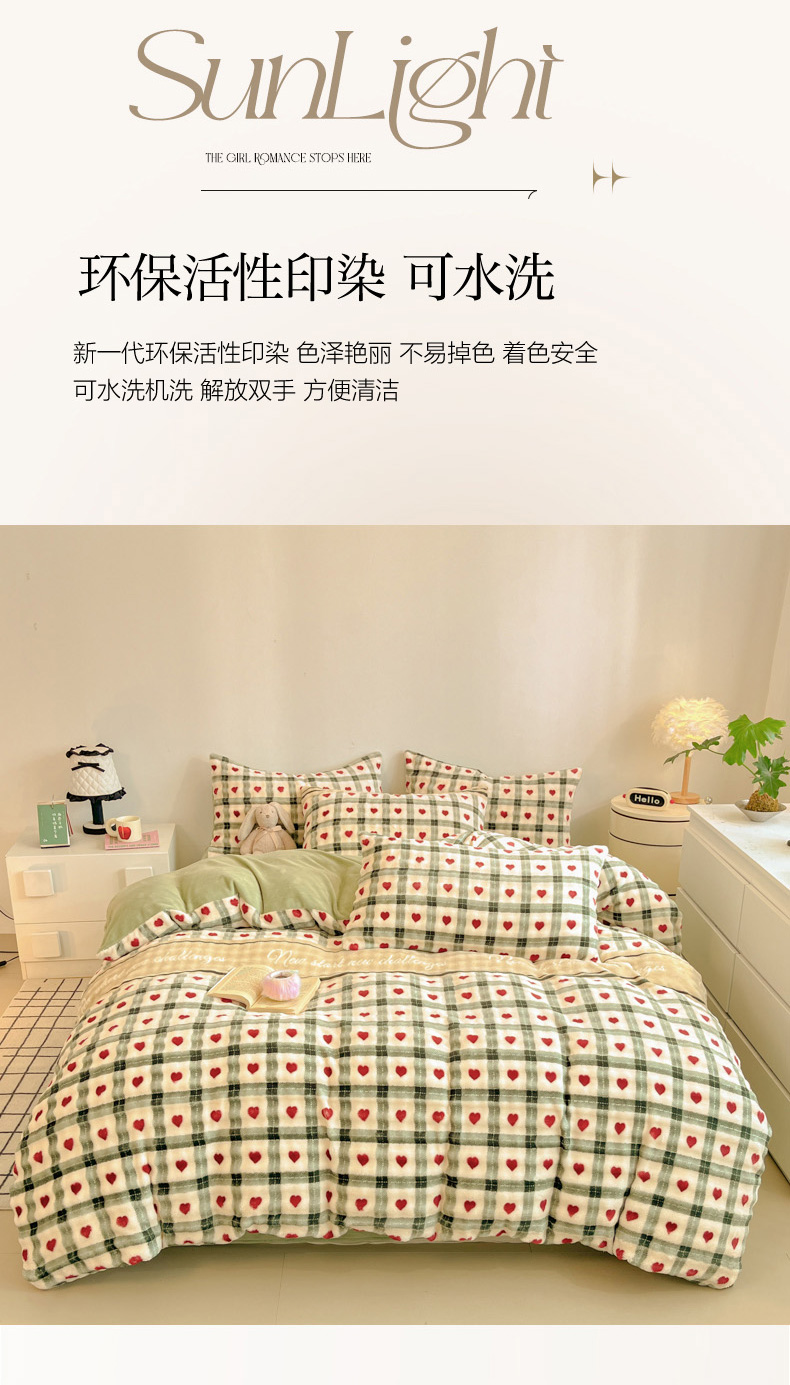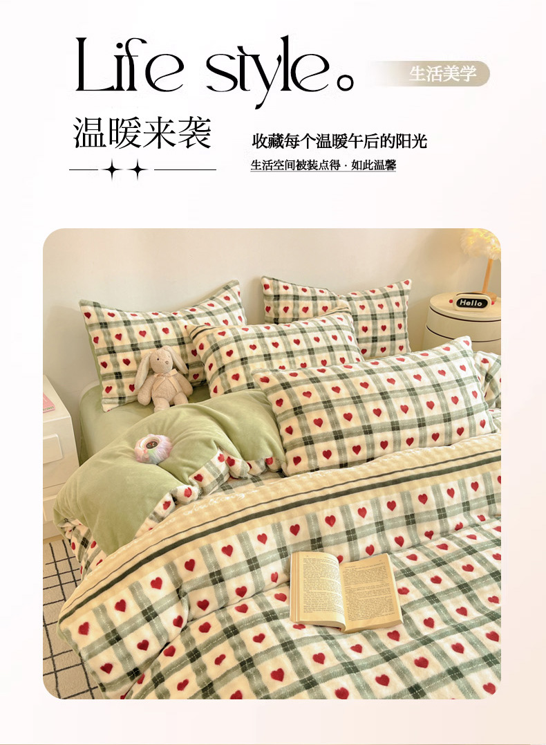 柒月家居 2025新款时尚印花泡泡绒加厚保暖四件套套件 格格红心