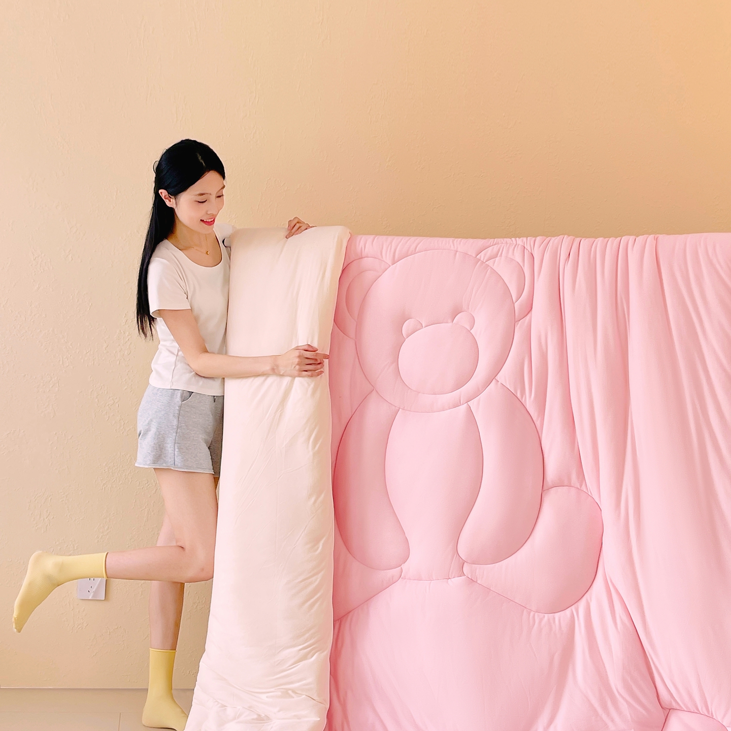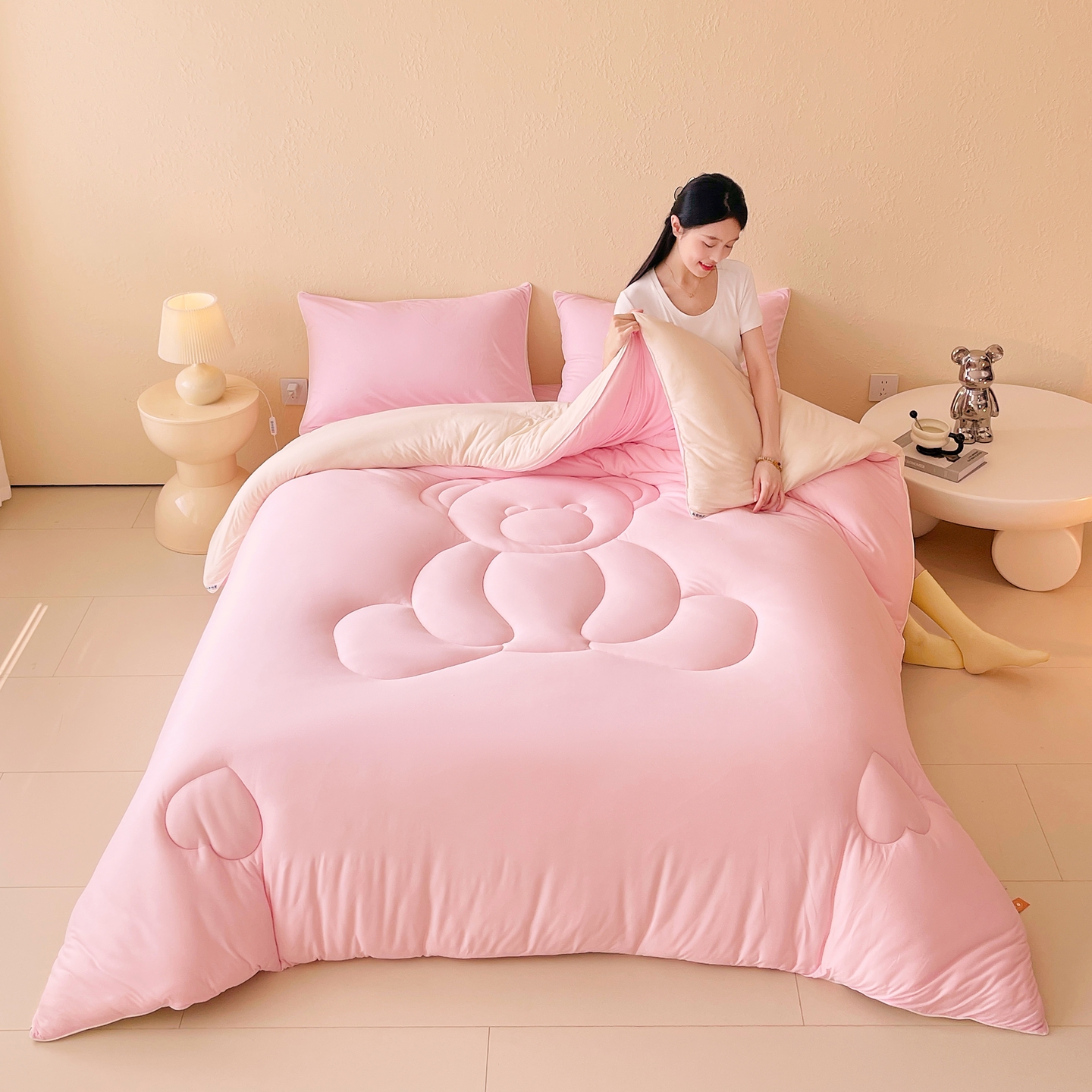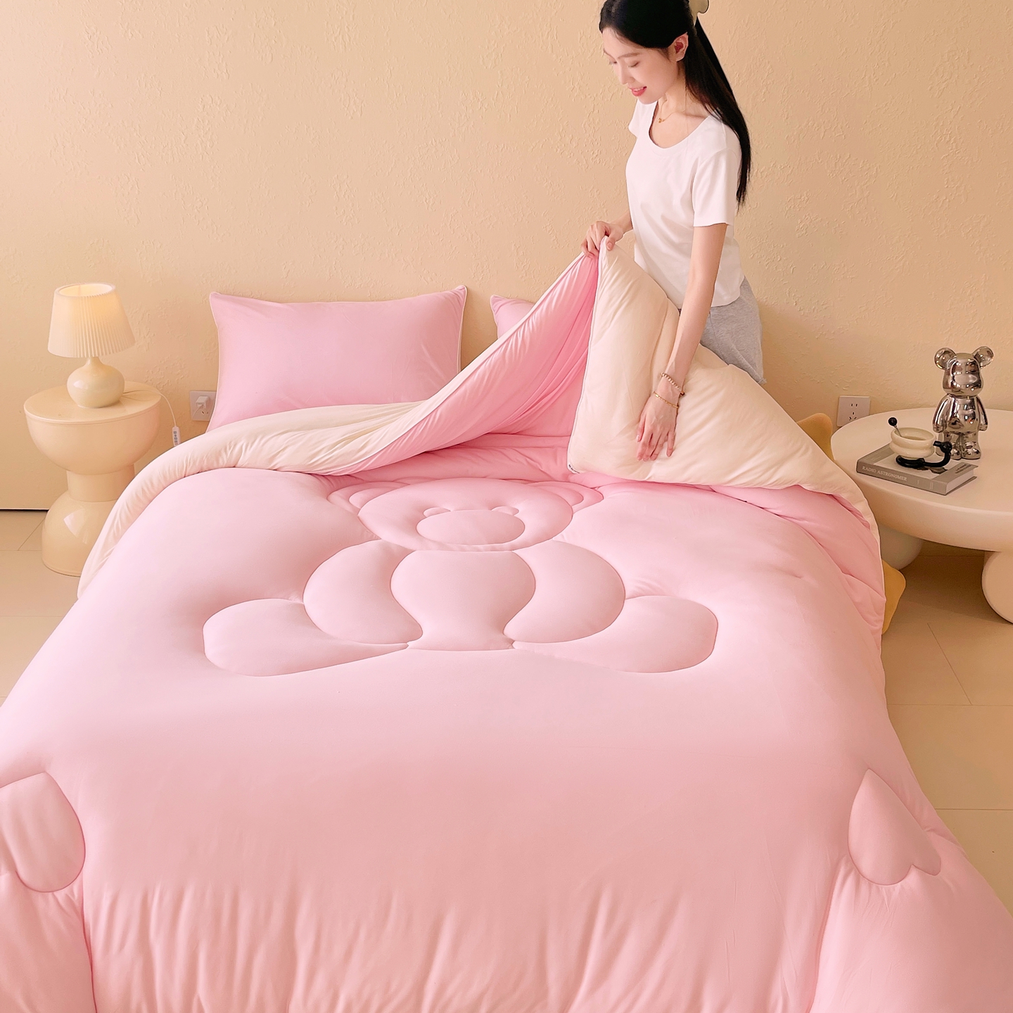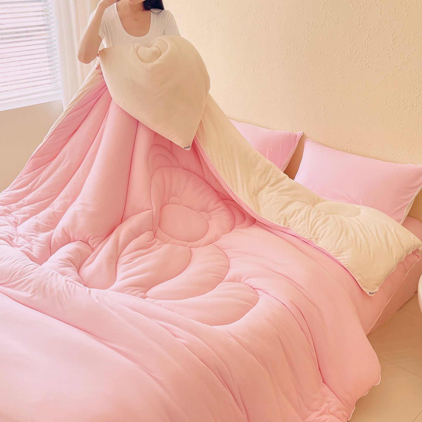 (总)色鬼布艺高端家居主号 2025新款针织云朵冬被软萌小熊被,粉色,黄色