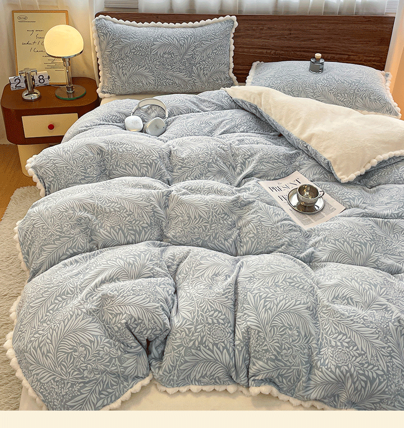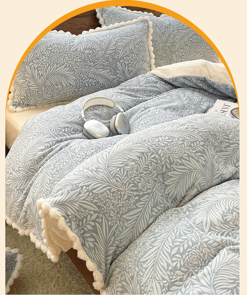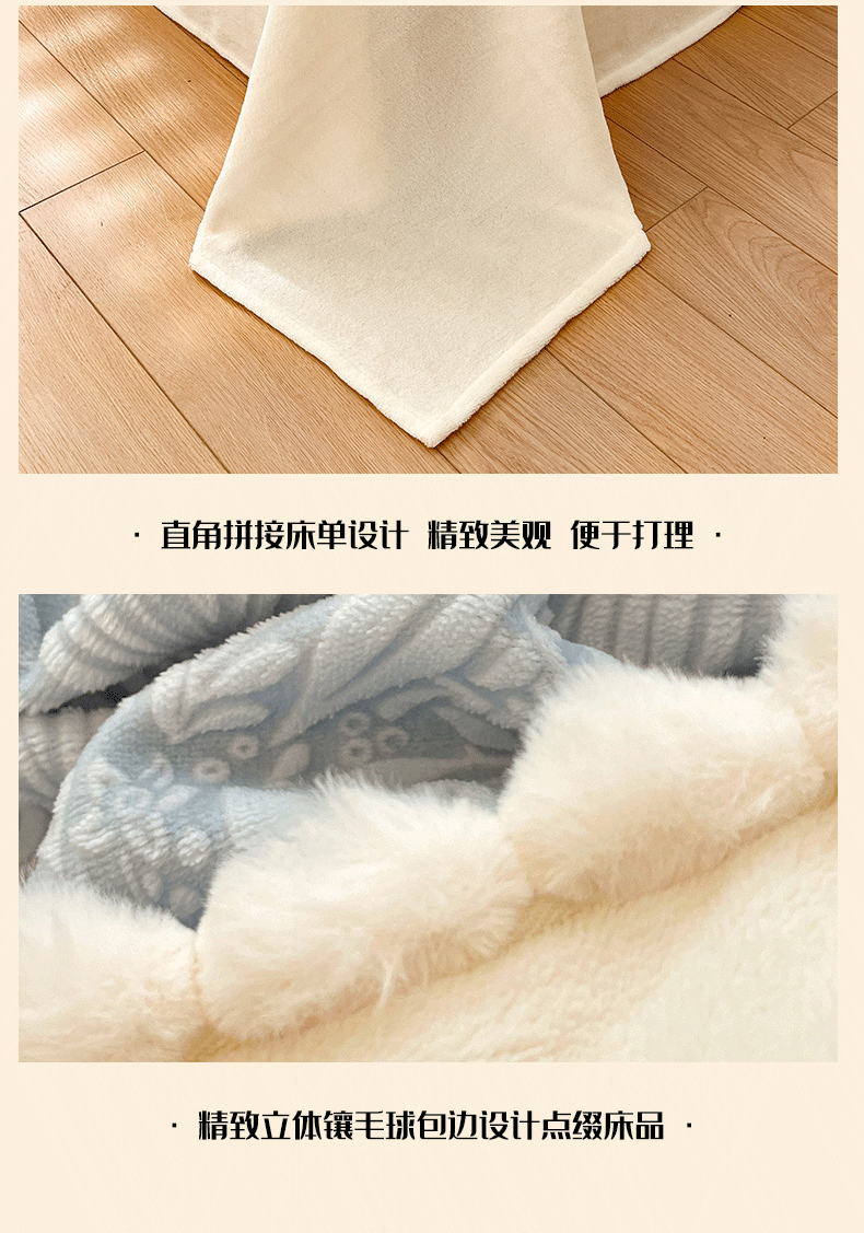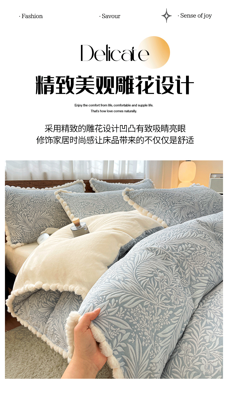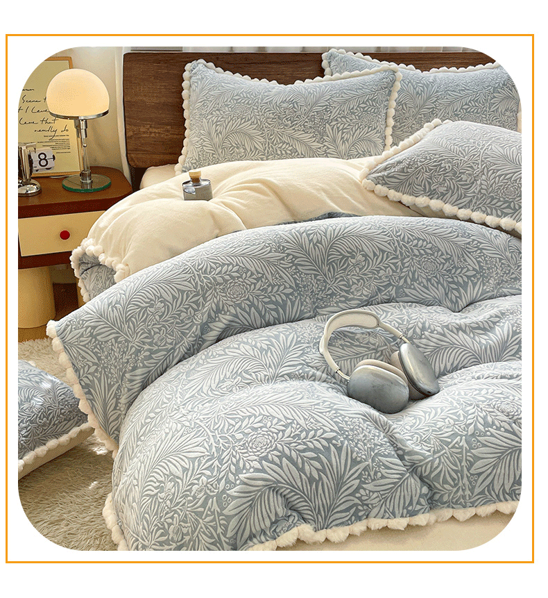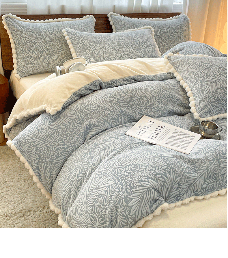 商品名称:羚羊语家纺 2025新款230克全消光雕花绒牛奶绒兔毛球四件套轻奢风立体着色烂花牛奶绒提花加厚保暖床单床笠三件套 蜜绒绒-海盐蓝