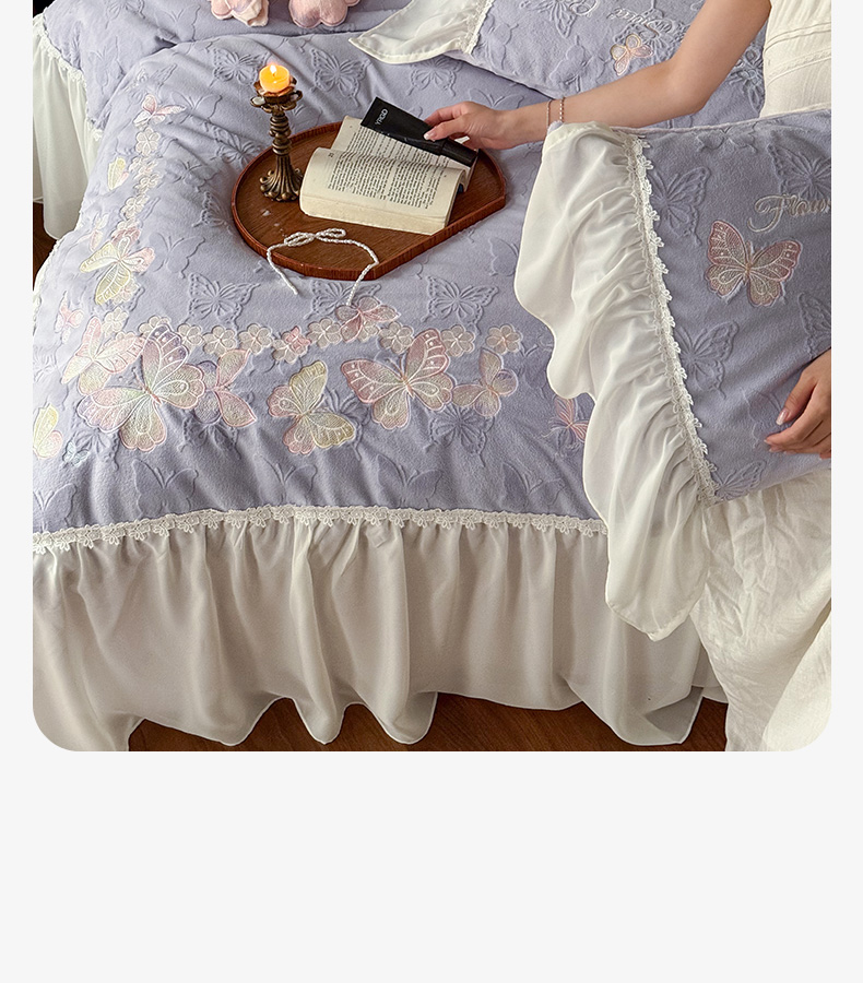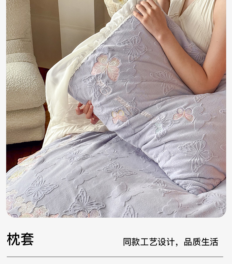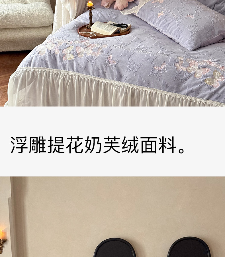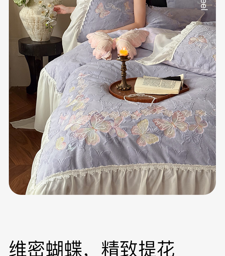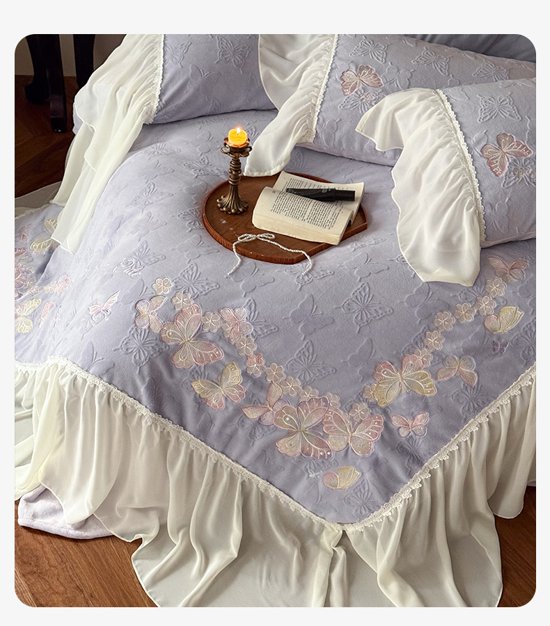 商品名称:卡姿家纺 2025秋冬德国奶芙绒提花雪纺花边— 维密蝴蝶 维密蝴蝶-紫