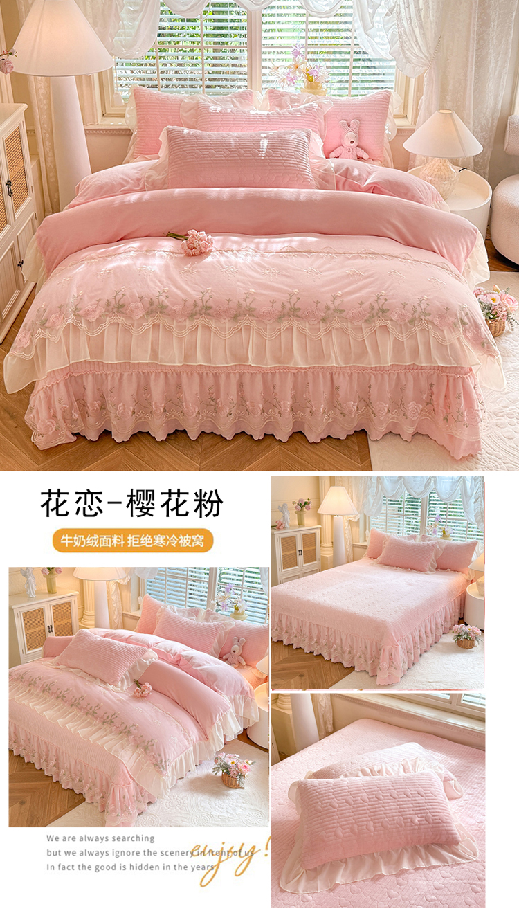 2025秋冬新款11斤重法式公主风全消光牛奶绒床盖四件套纯色蕾丝花边刺绣蕾丝床裙款床盖款--花韵系列 花韵-樱花粉