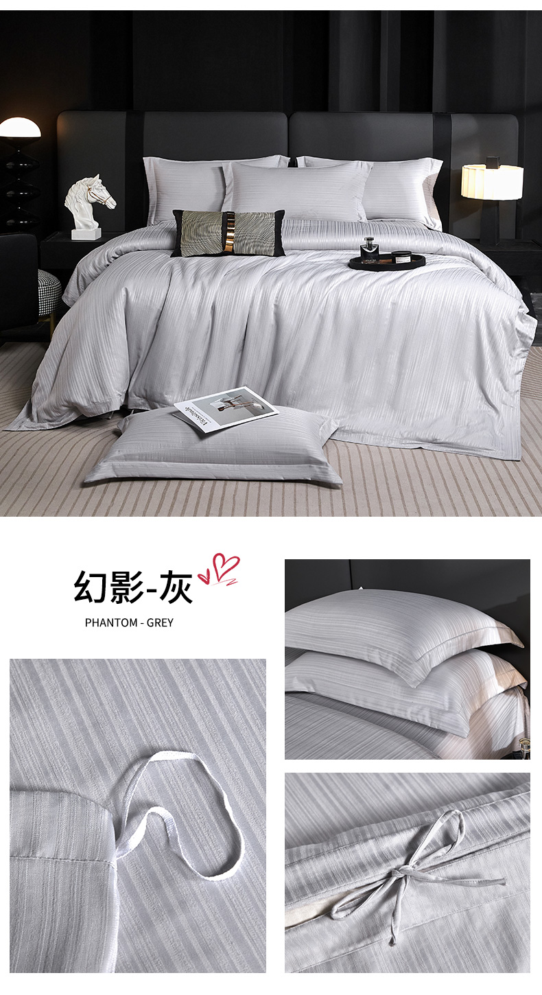 当前位置: 91家纺网 > 商品网购 > 床品套件 > 四件套 > 其它四件套 > 乐卧家居 2026新款轻奢高级酒店宾馆高档线条感提花纹样系带款四件套-幻影 幻影-灰
