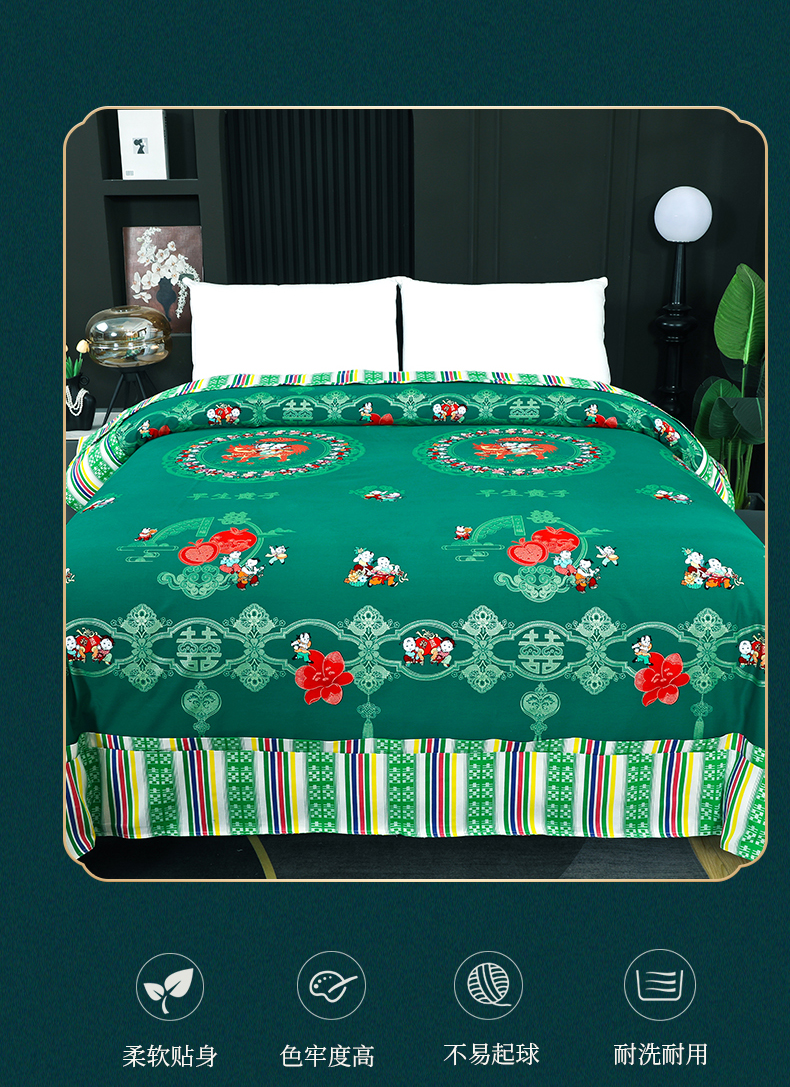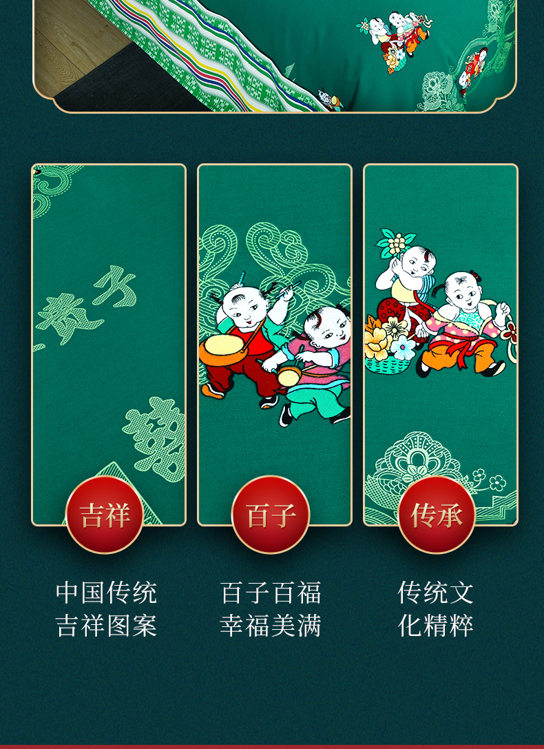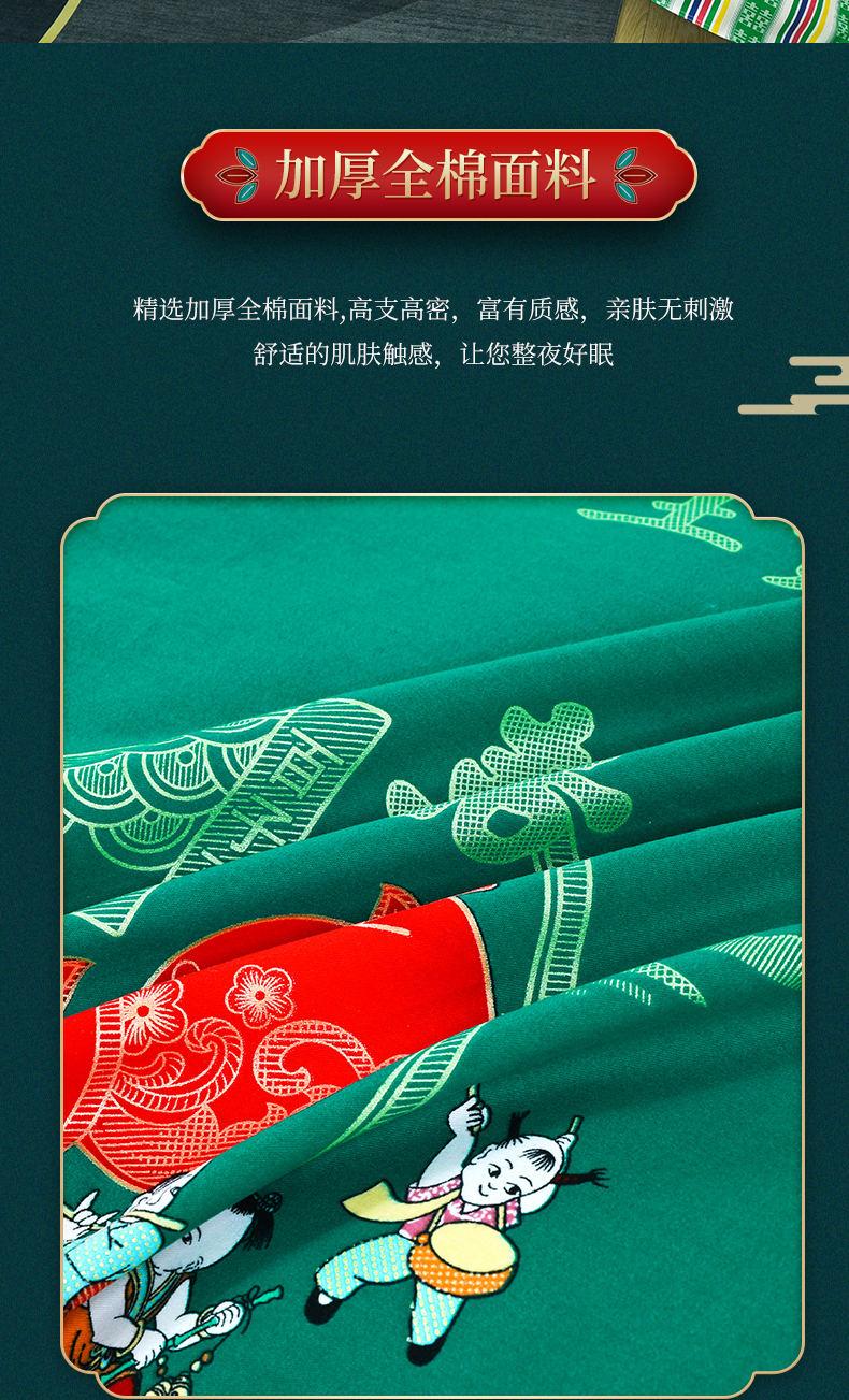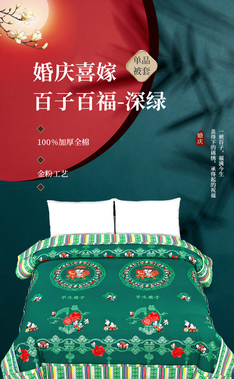 床上用品 > 被套 > 浩情国际婚庆供货中心 2026新款高端婚庆经典结婚被单龙凤百子被套老粗布100%全棉纯棉大红长期供货 百子百福-深绿