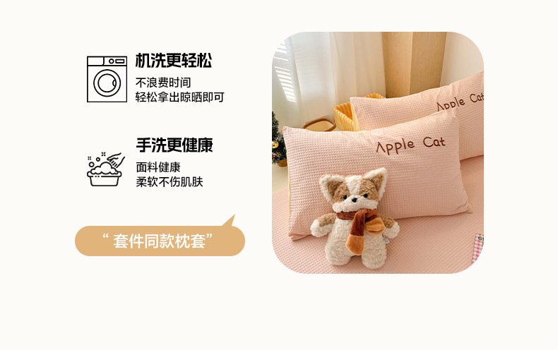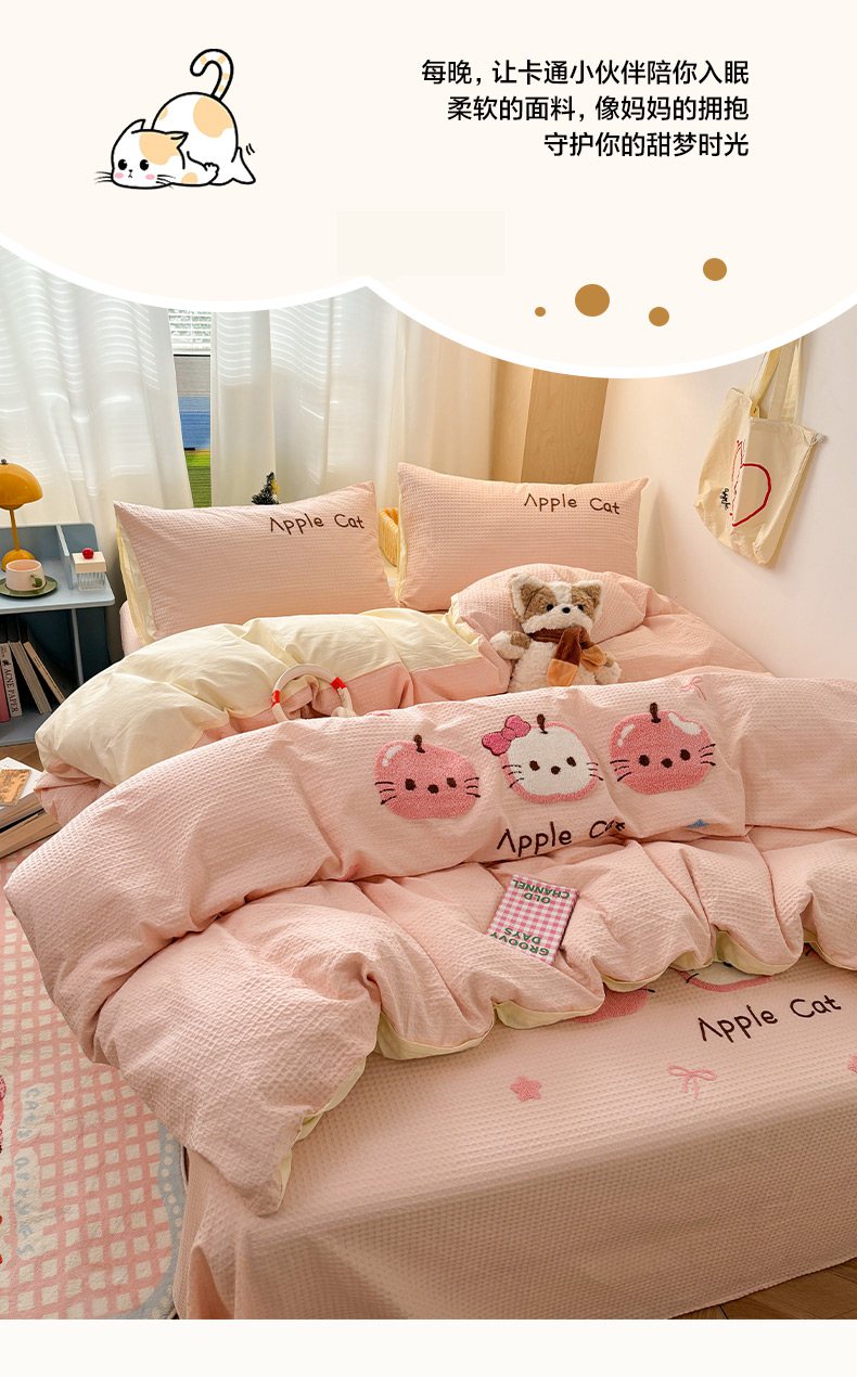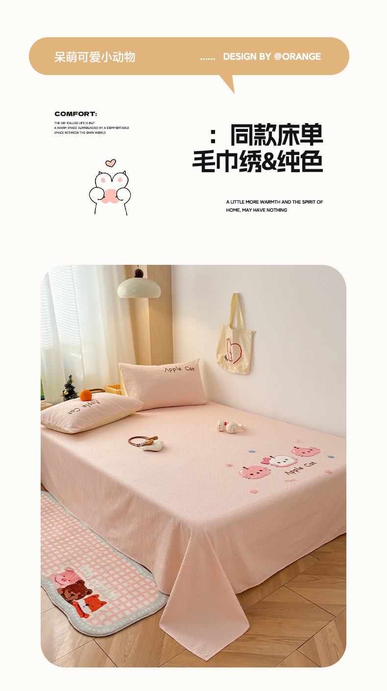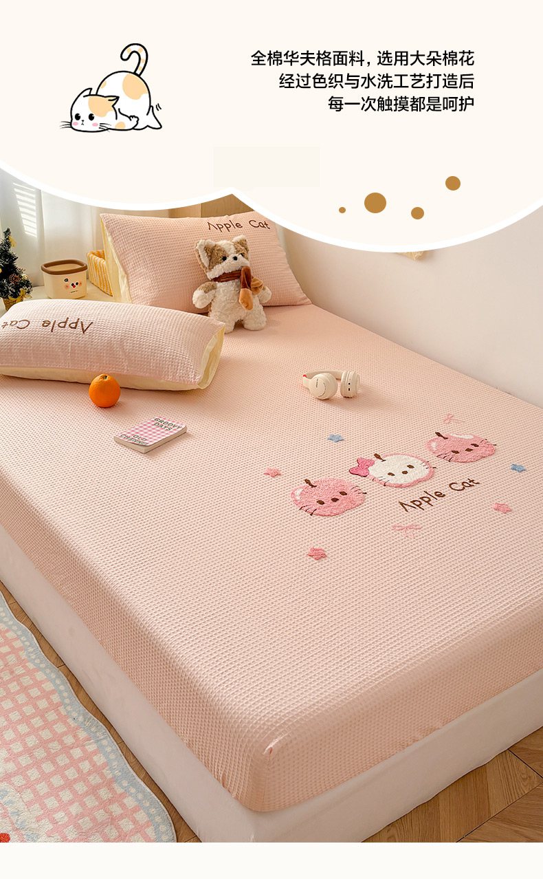 当前位置: 91家纺网 > 商品网购 > 床品套件 > 四件套 > 全棉普通四件套 > 雅居纺家纺 2026新款全棉华夫格毛巾绣单品系列 粉色苹果猫