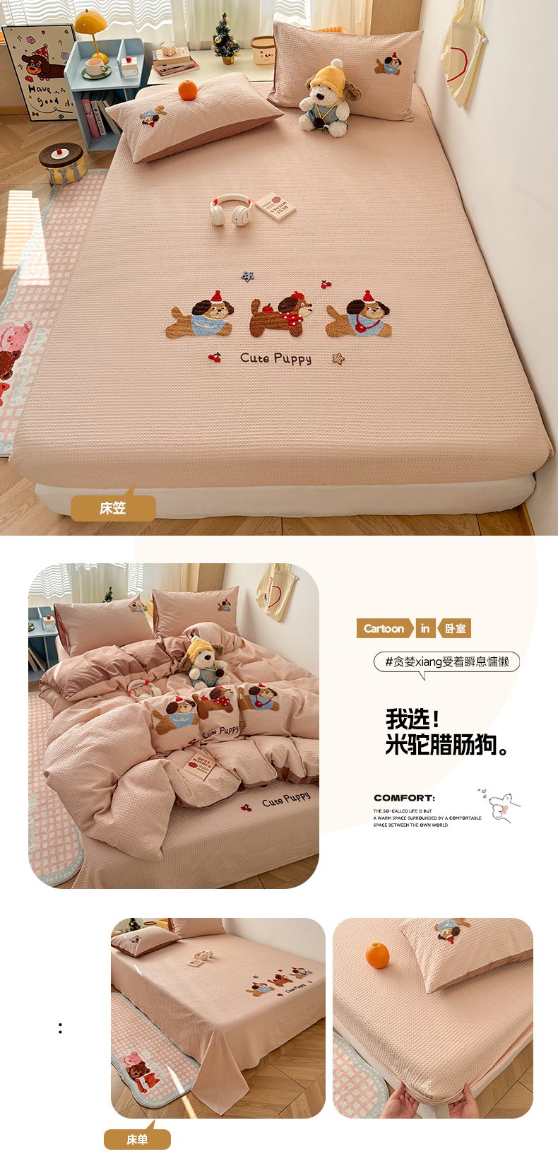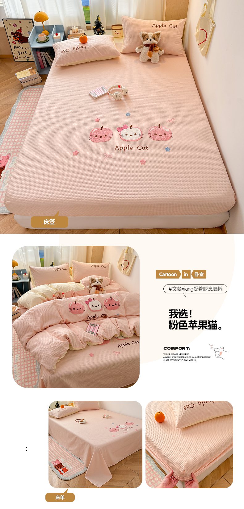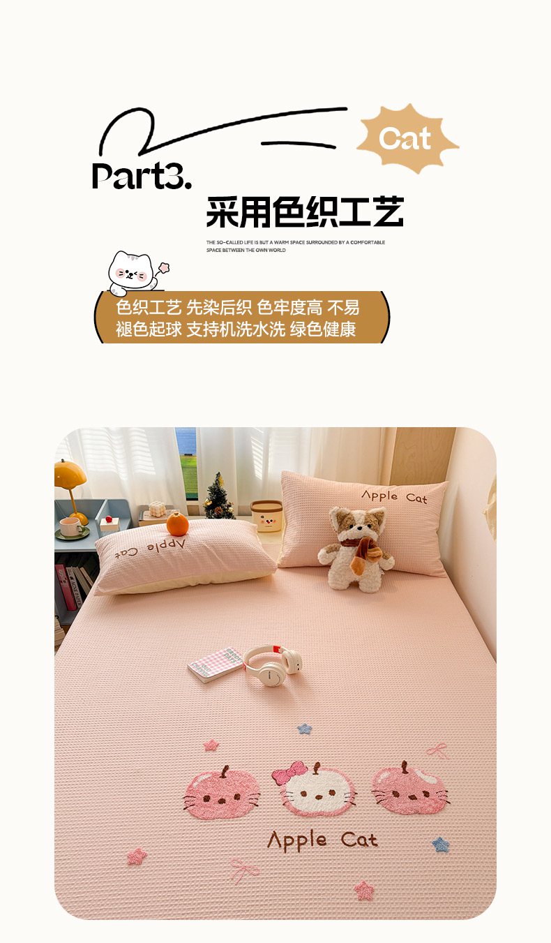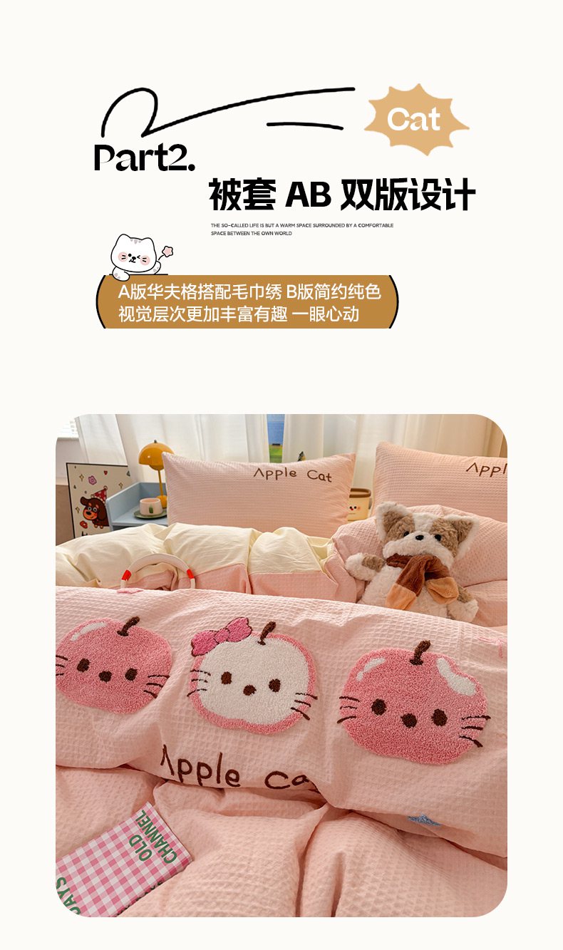 当前位置: 91家纺网 > 商品网购 > 床品套件 > 四件套 > 全棉普通四件套 > 雅居纺家纺 2026新款全棉华夫格毛巾绣单品系列 粉色苹果猫