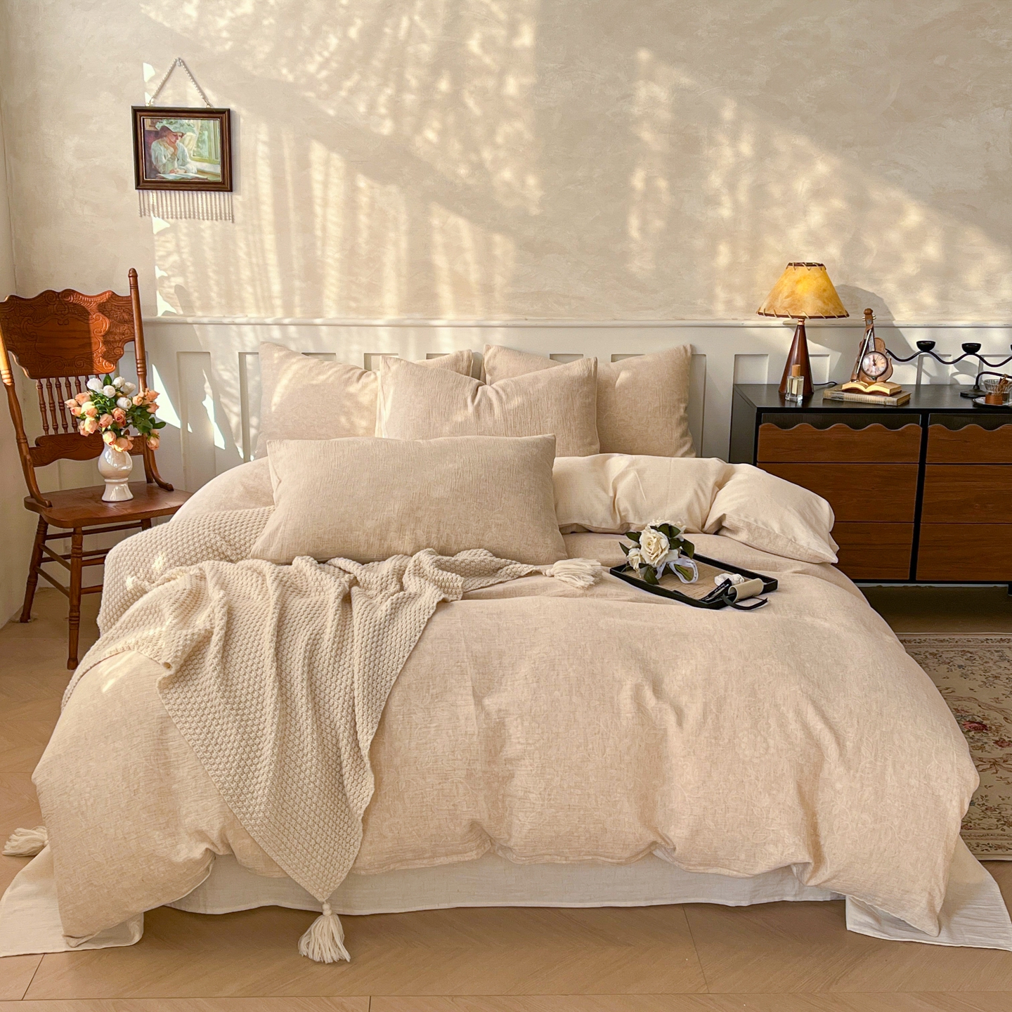 当前位置: 91家纺网 > 商品网购 > 床品套件 > 四件套 > 全棉普通四件套 > 金丝鸟家纺 2026春夏新款全棉纯棉棉麻提花四件套 玫瑰