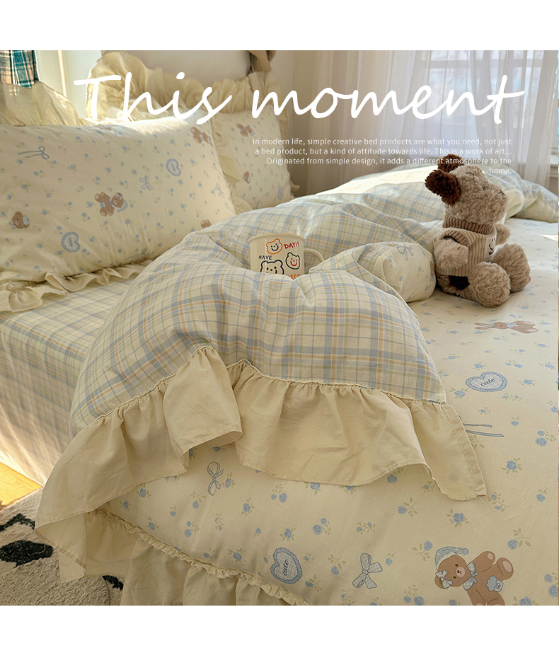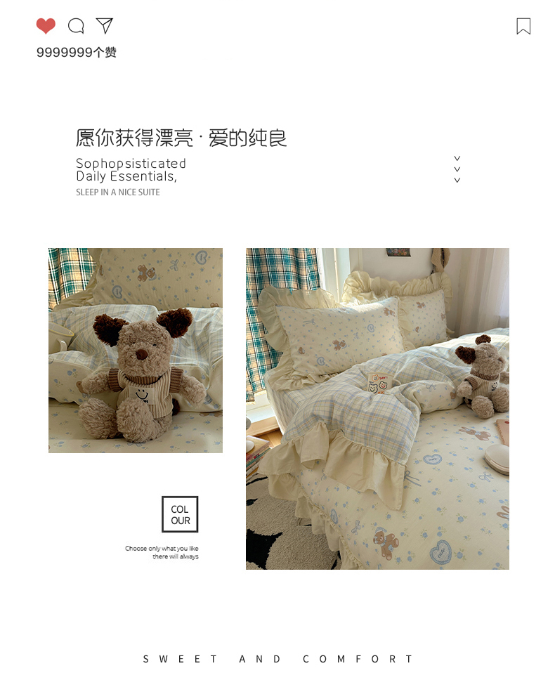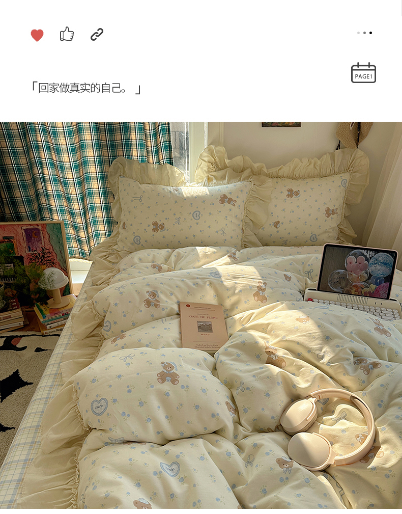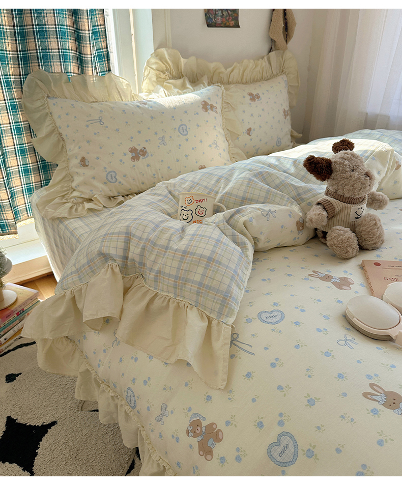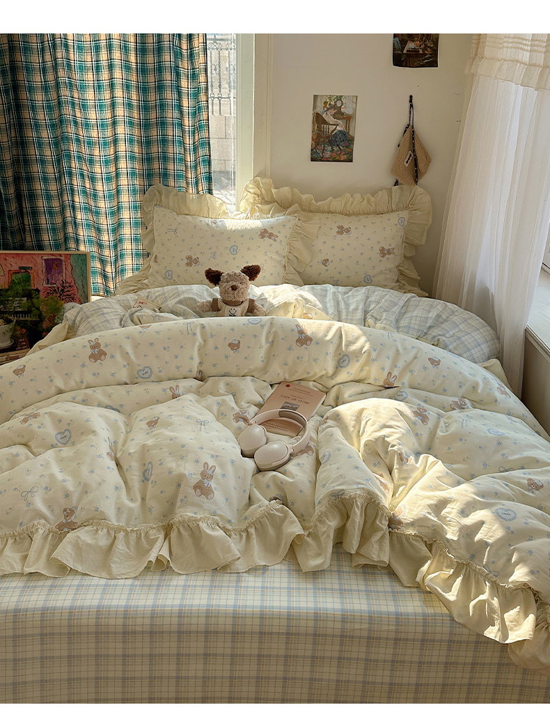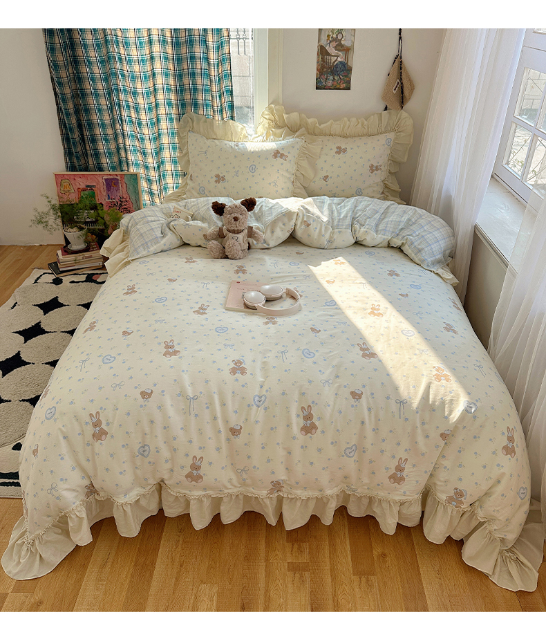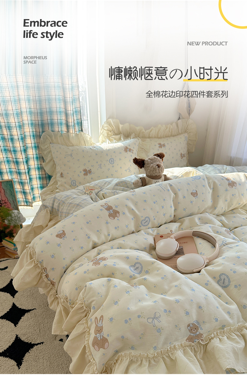 当前位置: 91家纺网 > 商品网购 > 床品套件 > 四件套 > 全棉普通四件套 > 瑞莱 2026春夏新款全棉纯棉印花韩系卡通花边四件套 爱心兔兔