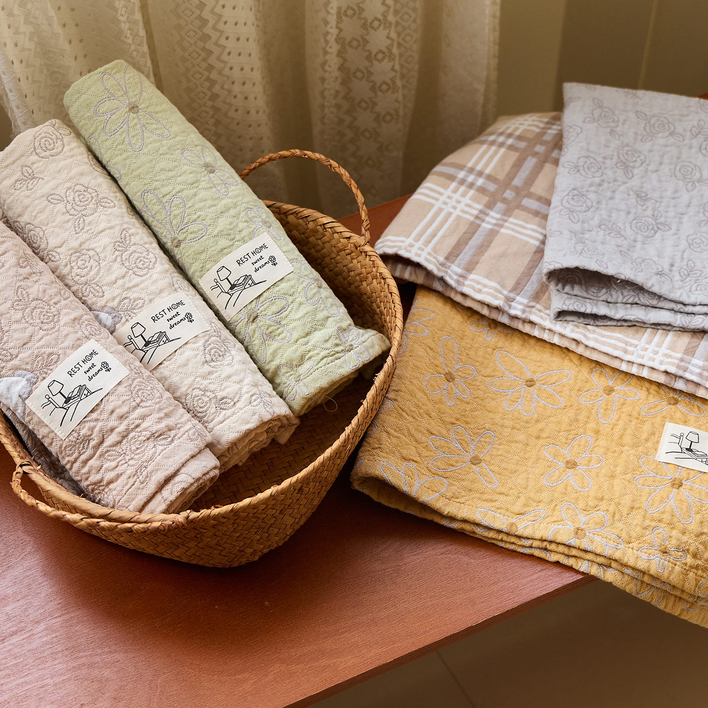 (总)沐瑟家纺 2025新款简约风多功能纱布盖毯纱布毯子毛巾被床盖沙发巾单毯枕巾枕套三件套,H本色,H橙色,H咖色,大马士革本色