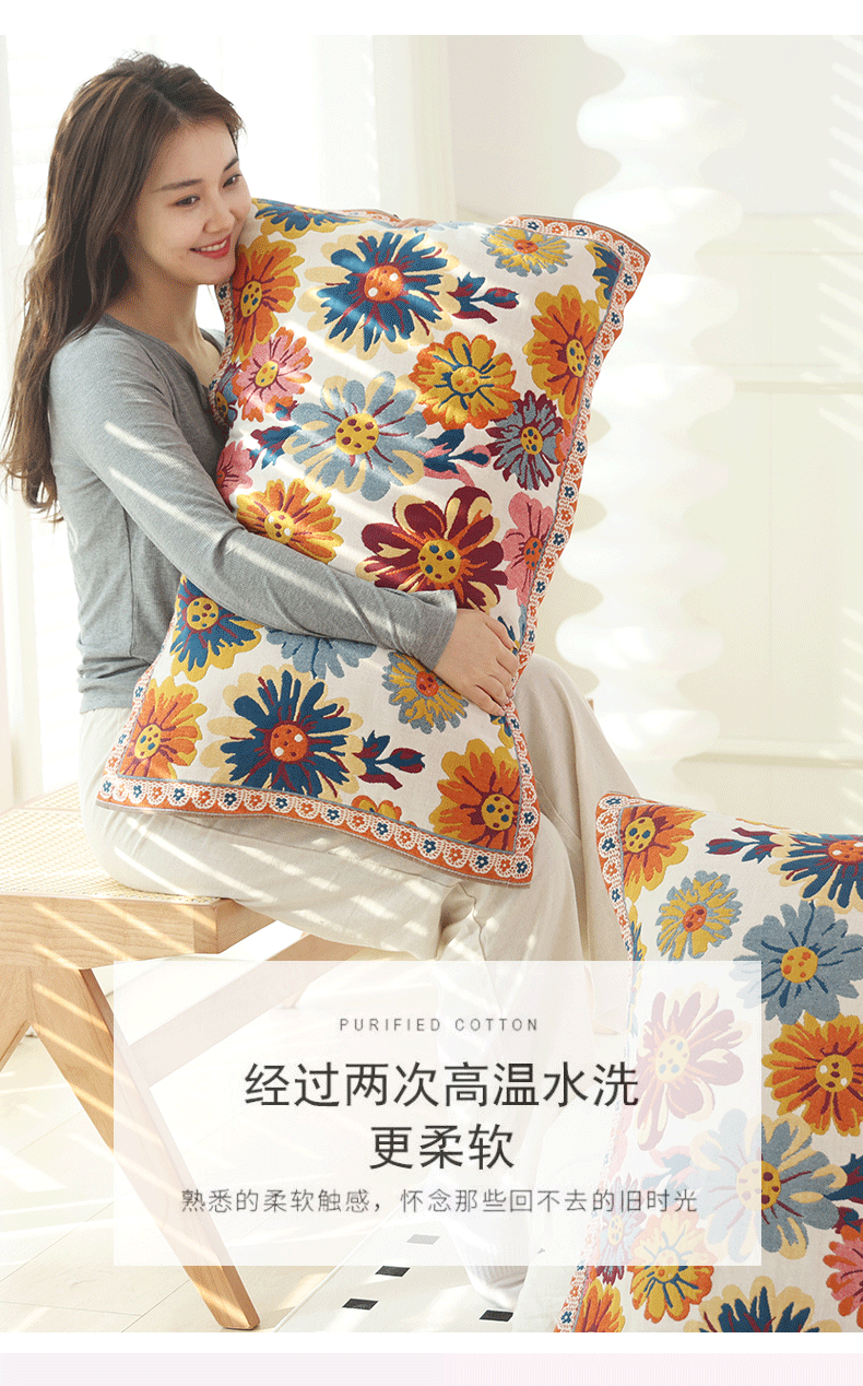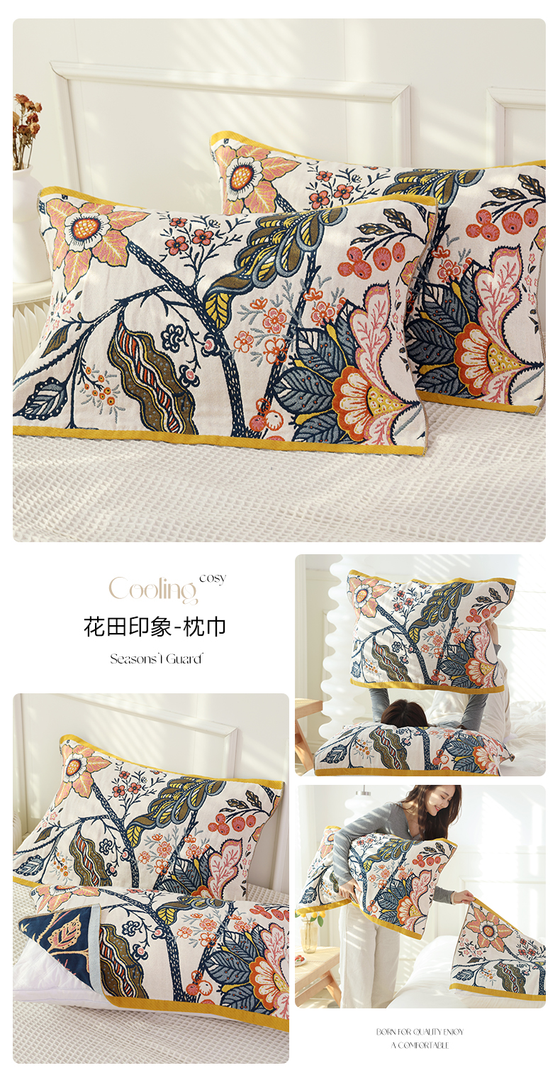 • 91家纺网 家纺一手货源 找家纺 朴尔家纺-毛巾被 2026新款彩棉国潮风全棉纯棉六层纱布枕巾 花田印象-枕巾 52x78cm枕巾一对